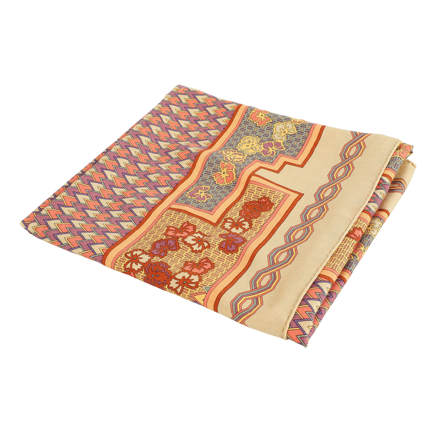 by Catherine Baschet, Entwurf erstmals erschienen 1985. 65% Kaschmir und 35% Seide. Indischer Mustermix in Multicolor. 140 x 140 cm. Handrollierte Säume. Tragespuren vorhanden.