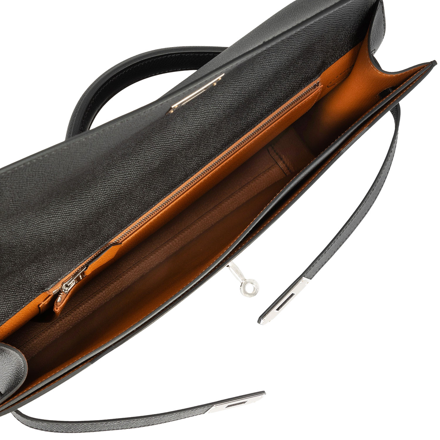 Koll. 2024. Sonderanfertigung mit Hufeisen-Prägung. Epsom Leder in Noir (Schwarz). Silberfarbene Hardware mit Palladium Beschichtung. Innenfutter aus Chevre Mysore Leder in Hellbraun. Hauptfach mit klassischem Kelly-Verschluss. Hardware noch foliert, neuwertiger Zustand. Box, Staubbeutel und Rechnung anbei.