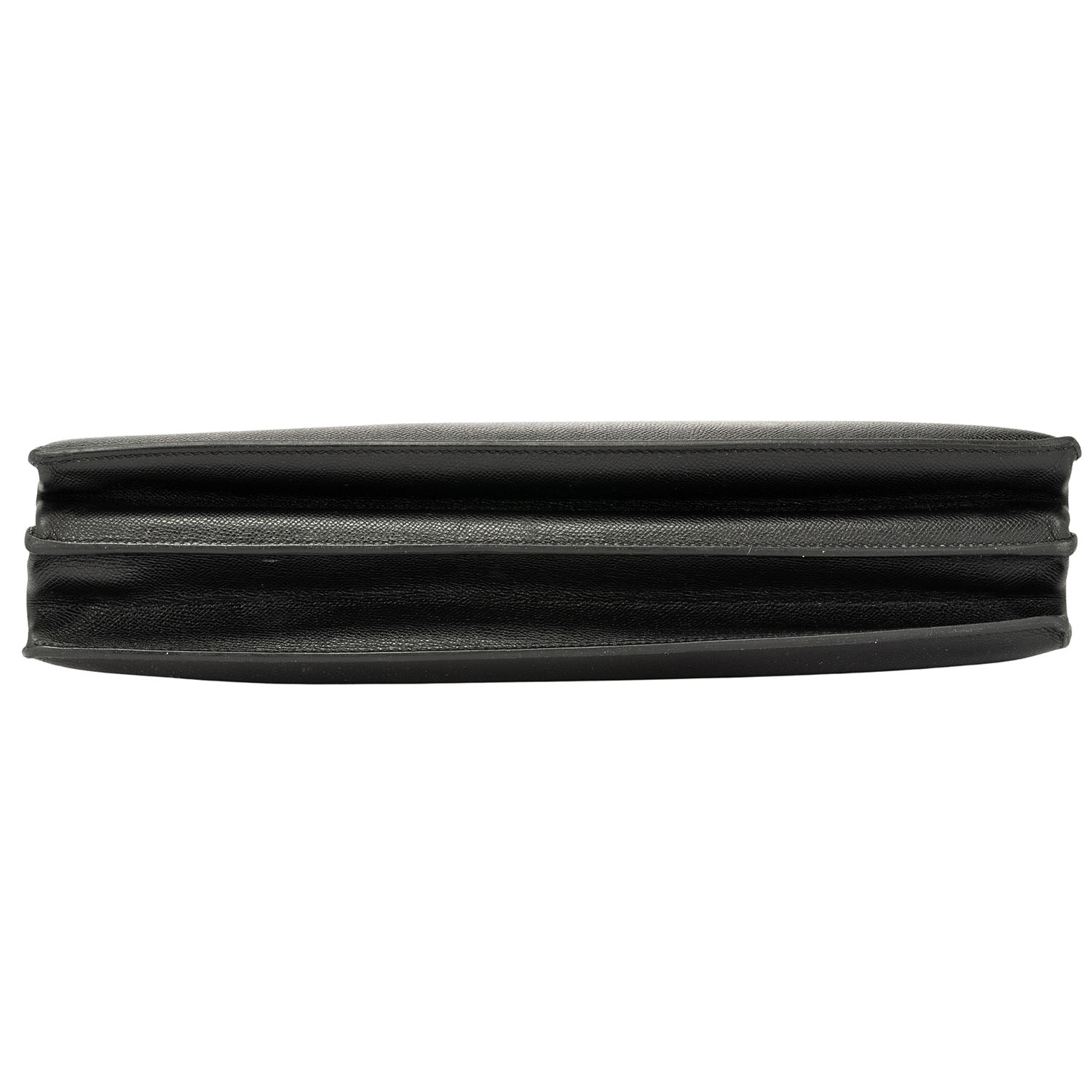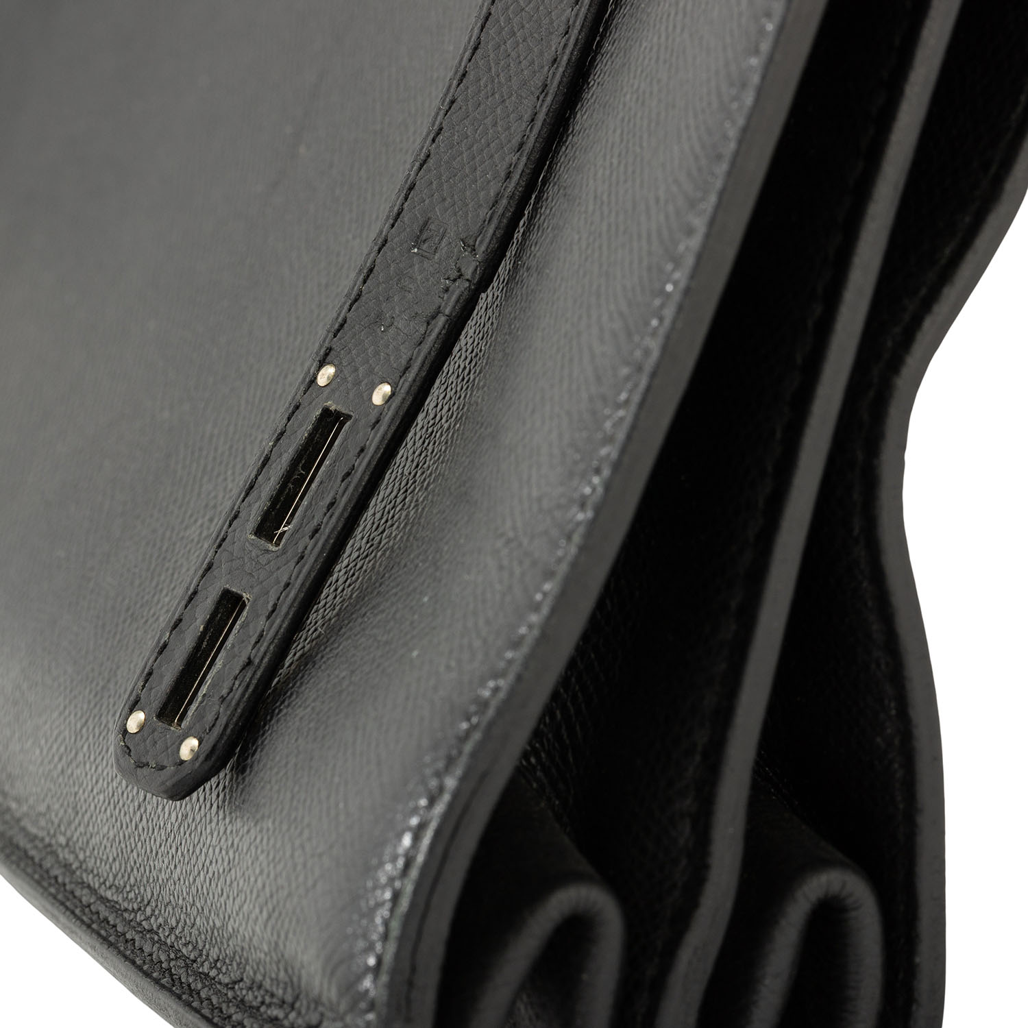 Epsom Leder in Schwarz mit palladierter Hardware, Riemenverschluss auf der Front und Henkel. Innenraum mit drei Abteilen. Spa-Rechnung anbei.