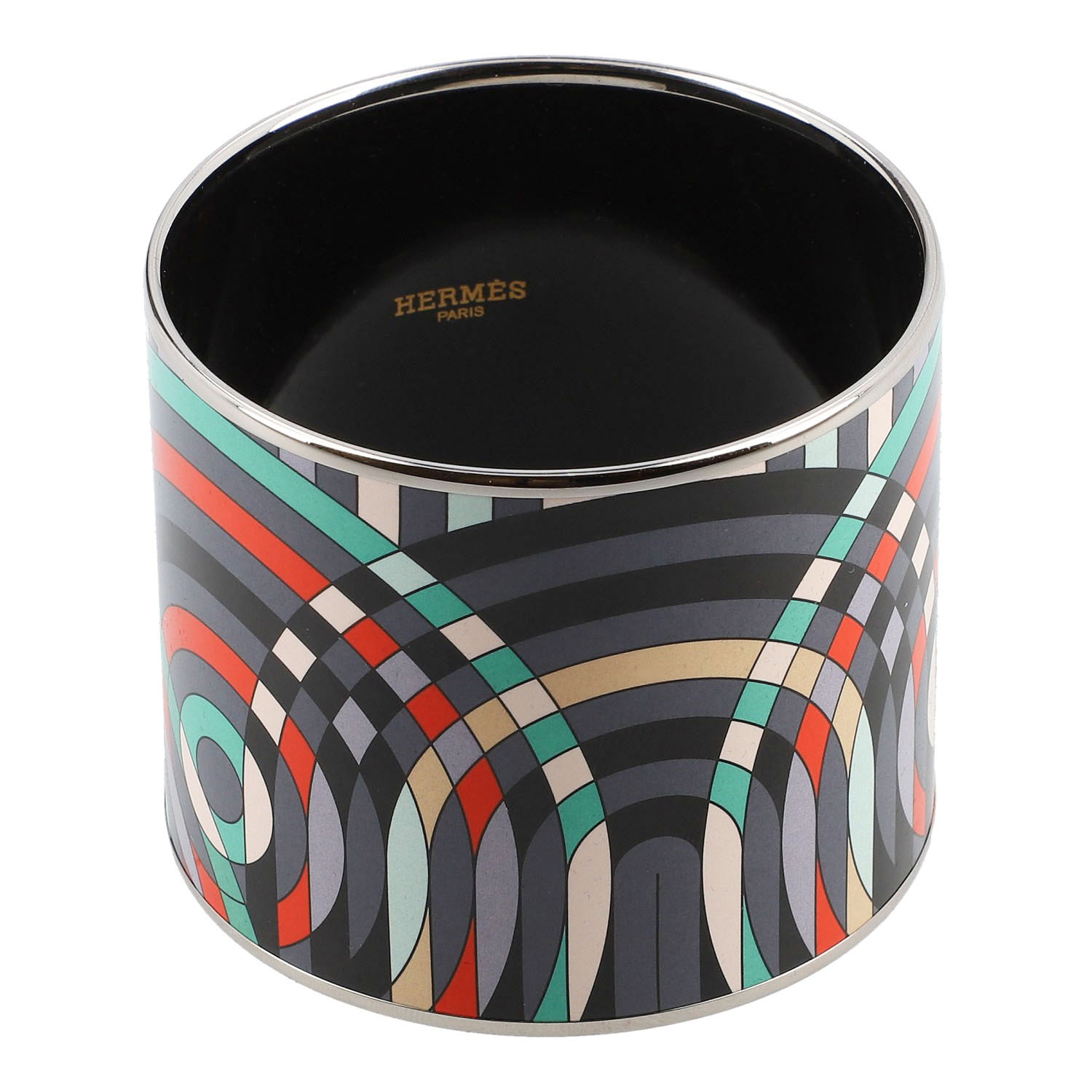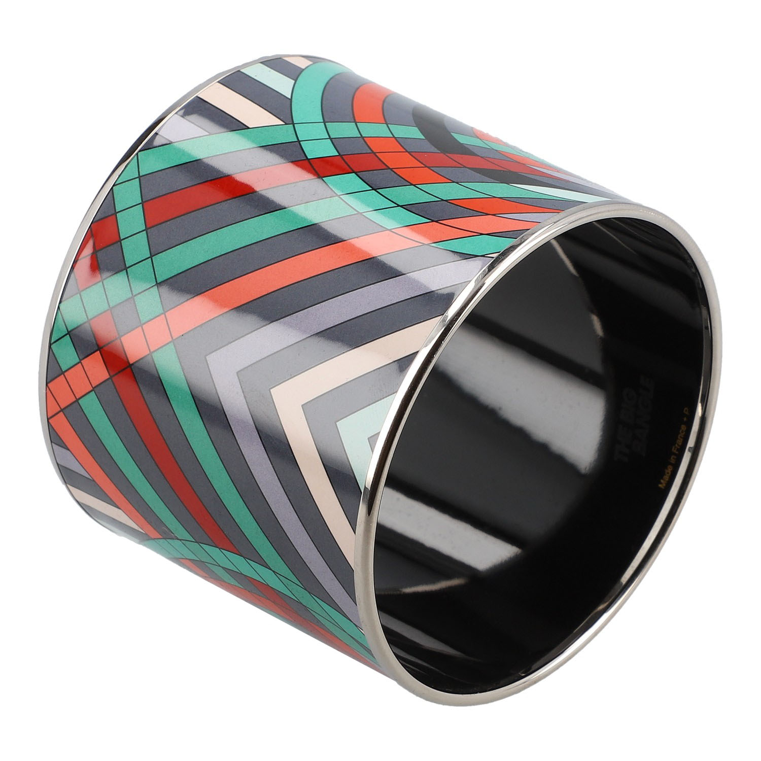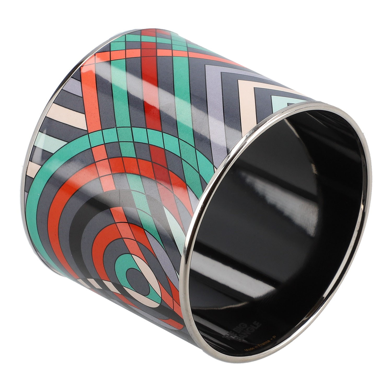 Silberfarbene Fassung mit emailliertem Einsatz in Dunkelgrau mit Musterung in Multicolor. Box und Staubbeutel anbei. Breite ca. 5,5cm, Durchmesser ca. 6,2cm. Guter Erhalt.