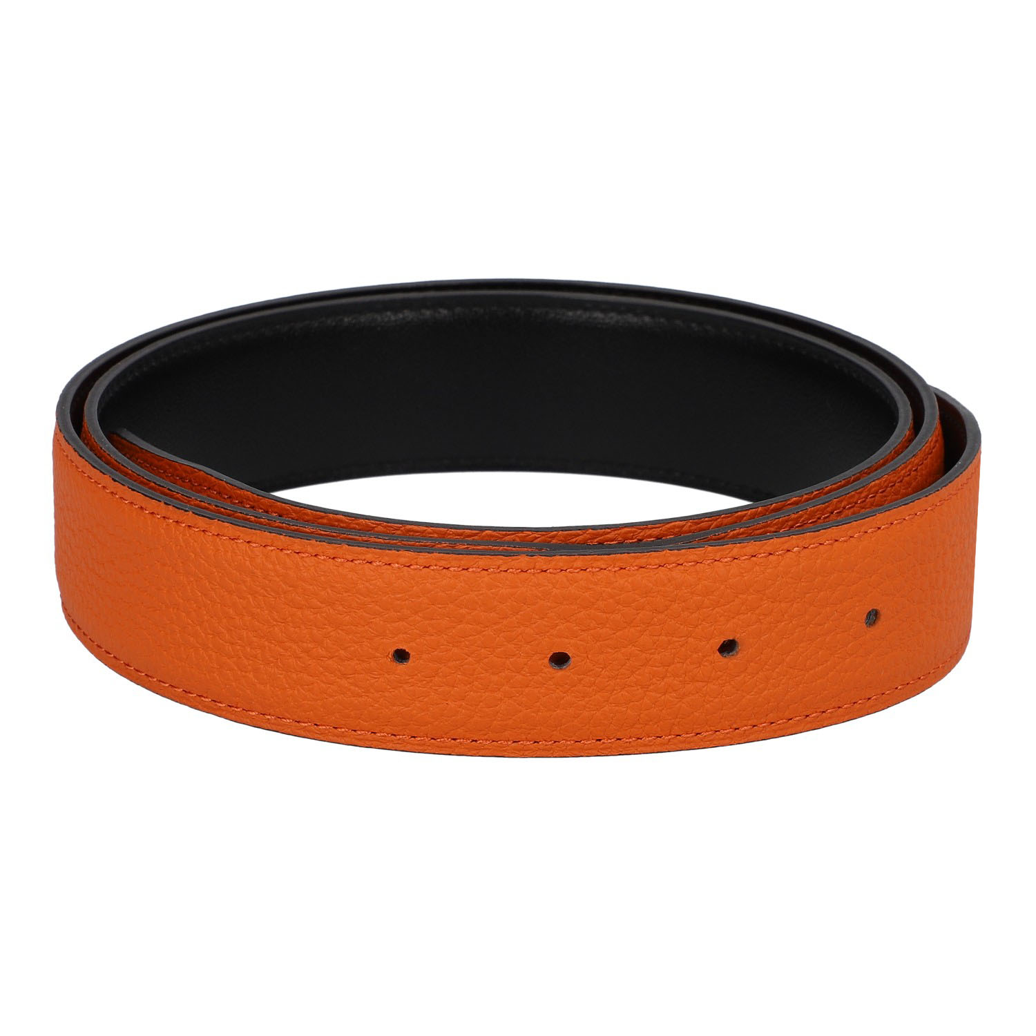 Aus Leder im klassischem Orange und Schwarz (Noir). Ein Gürtelloch wurde nachträglich hinzugefügt, sonst guter Erhalt. Breite ca. 32mm.