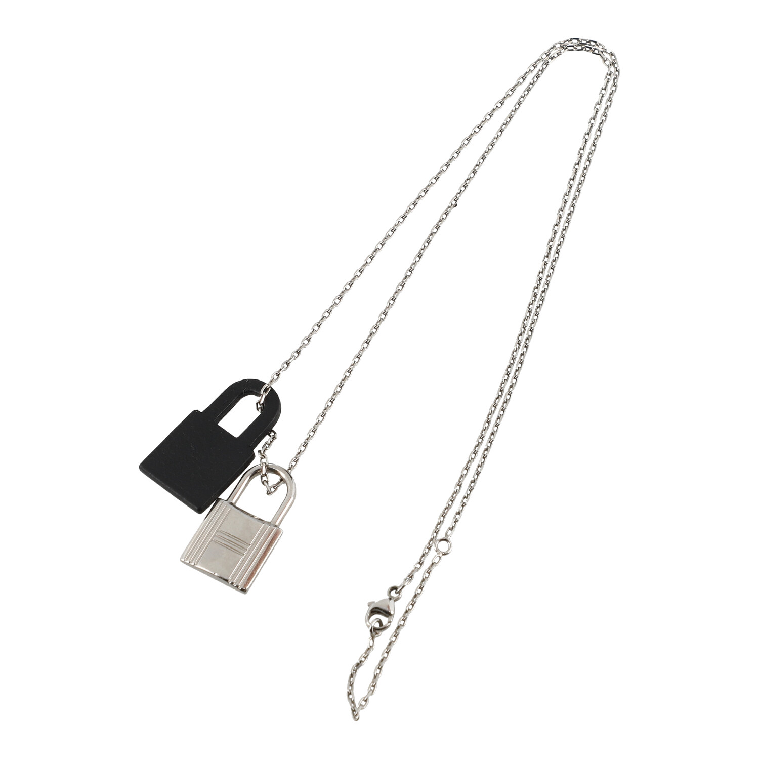 Modell nicht mehr erhältlich. Feine silberfarbene Gliederkette mit zwei Anhängern in Schlossform (1x Silberfarben, 1x aus Leder in Schwarz). Box anbei. Tragespuren vorhanden.