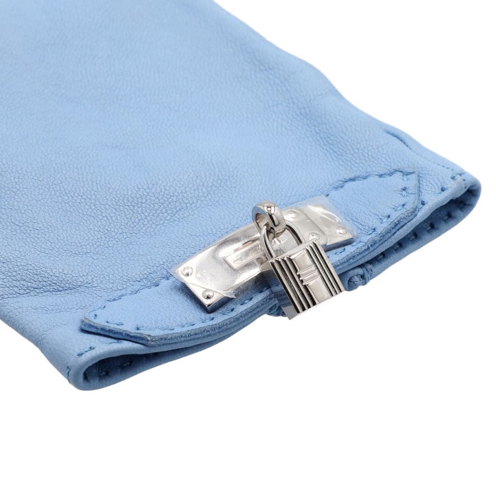 Feines Lammleder in Hellblau mit silberfarbenem Kelly-Verschluss Dekor. Leichte Tragespuren vorhanden.