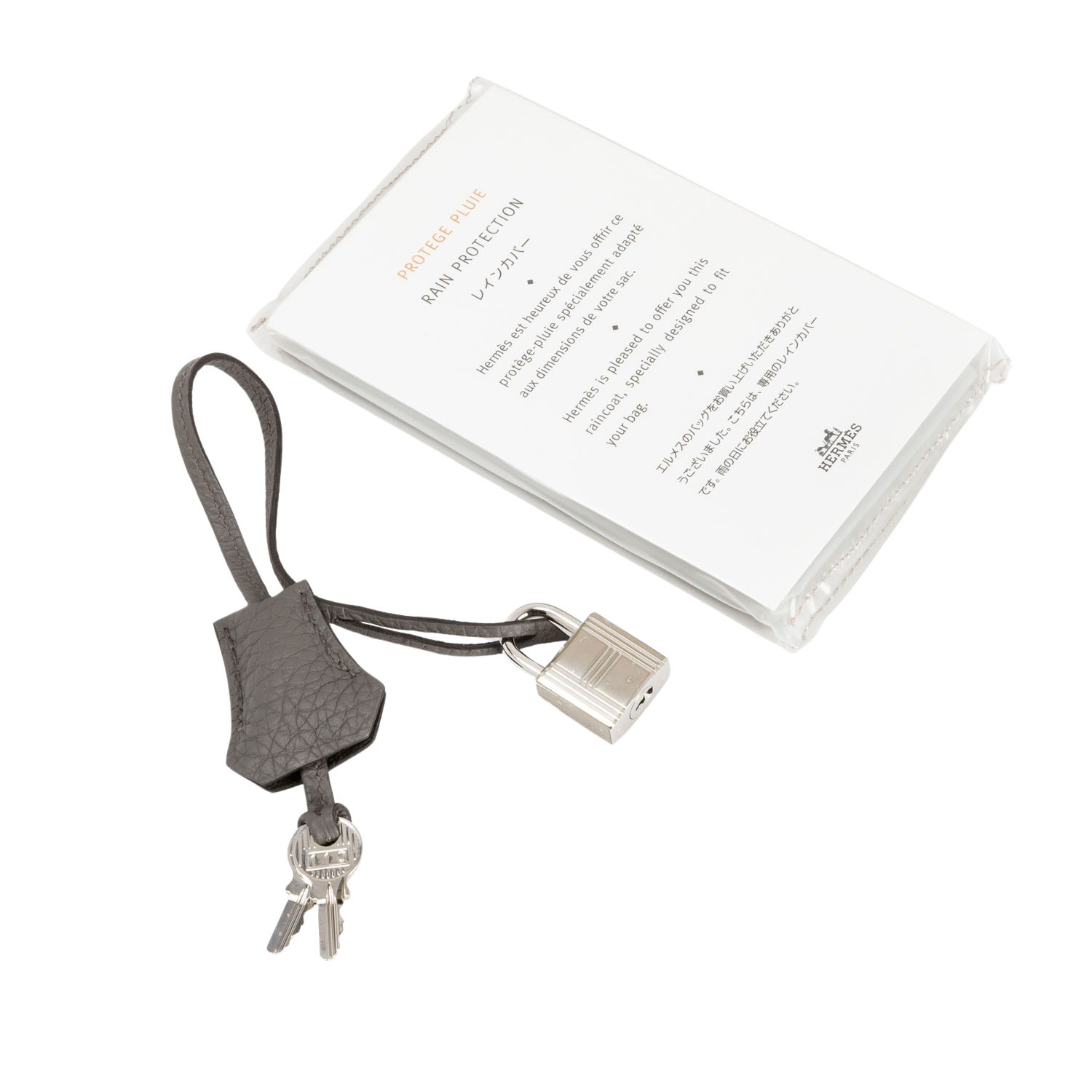 Koll. 2021. Togo-Leder im Farbton Gris Etain mit pallidierter Hardware, Doppelhenkeln und Riemenverschluss. Innenraum mit zwei Fächern, eines davon mit Reißverschluss. Box, Staubbeutel, Kopie der Rechnung, Clochette mit Schlüssel und Schloss anbei. Sehr guter Zustand.