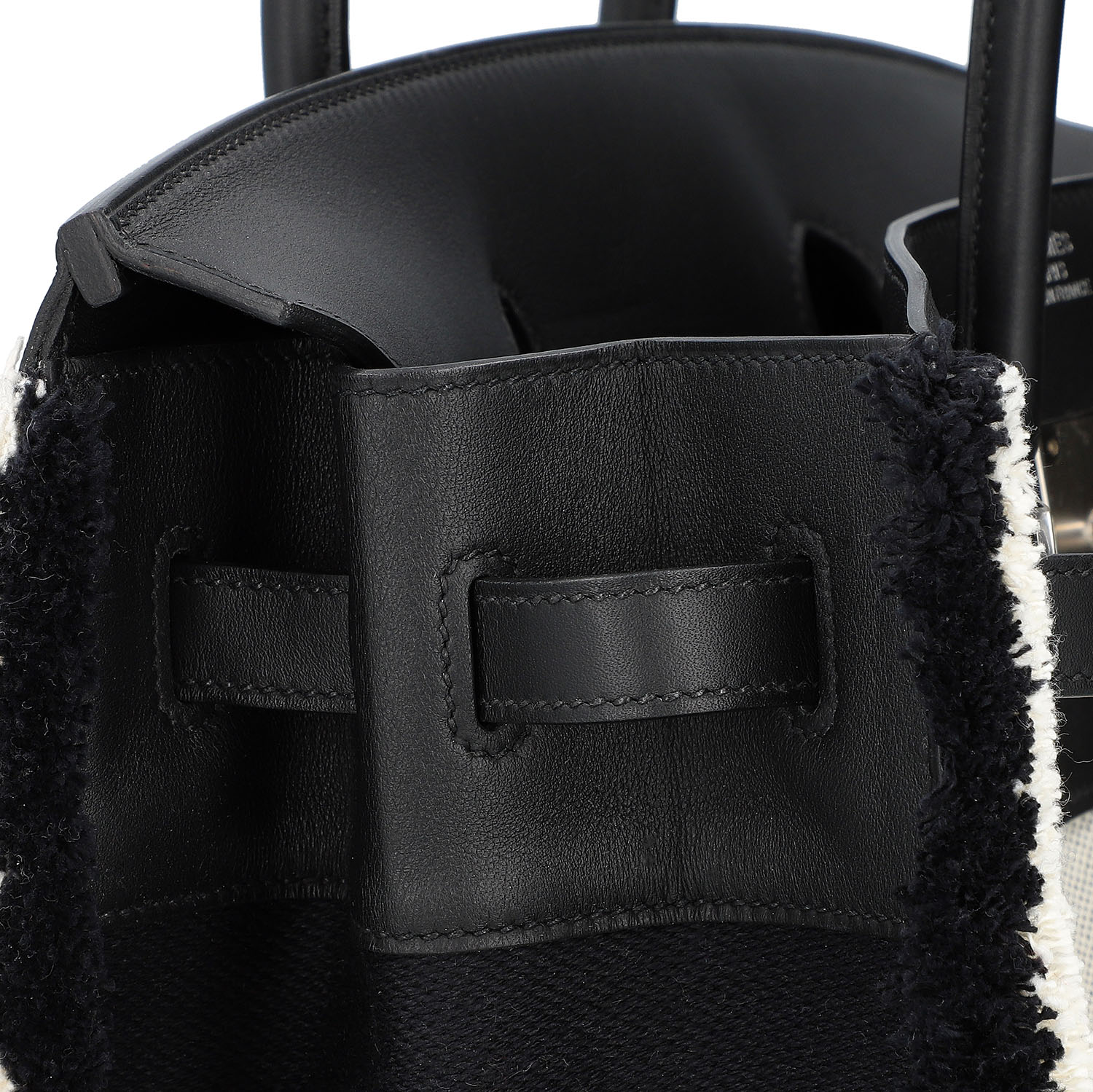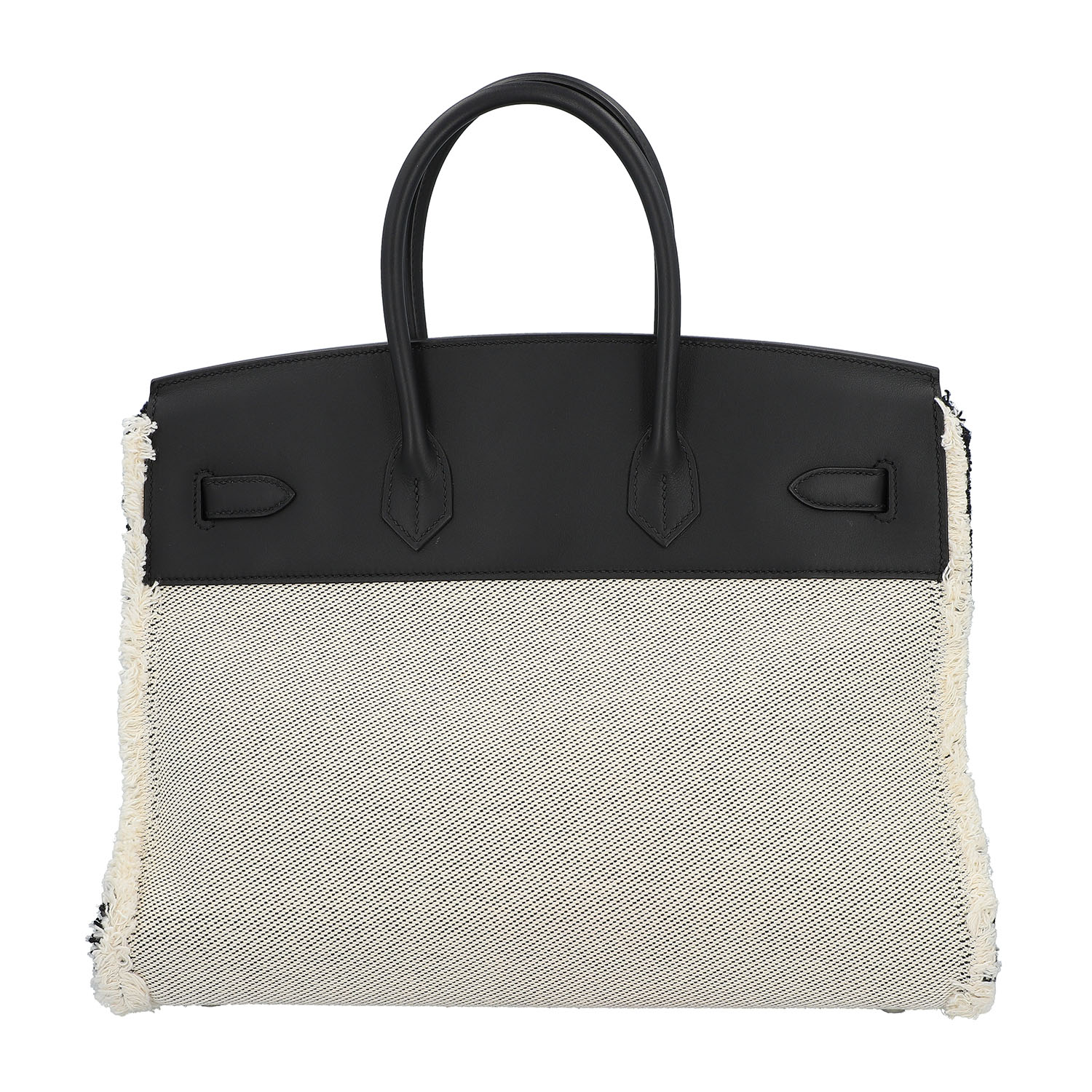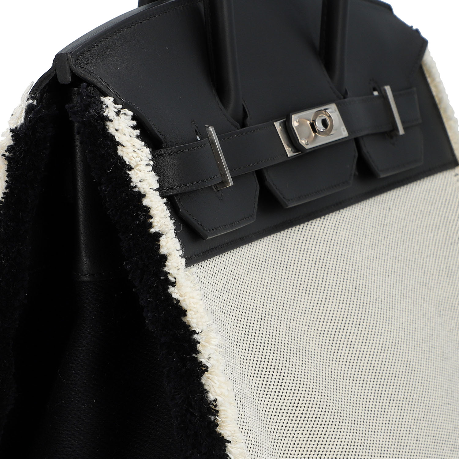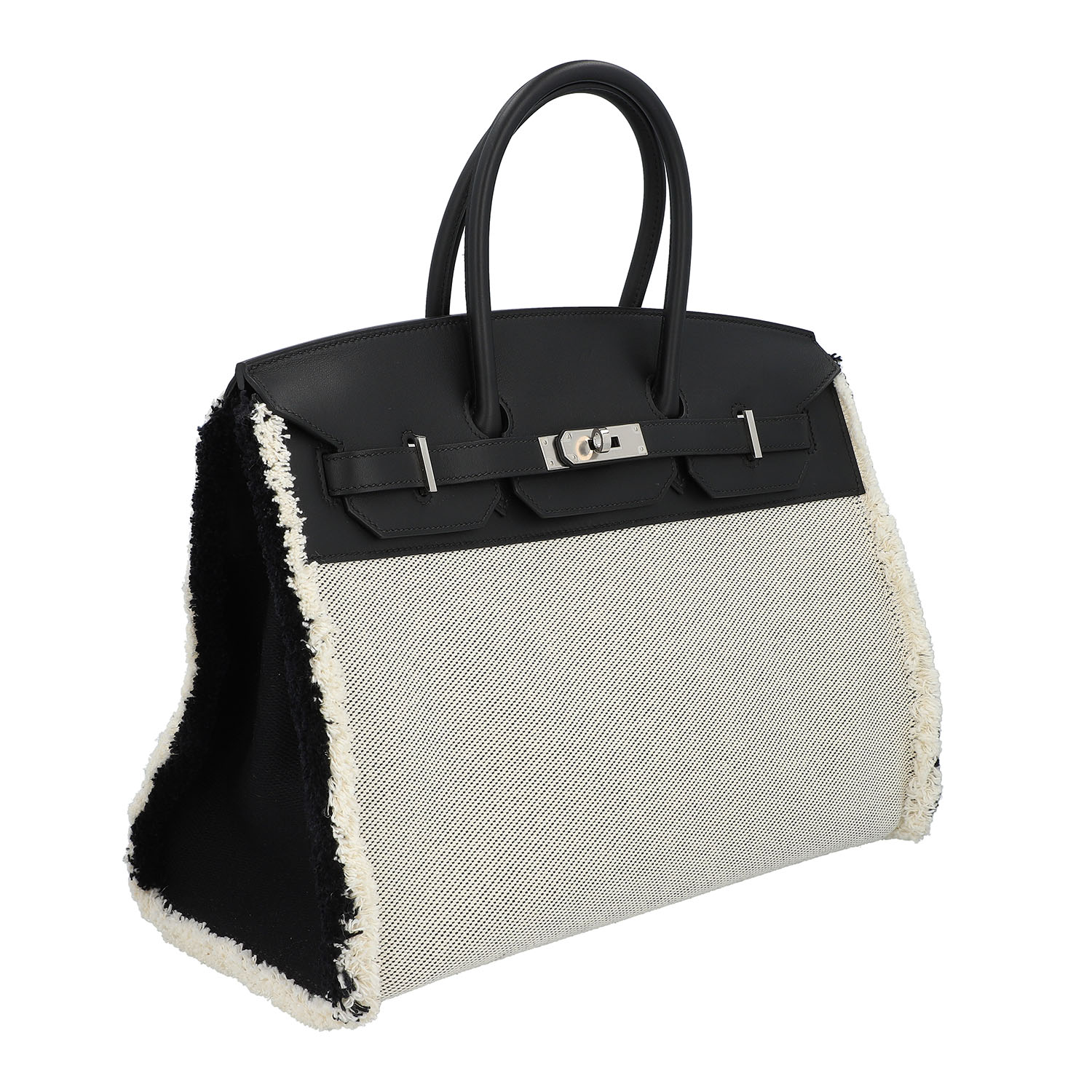 Kollektion 2021. ('Z'-Stempel). Sammlerstück. Die Birkin 'FRAY' verdankt ihren Namen der Fransen an der Kantenverarbeitung. Aus Swiftleder in Schwarz und Toile in Schwarz und Ecru. Die Hardware ist in Silberfarben mit Palladiumauflage. Sehr guter Zustand mit folierter Hardware. Druckstellen auf dem Leder. Box, Raincase, Staubbeutel (kein und groß), Clochette, Schloss und Schlüssel anbei.