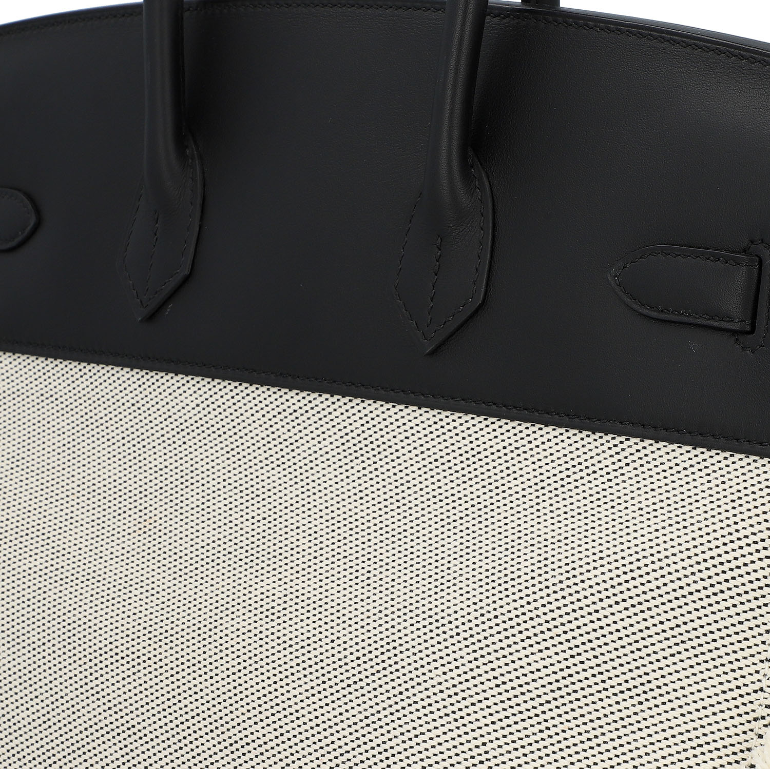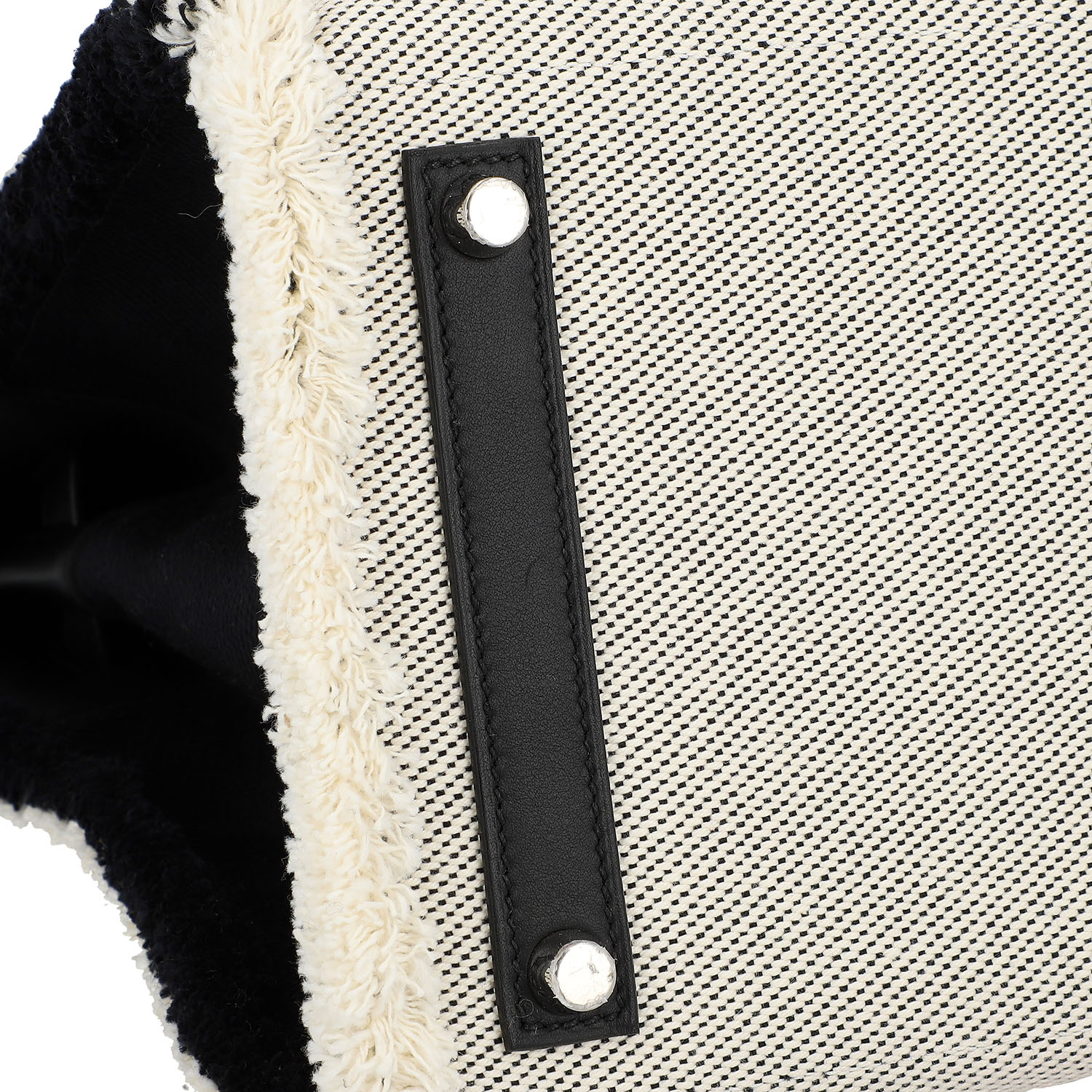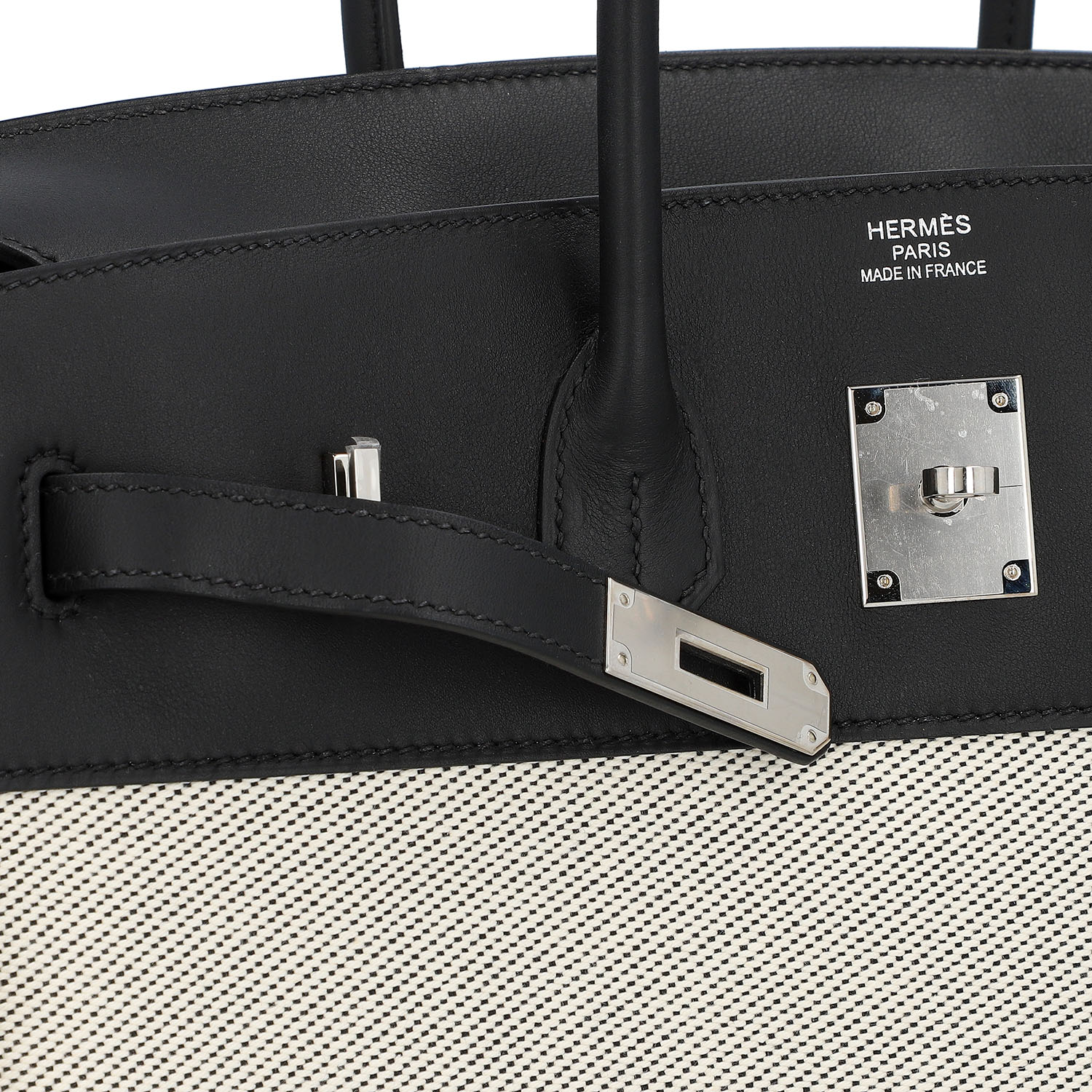 Kollektion 2021. ('Z'-Stempel). Sammlerstück. Die Birkin 'FRAY' verdankt ihren Namen der Fransen an der Kantenverarbeitung. Aus Swiftleder in Schwarz und Toile in Schwarz und Ecru. Die Hardware ist in Silberfarben mit Palladiumauflage. Sehr guter Zustand mit folierter Hardware. Druckstellen auf dem Leder. Box, Raincase, Staubbeutel (kein und groß), Clochette, Schloss und Schlüssel anbei.