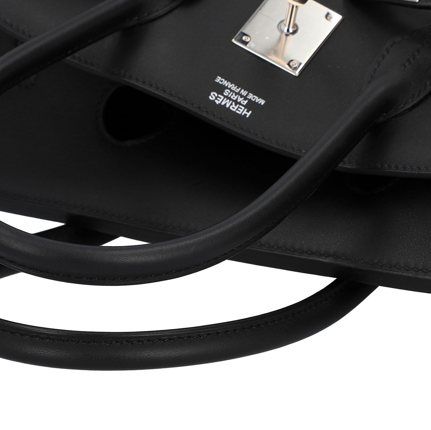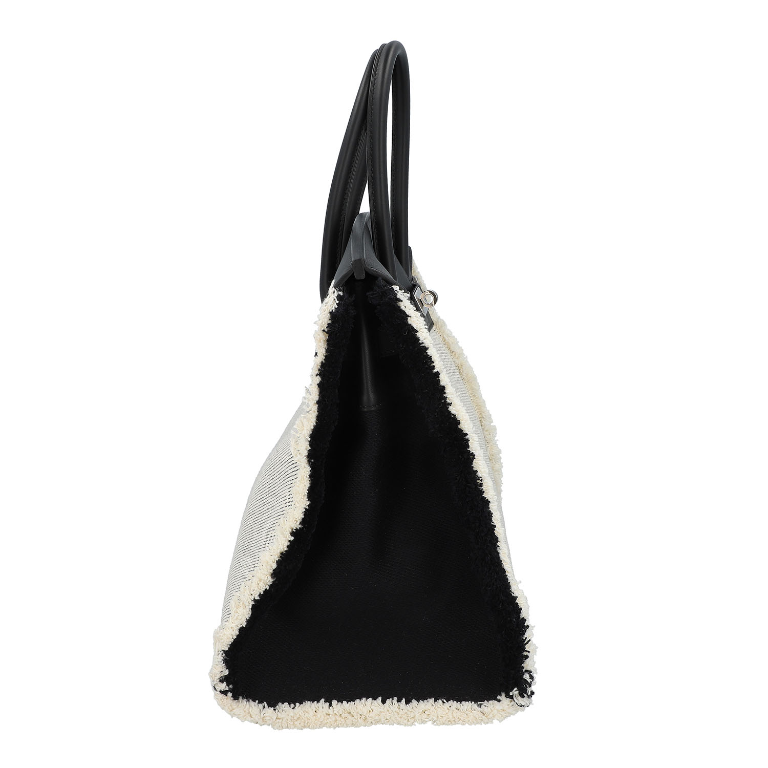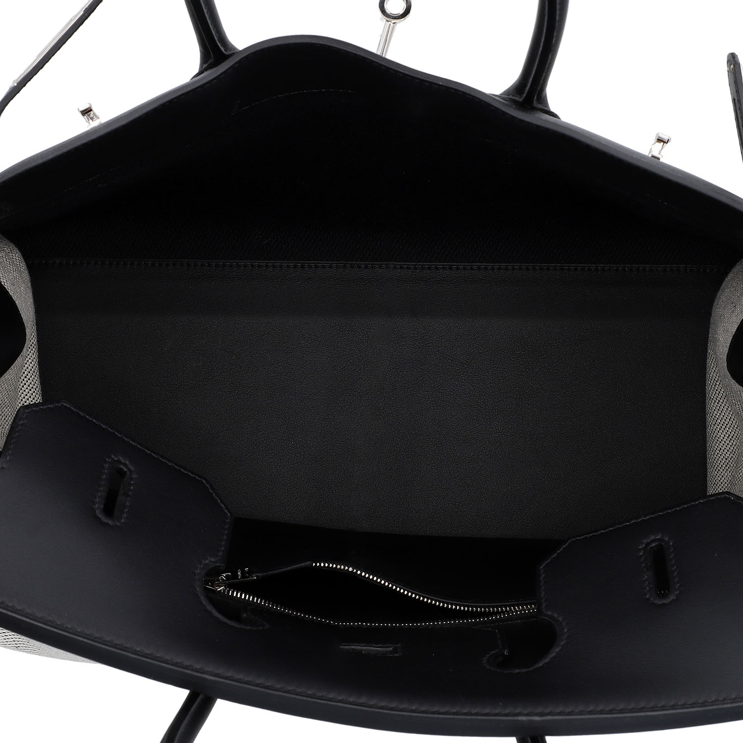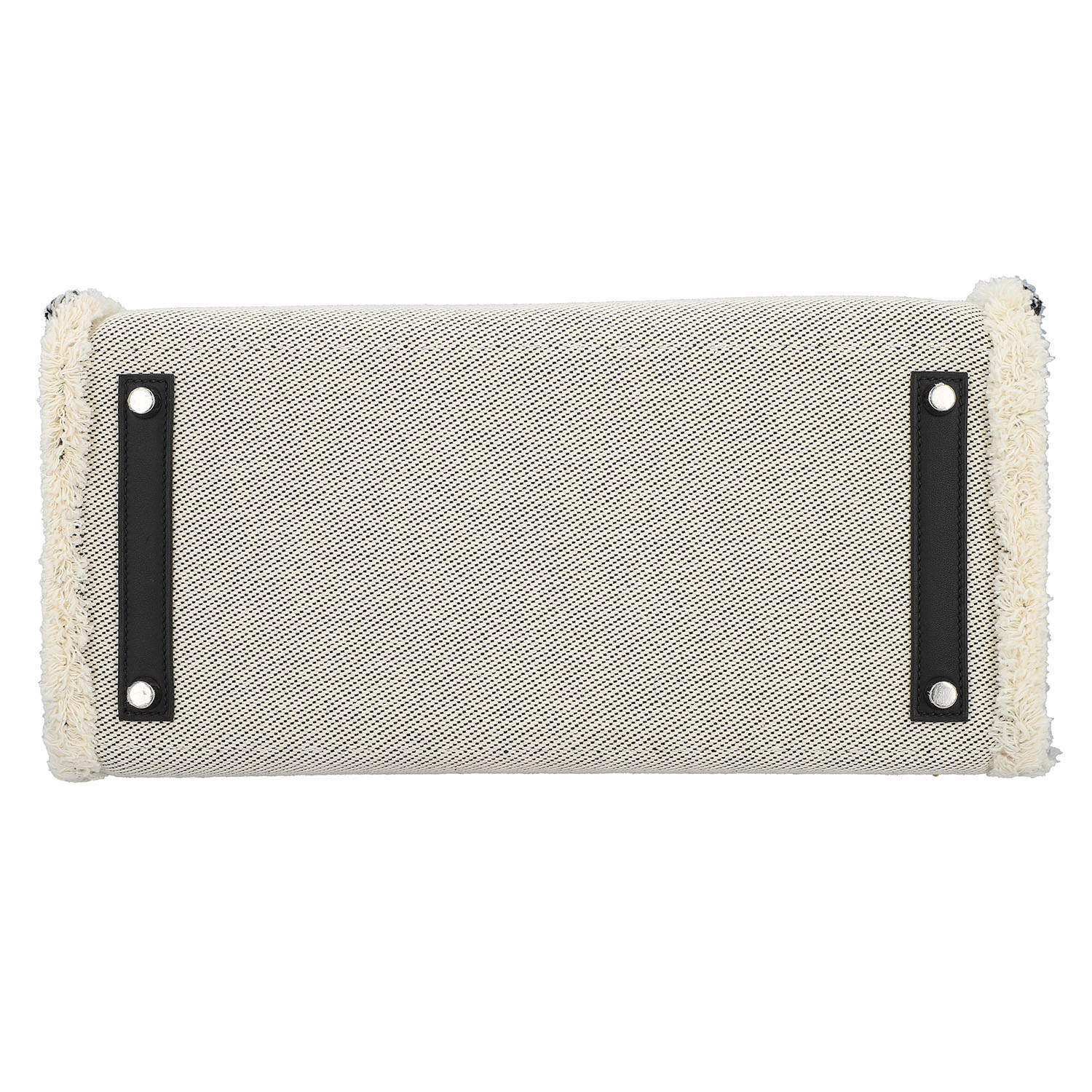 Kollektion 2021. ('Z'-Stempel). Sammlerstück. Die Birkin 'FRAY' verdankt ihren Namen der Fransen an der Kantenverarbeitung. Aus Swiftleder in Schwarz und Toile in Schwarz und Ecru. Die Hardware ist in Silberfarben mit Palladiumauflage. Sehr guter Zustand mit folierter Hardware. Druckstellen auf dem Leder. Box, Raincase, Staubbeutel (kein und groß), Clochette, Schloss und Schlüssel anbei.