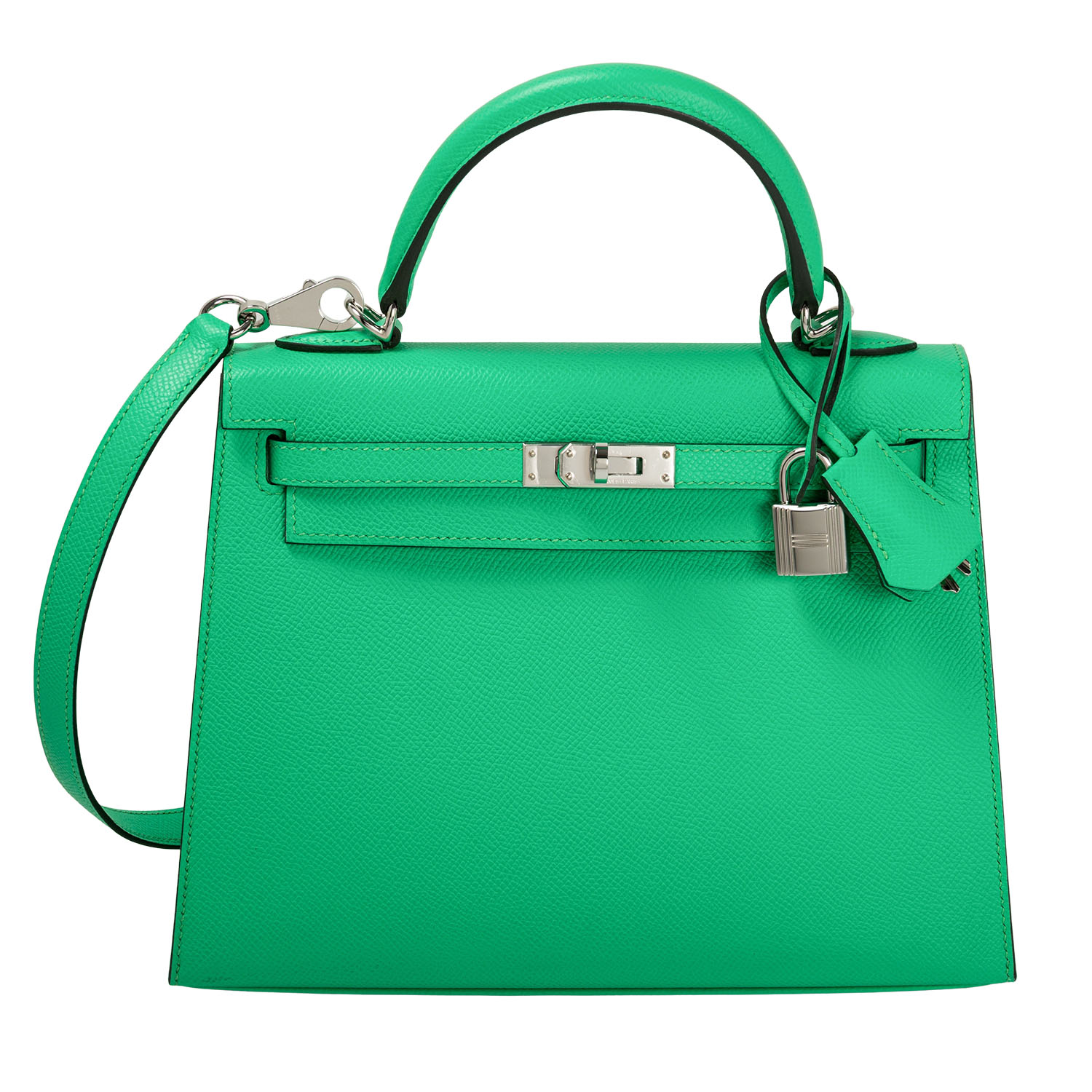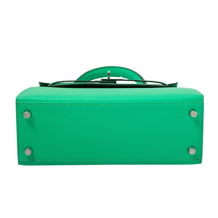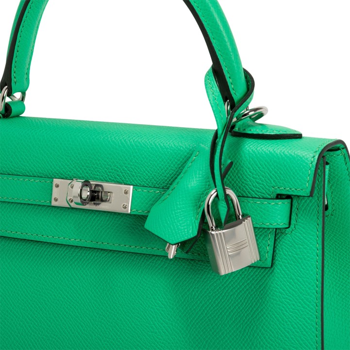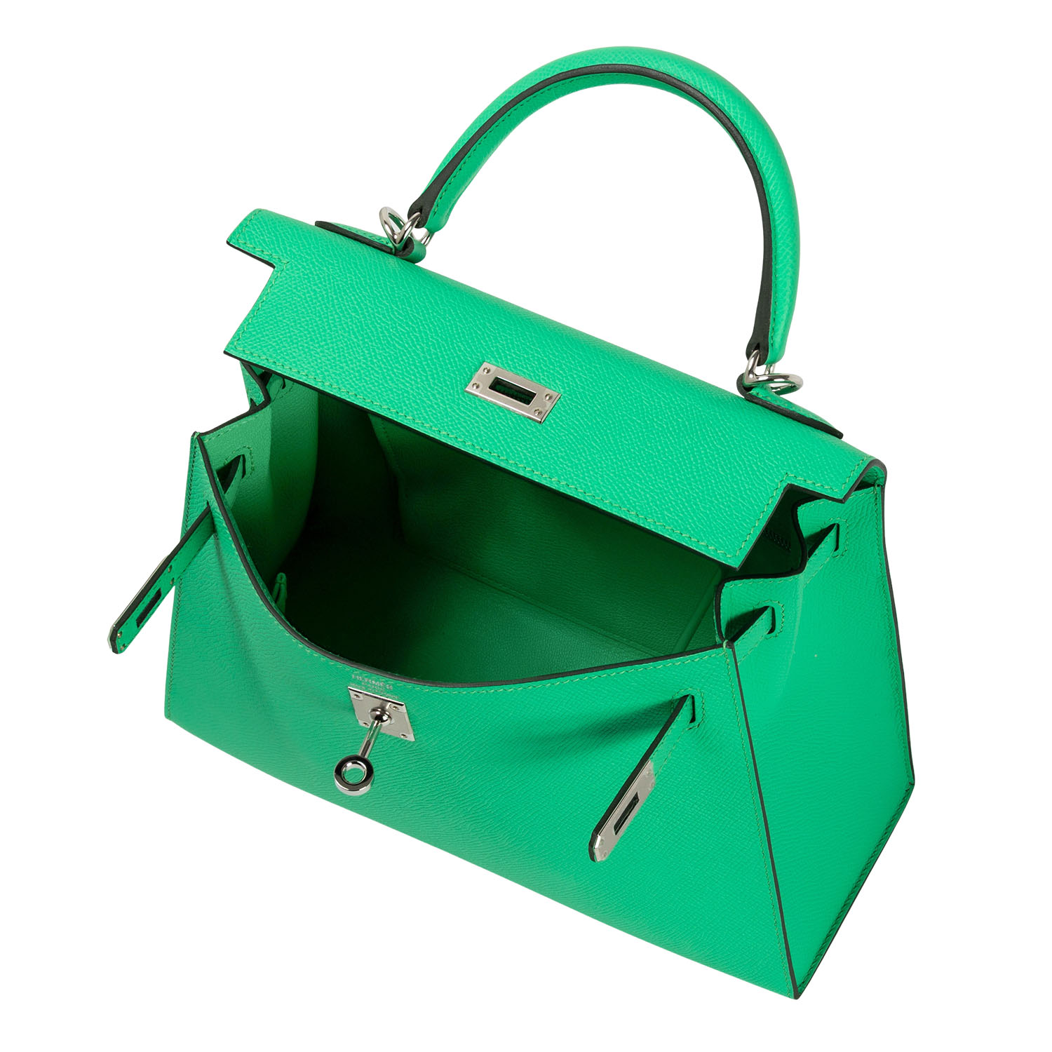 Kollektion 2023 (Stamp B). Epsom Leder in Vert Comics (Hellgrün). Hardware in Silberfarben mit Palladium Auflage. Klassisches Modell im Full Set (Box, Staubbeutel, Clochette, Schloss, Schlüssel, Schulterriemen, Rechnung anbei). Hardware noch foliert, dezente Gebrauchsspuren vorhanden.