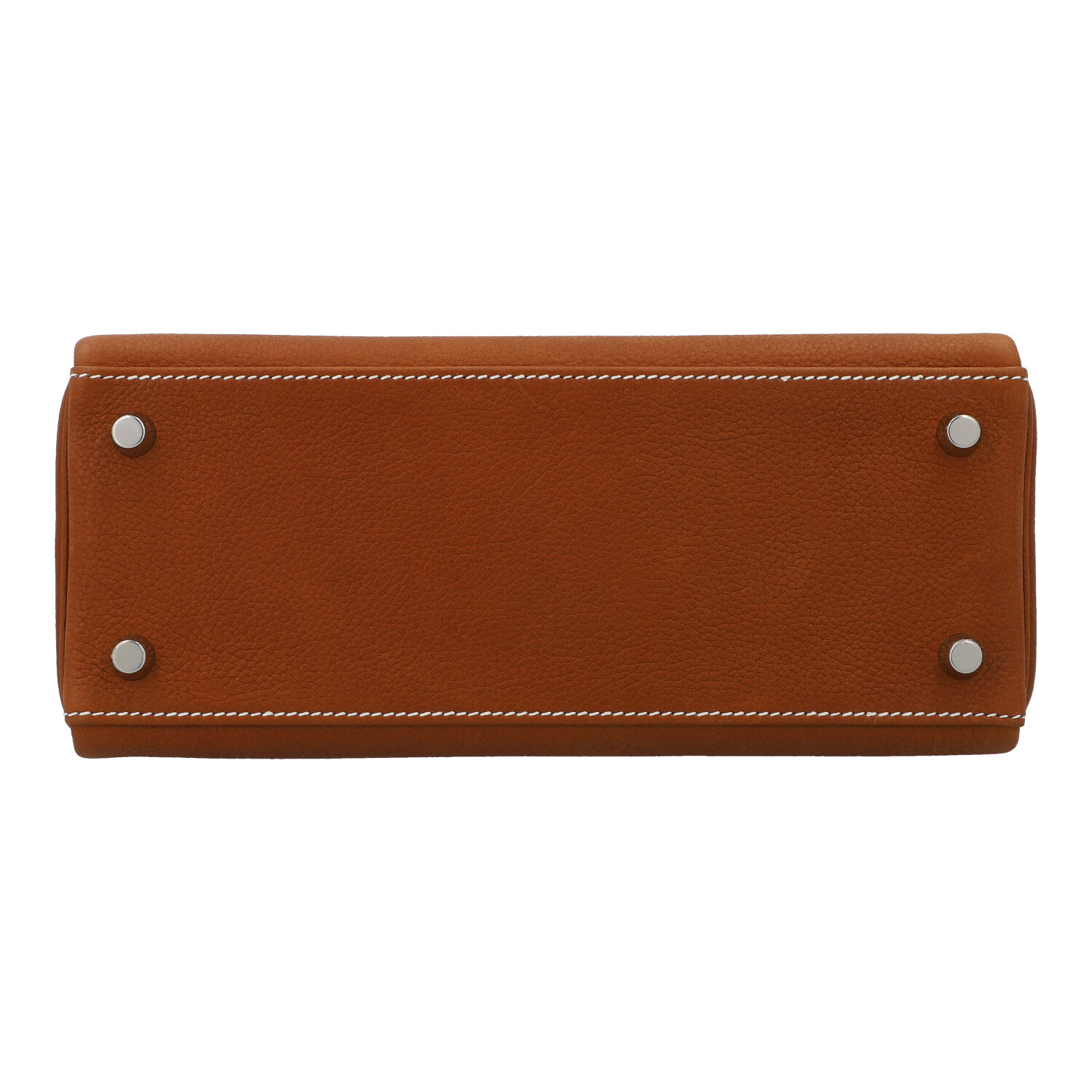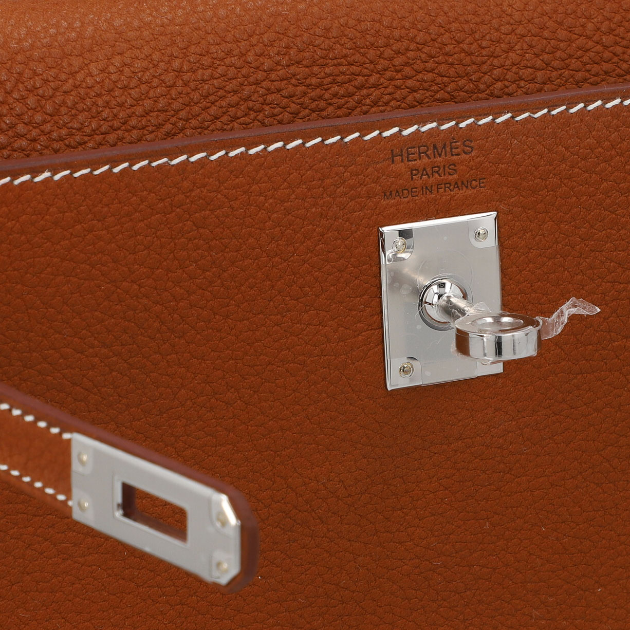 Kollektion 2024 ('W'-Stempel). Kelly Retourne aus Barenia Leder in Faubourg Fauve (Hellbraun) mit silberfarbener Hardware und dekorativer Naht in Weiß. Neuwertig und im Full Set (Box, Staubbeutel, Schulterriemen, Clochette, Schloss, Schlüssel und Rechnung).