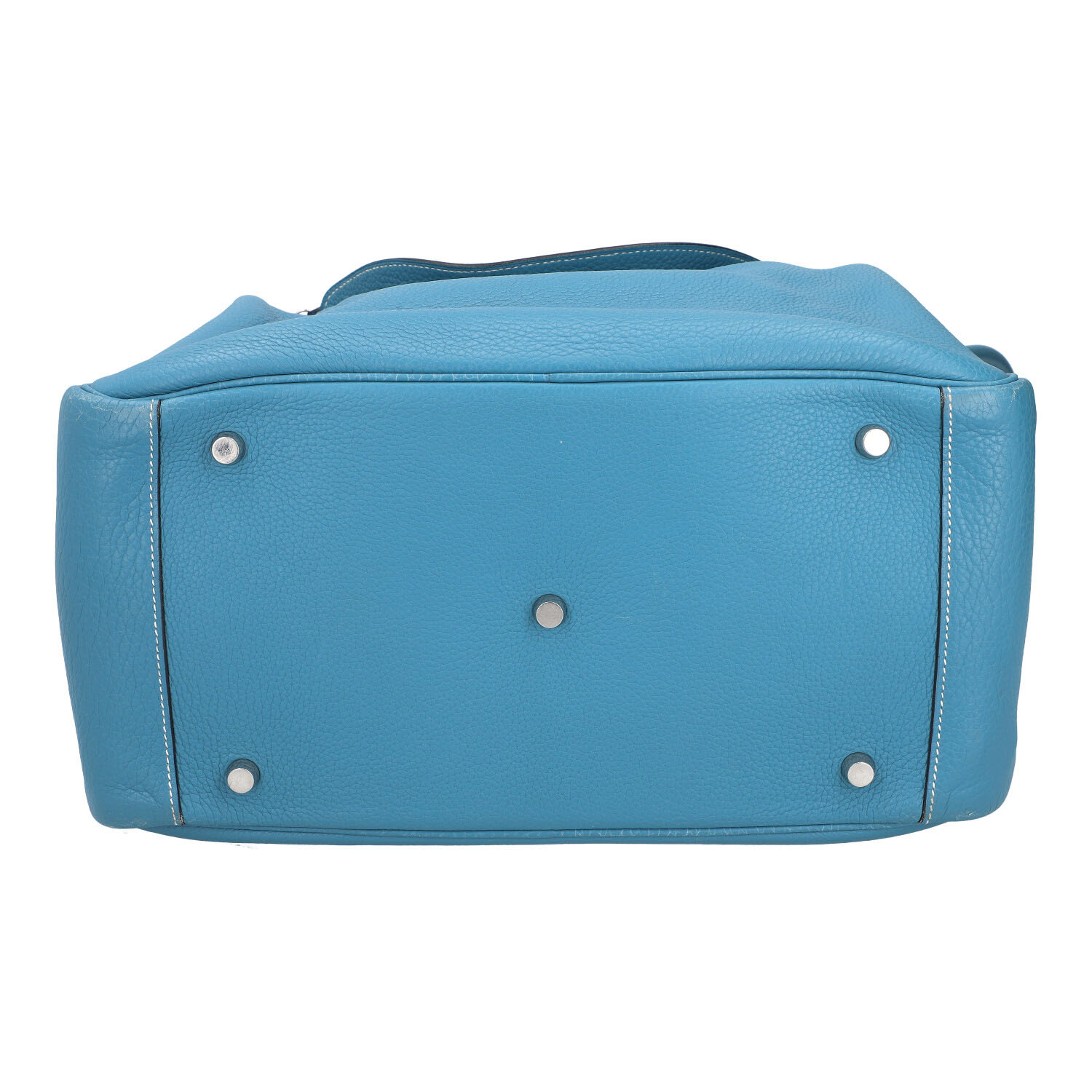 Clemence Leder in Hellblau mit weißer Naht und silberfarbener Hardware. Klassisches Modell. Abrieb an den Kanten, sonst guter Erhalt. 34x16x22cm.