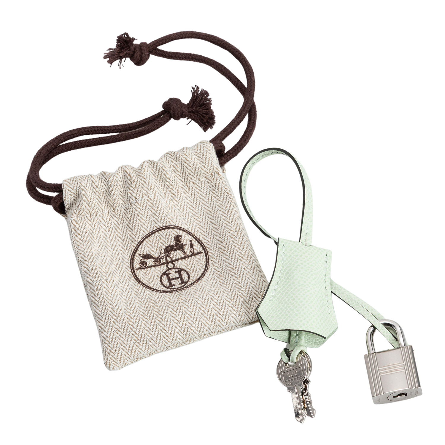 Epsomleder im Farbton Vert Fizz, Hardware mit Palladium-Auflage, Doppelhenkel und Riemenverschluss auf der Front. Innenraum mit zwei Fächern, eines mit Reißverschluss. Box, Staubbeutel, Schlüssel in Clochette, Schloss und Rechnung anbei. Neuwertig.