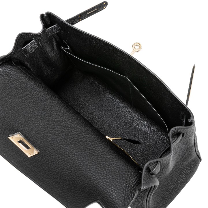 Togo Leder in Noir (Schwarz) mit Permabrass-Hardware, einem Henkel, Riemenverschluss vorne und abnehmbarem Schulterriemen. Innenraum mit drei Fächern, davon eines mit Reißverschluss. Full Set: Box, Staubbeutel, Rechnung, Schlüssel in Clochette und Schloss liegen bei. Neuwertig.
