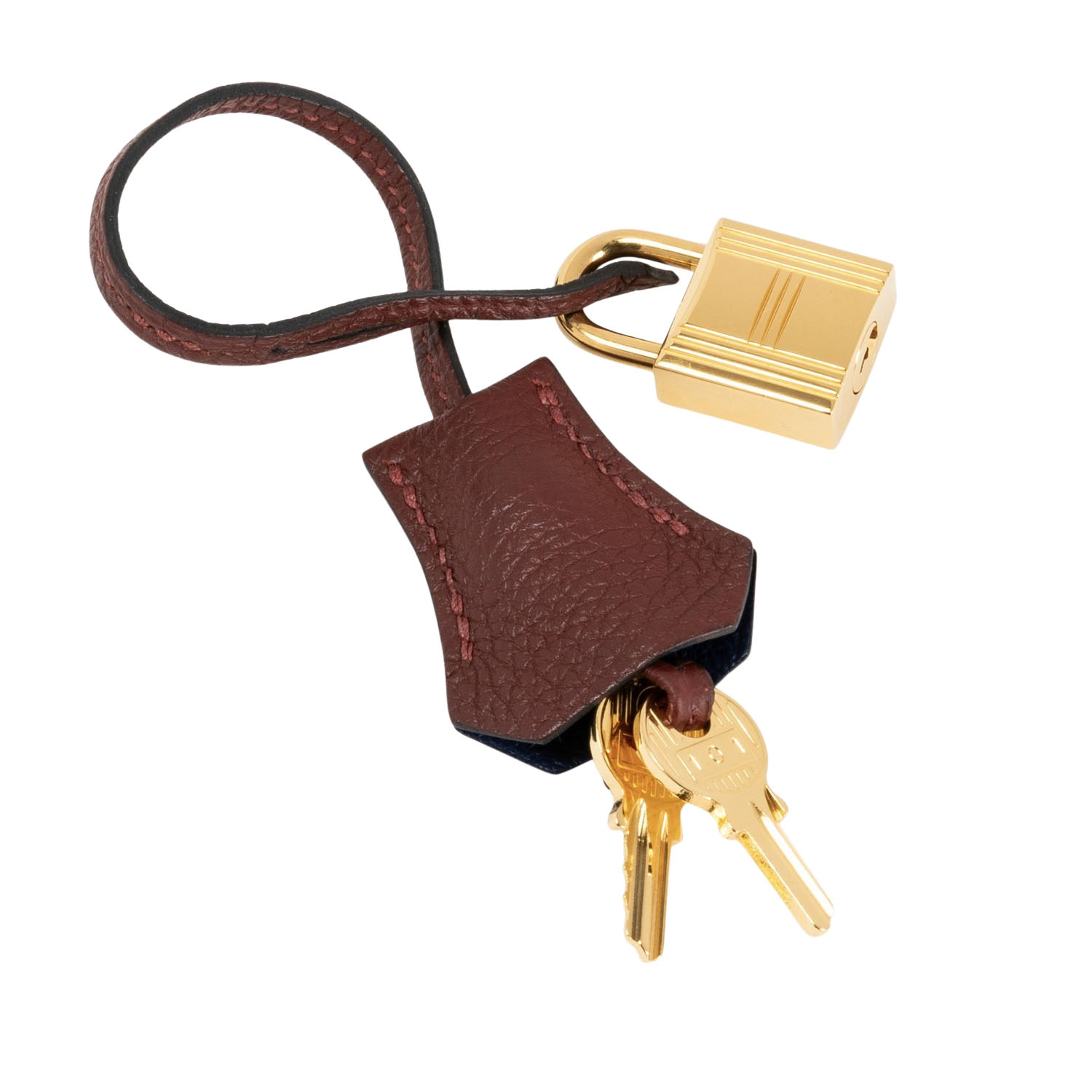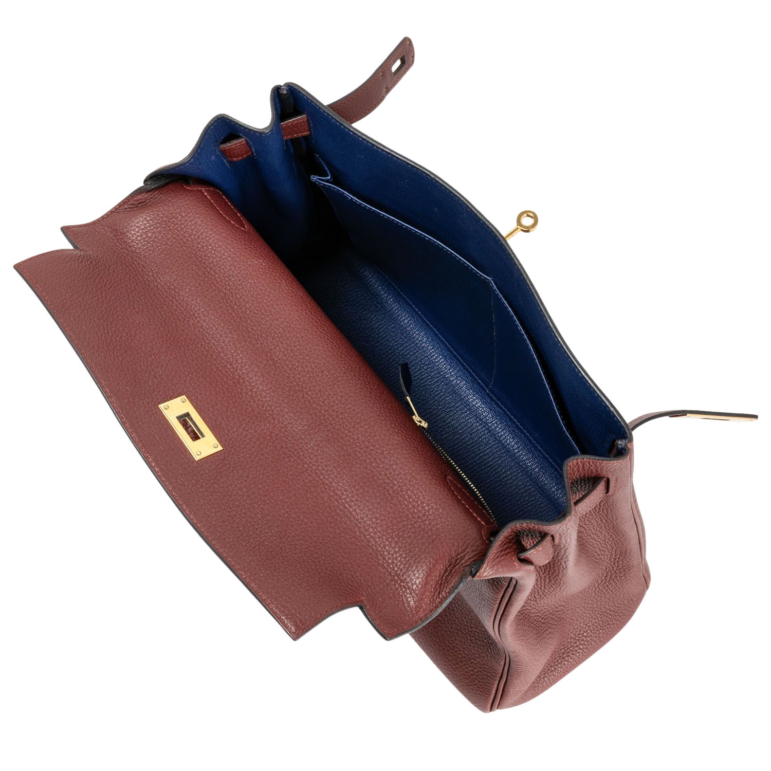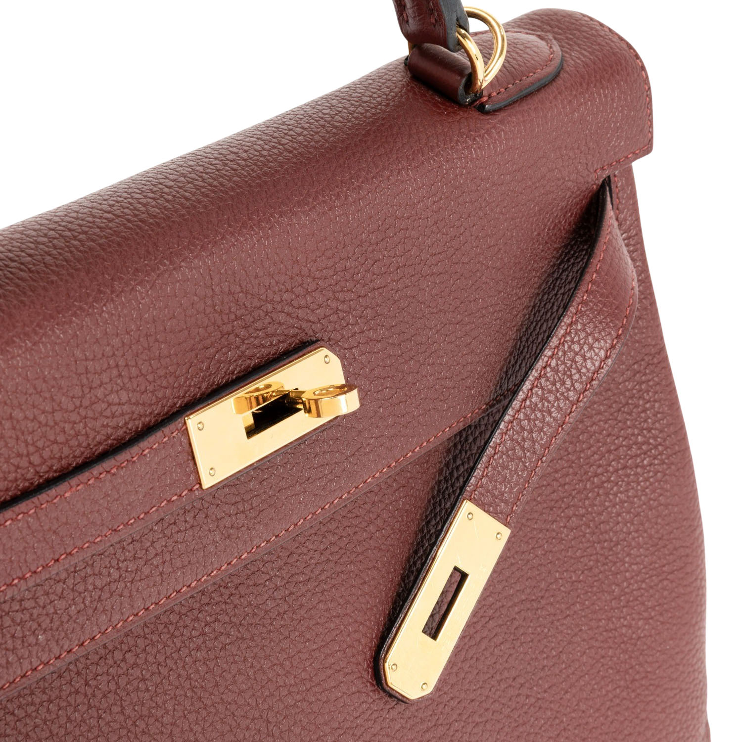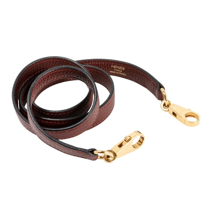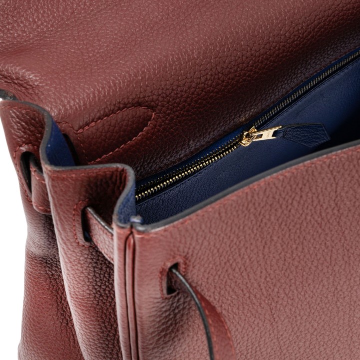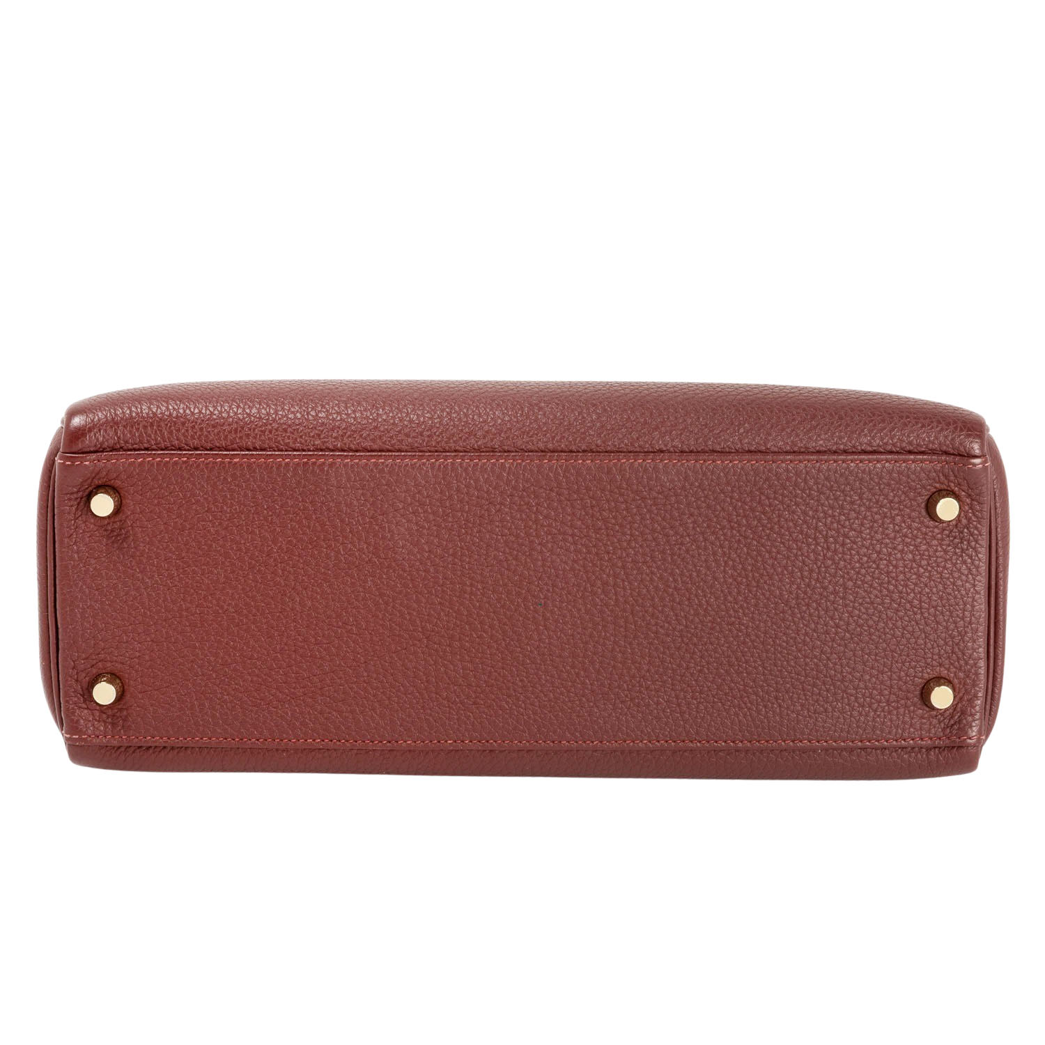 Togo-Leder im Farbton Rouge H mit vergoldeter Hardware, Henkel und Riemenverschluss.