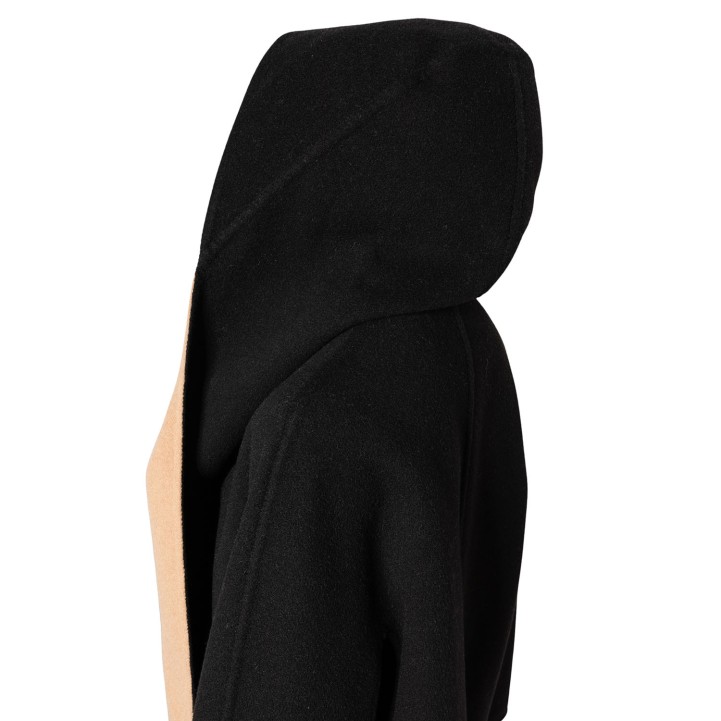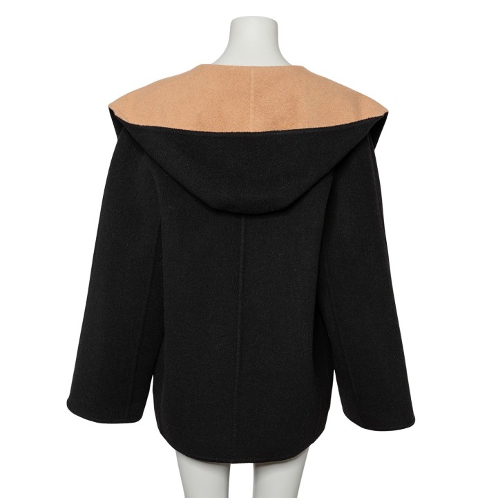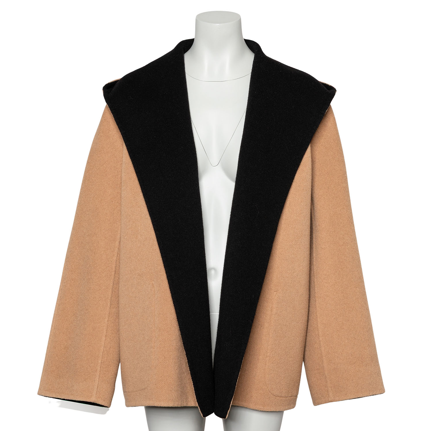 Wendbares Doubleface-Modell in Schwarz und Beige mit Schalkragen und Eingrifftaschen. Tragespuren vorhanden, leichtes Pilling.