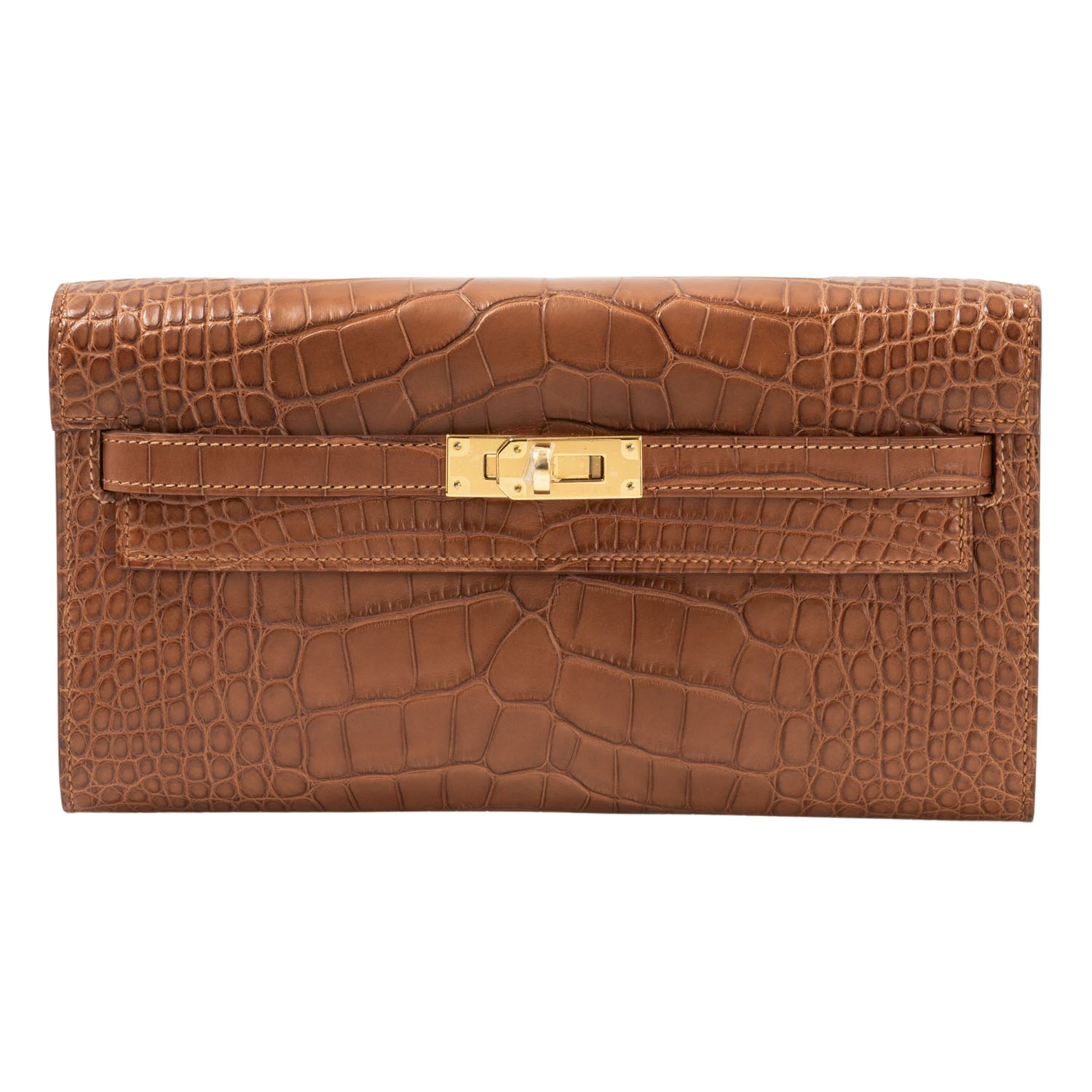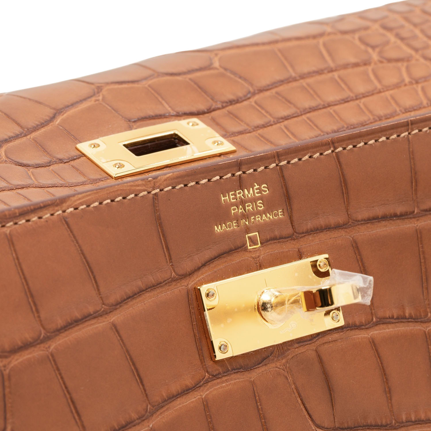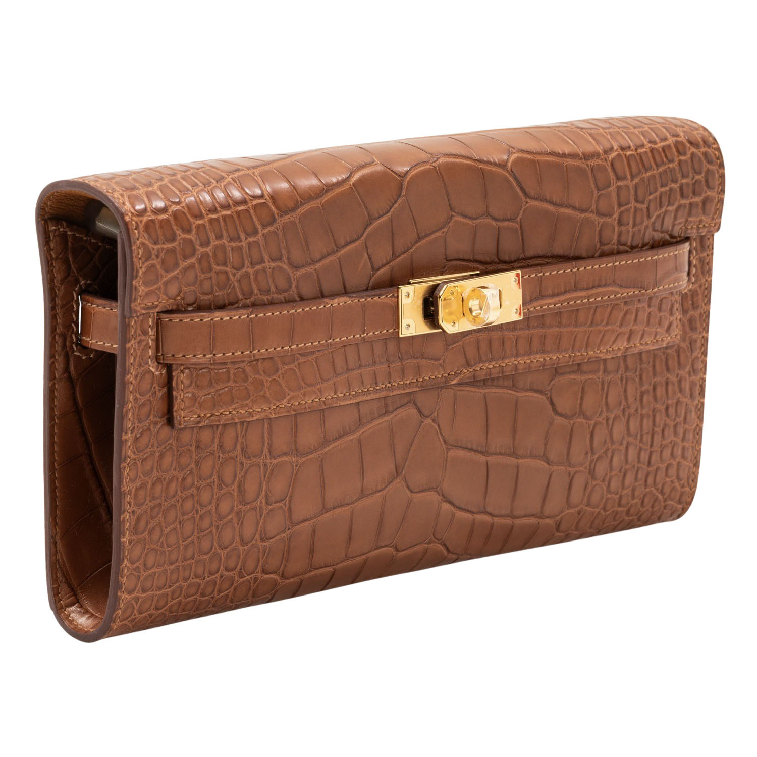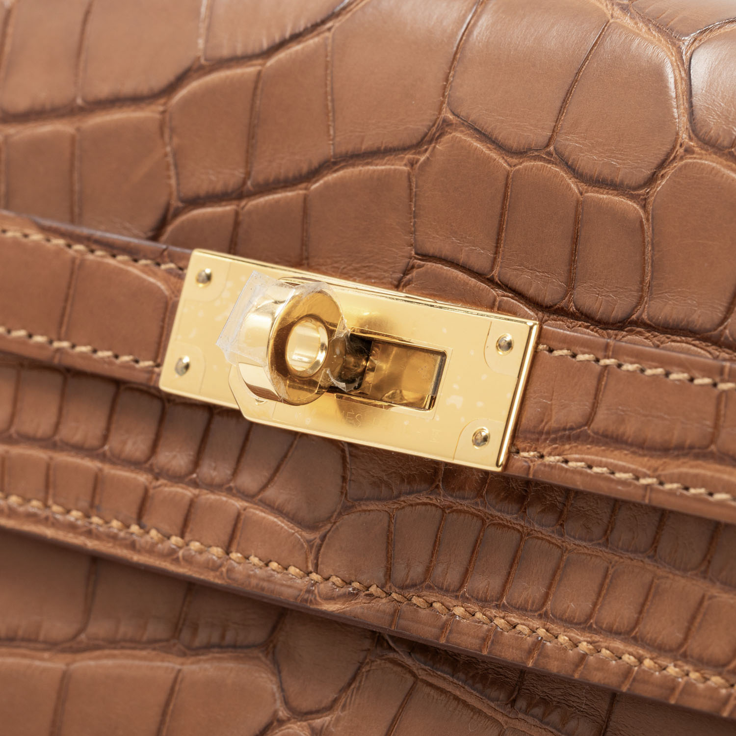 Koll. 2024. Aus mattem Alligatorleder (Missi.) in Gold (Hellbraun) mit vergoldeter Hardware. Klassisches Modell mit ikonischem Laschenverschluss und diversen Innenfächern. Schulterriemen, Box, Kopie der Rechnung und orig. Cities anbei. Neuwertiger Zustand, Hardwar foliert.