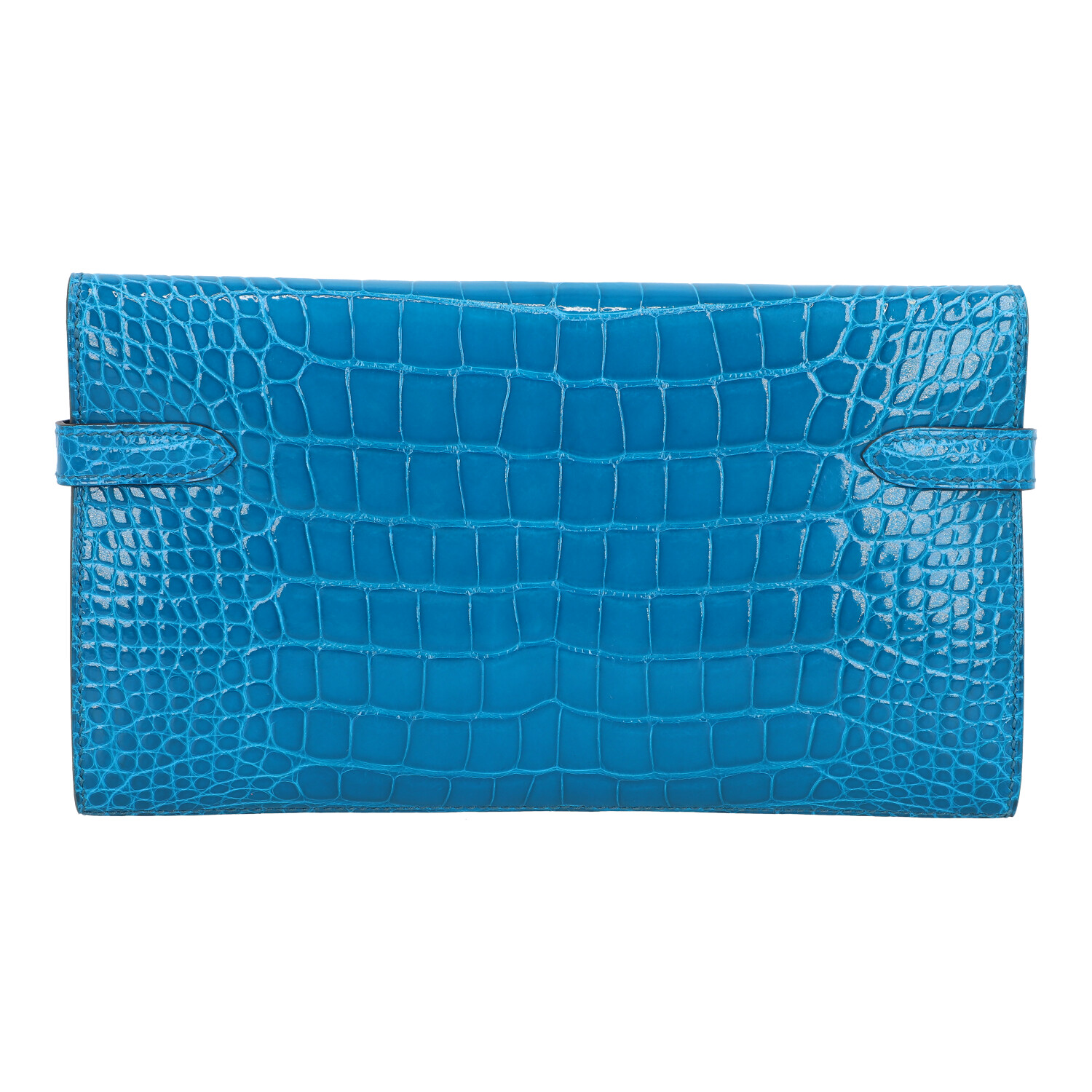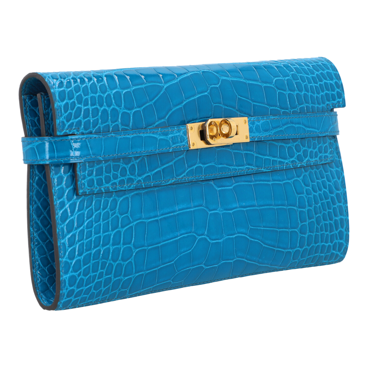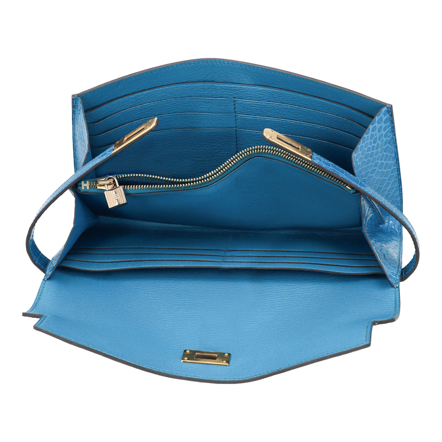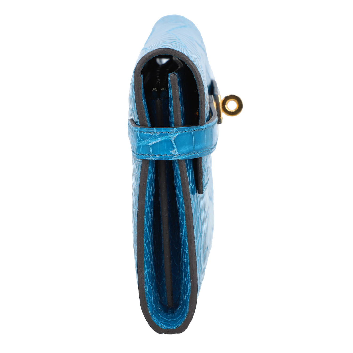 Alligator Mississippiensis in Bleu Colvert mit vergoldeten Beschlägen und Riemenschließe. Innen zwölf Kartenfächer, vier große Fächer und ein zentrales Reißverschlussfach. Box und Kopie der Cites beigefügt. Guter Zustand. 20 x 1,5 x 11,5 cm.