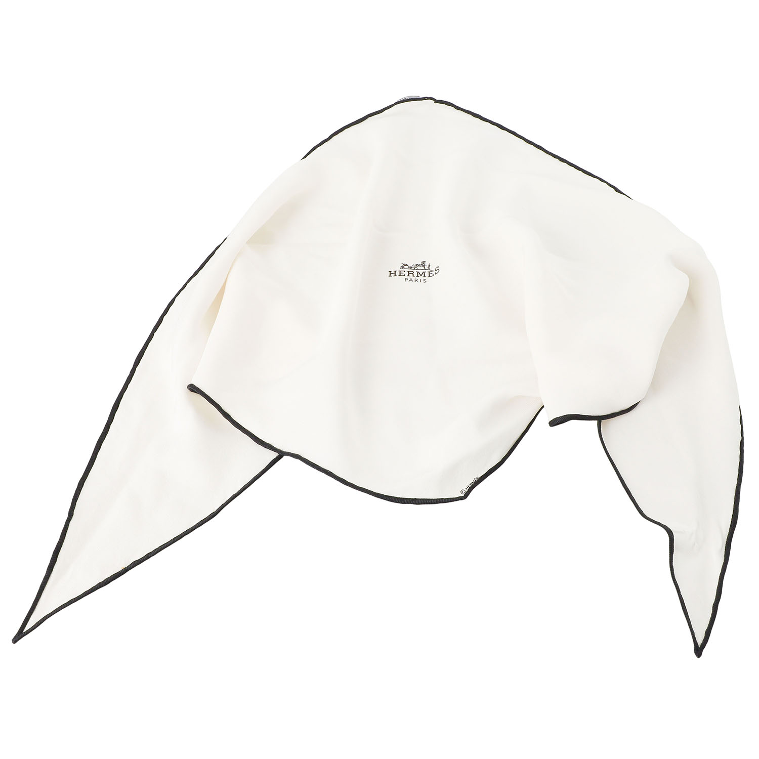100% Seide. Cremefarbenes Modell mit schwarzen Kanten und handrollierten Säume. Tragespuren vorhanden, Flecken vorhanden. 90 x 40 cm.