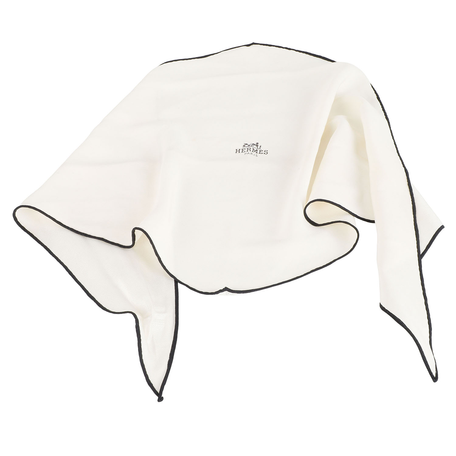 100% Seide. Cremefarbenes Modell mit schwarzen Kanten und handrollierten Säume. Tragespuren vorhanden, Flecken vorhanden. 90 x 40 cm.