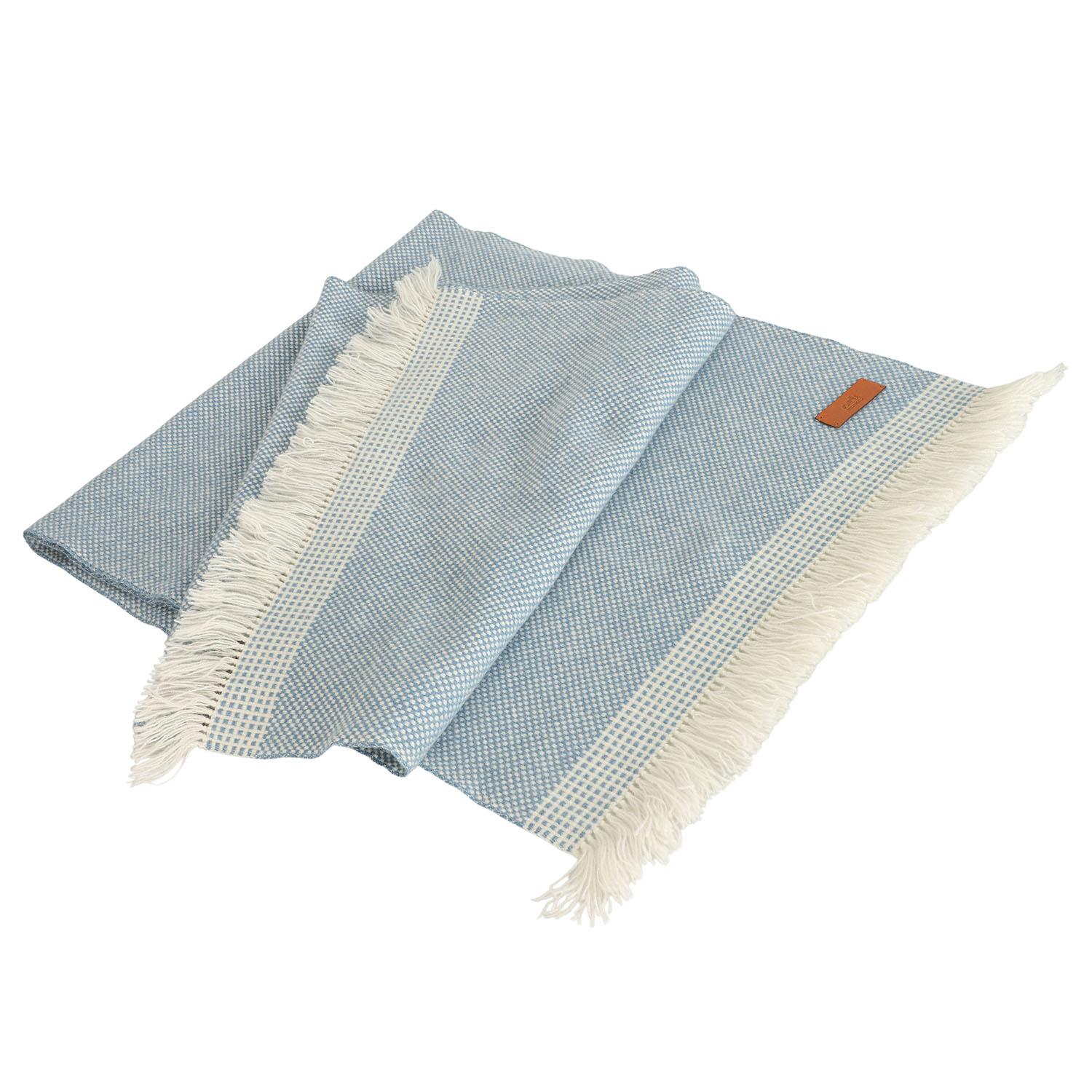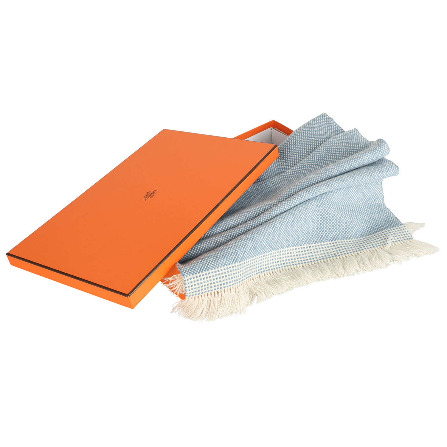Kaschmir, made in Nepal. Hellblau und cremefarbenes Modell mit Fransenabschluss. Box anbei. Sehr guter Zustand. 200 x 39 cm.