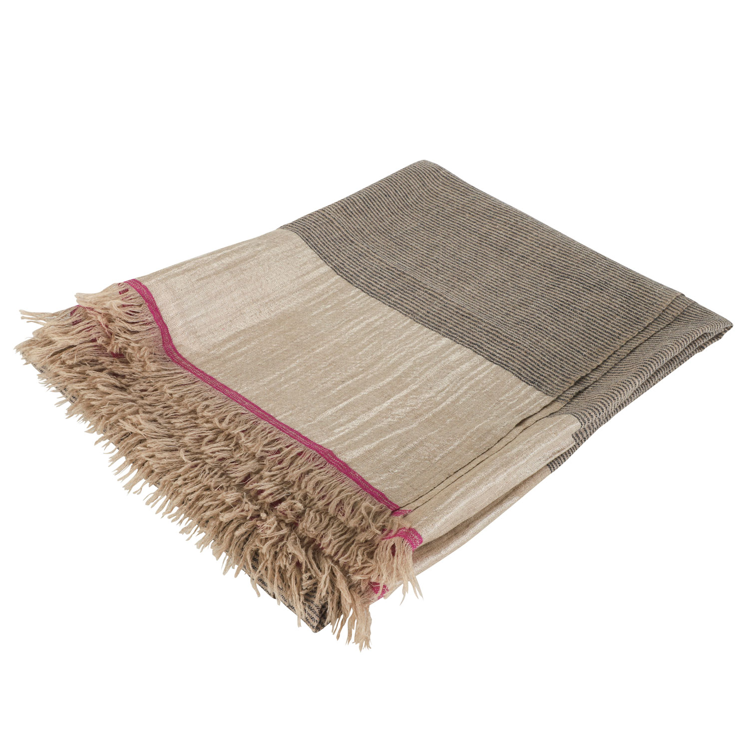 100% Kaschmir. Gestreiftes Modell, Rahmen in Silberfarben mit Fransenabschluss und lilafarbenem, schmalem Streifen. Tragespuren vorhanden. 140 x 140 cm.