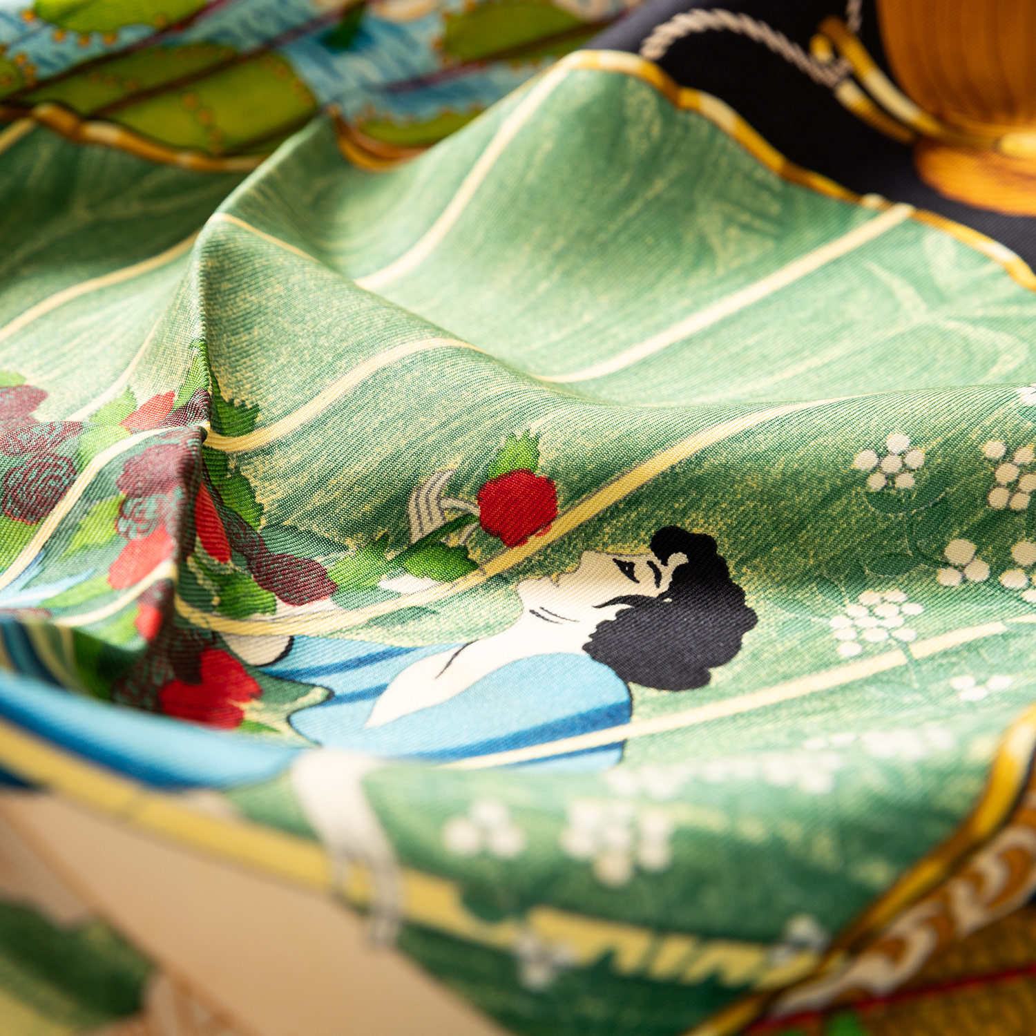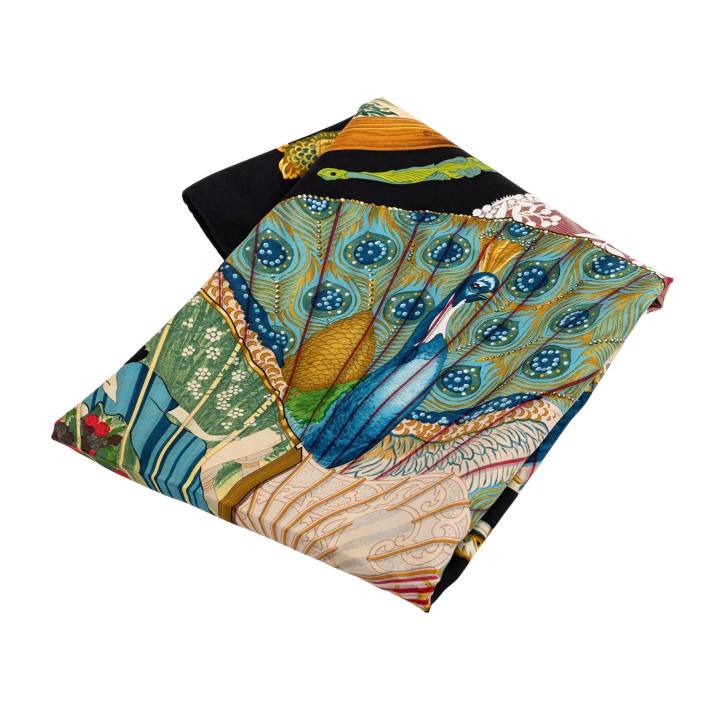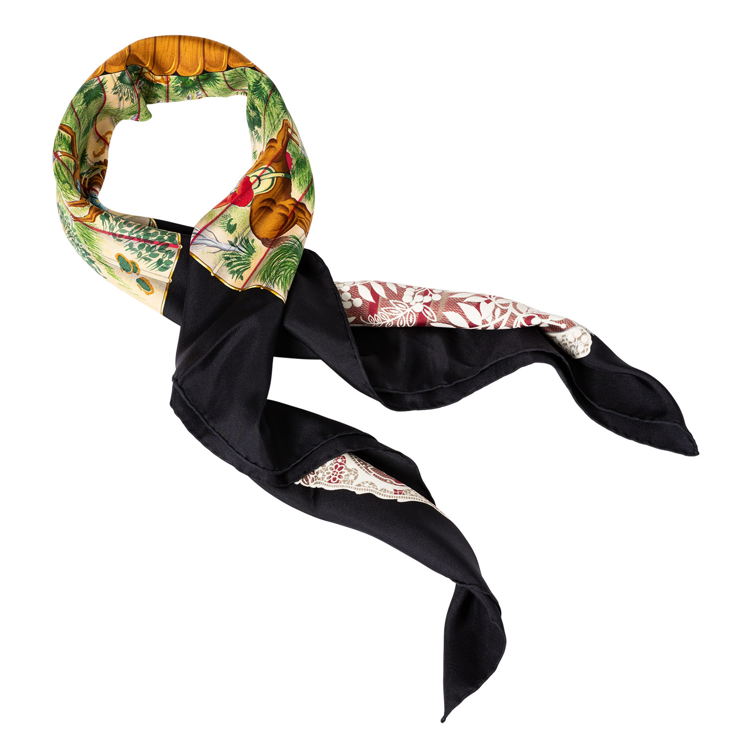 by Julie Abadie, Entwurf erstmals erschienen 1985. Akt. NP.: 530,-€. 100% Seide. Darstellung zahlreicher Fächer („éventails“) – inspiriert von den Sammlungen Duvelleroy und dem Musée Carnavalet. 90 x 90 cm. Handrollierte Säume. Tragespuren vorhanden.