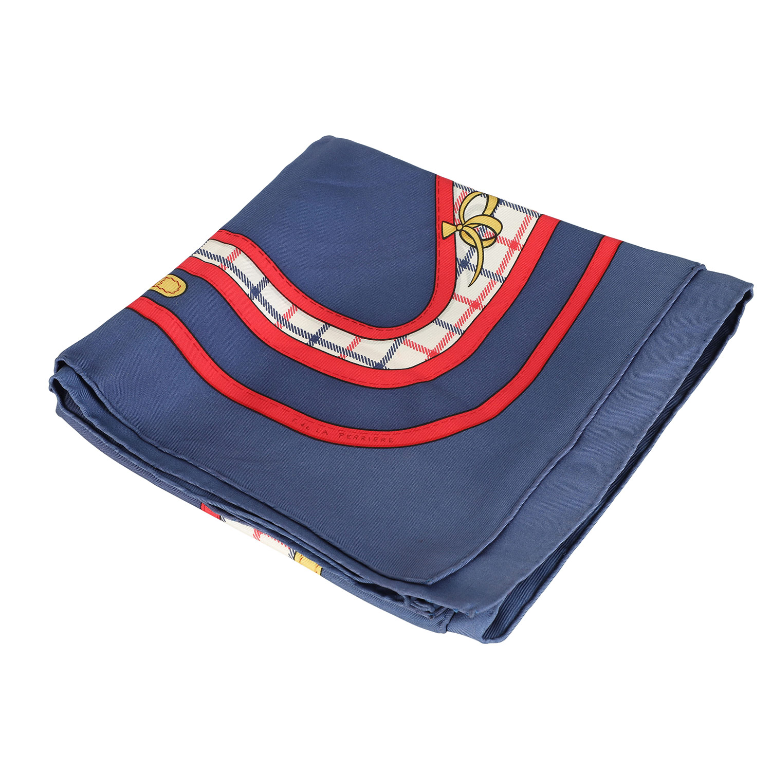 by Françoise De La Perriere, Entwurf erstmals erschienen 1974. Akt. NP.: 495,-€. 100% Seide. Pferdemotiv auf blauem Grund mit roten Details. Handrollierte Säume. 90 x 90 cm. Tragespuren und Flecken vorhanden.