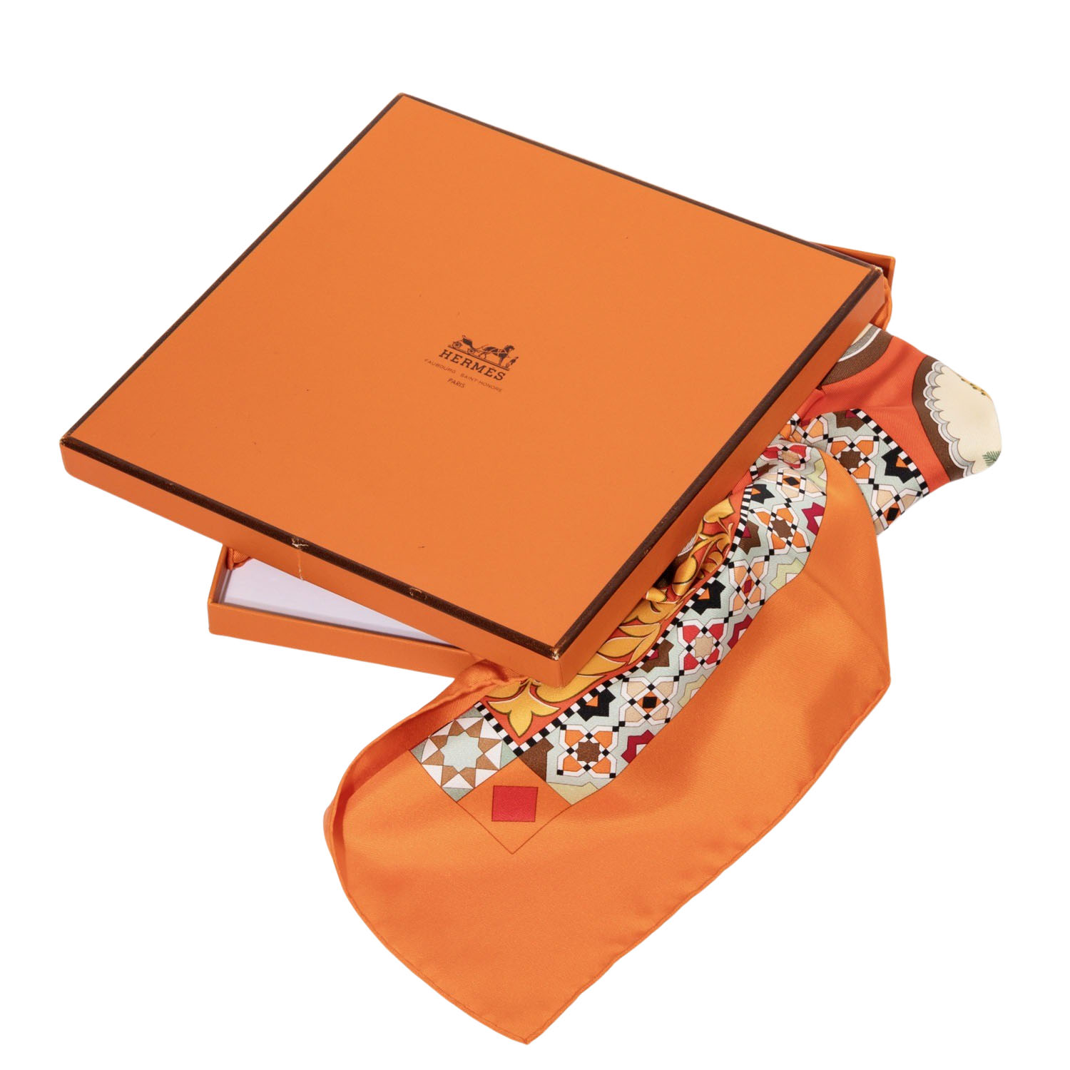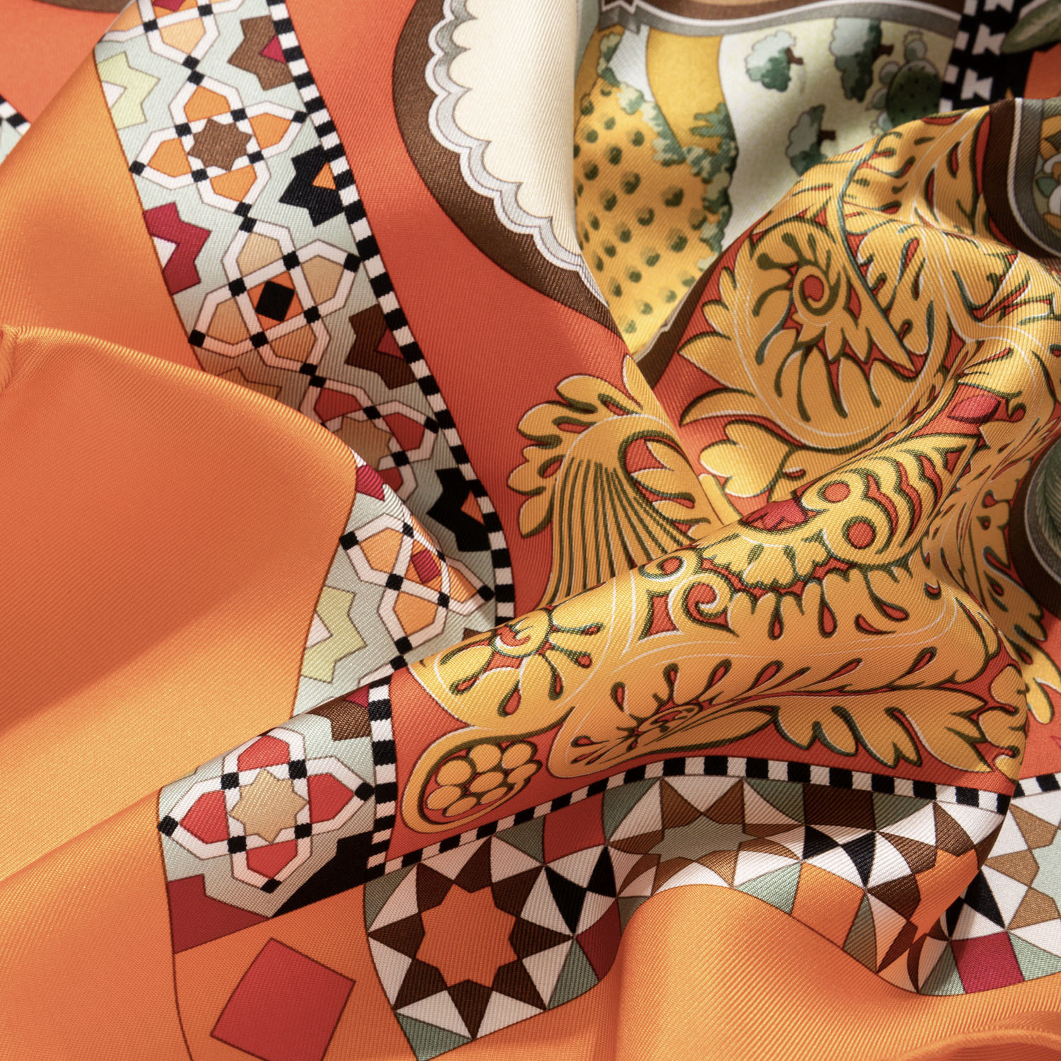 by Aline Honoré, Entwurf erstmals erschienen 2006. Akt. NP.: 530,-€. 100% Seide. Inspiriert von der maurischen Gartenkunst Andalusiens, florale Ornamente, Mosaike und stilisierte Pflanzenmotive, die an die Architektur und Ästhetik historischer Gärten wie der Alhambra erinnern. 90 x 90 cm. Handrollierte Säume. Box anbei. Sehr guter Zustand.