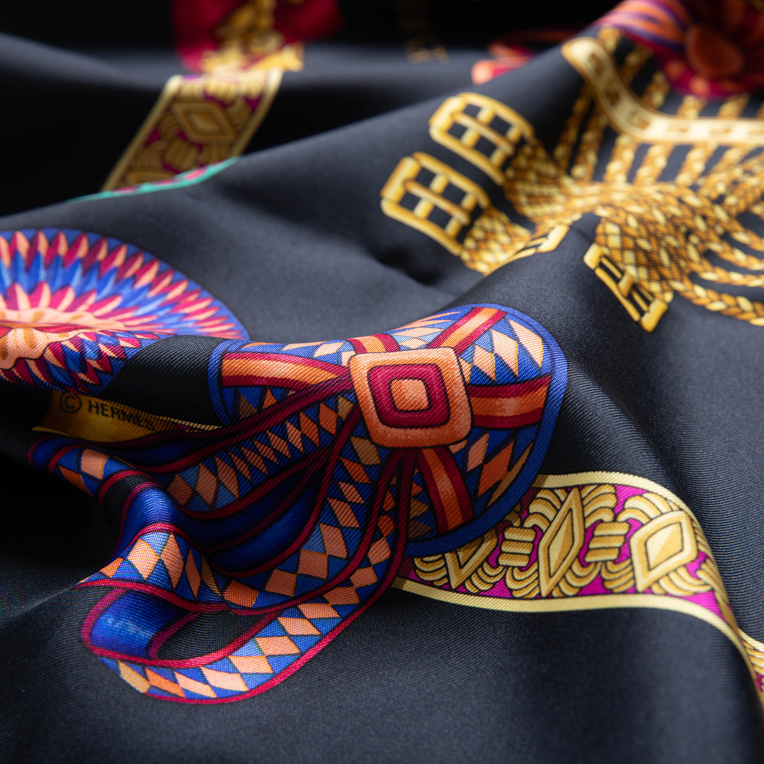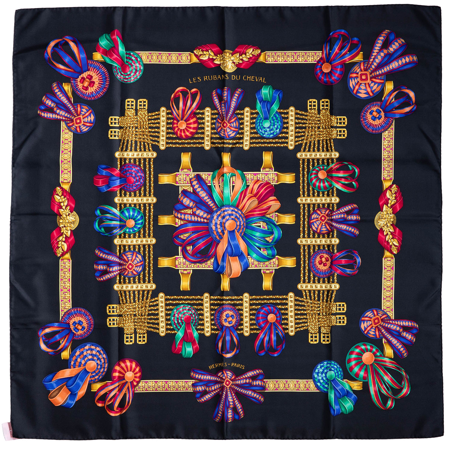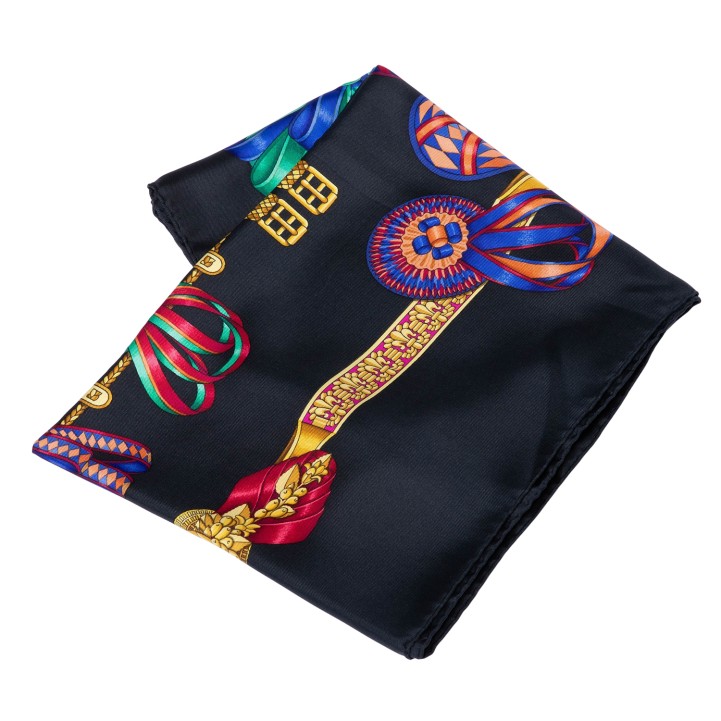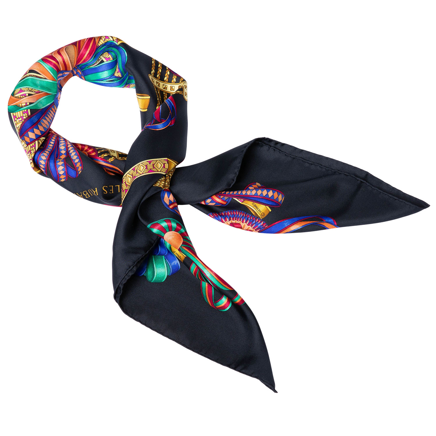by Joachim Metz, Entwurf erstmals erschienen 1988. 100% Seide. Pferdeschleifen-Motiv in Multicolor auf schwarzem Grund. Handrollierte Säume. 90 x 90 cm. Gereinigt, sehr guter Erhalt.