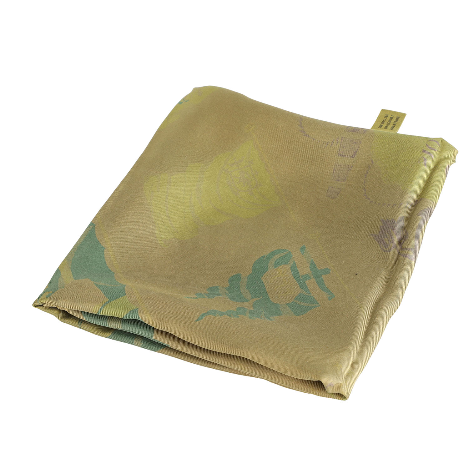 by Philippe Ledoux, Entwurf erstmals erschienen 1964. 100% Seide. nautisches Flaggenmotiv, überwiegend in Grüntönen. Handrollierte Säume. 90 x 90 cm. Tragespuren und Flecken vorhanden.