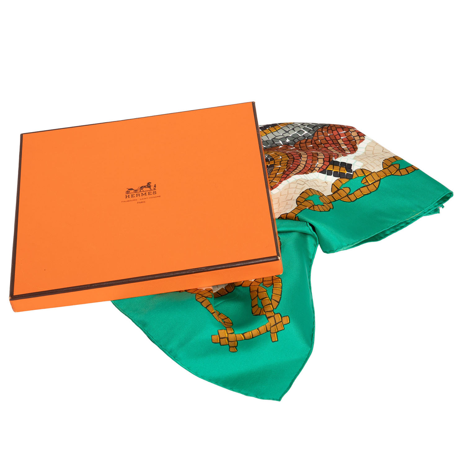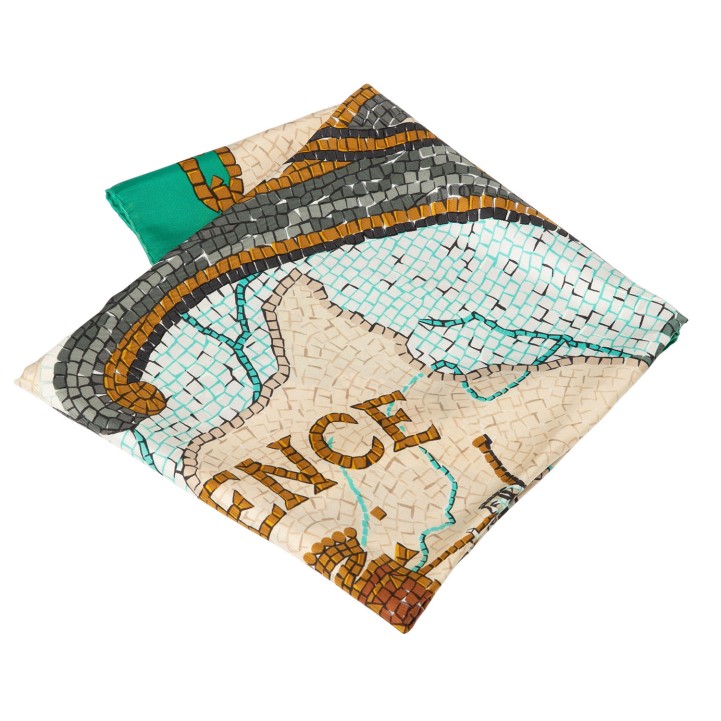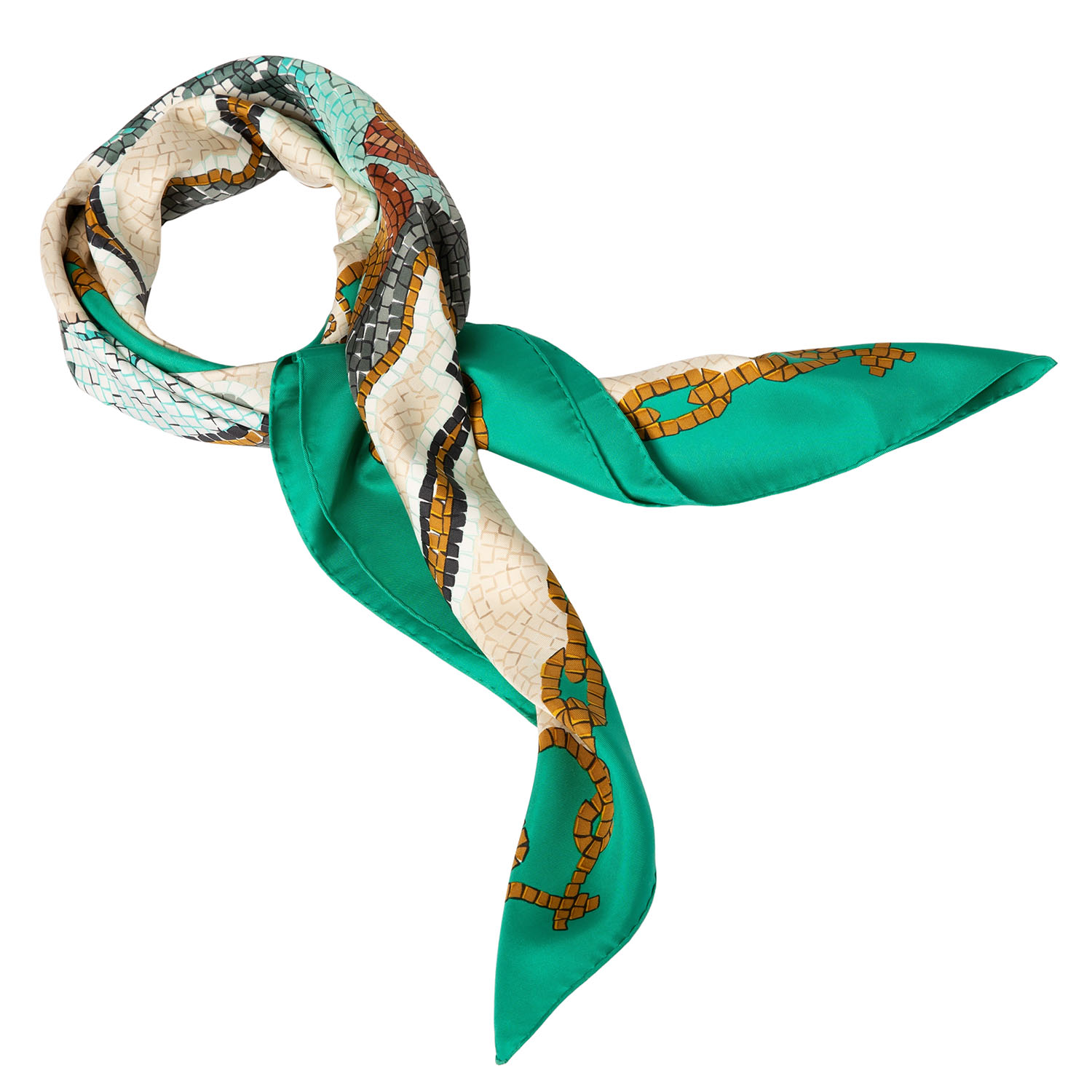 by Hugo Grygkar, Entwurf erstmals erschienen 1956. Akt. NP.: 495,-€. 100% Seide. Mosaik-Design. 90 x 90 cm. Handrollierte Säume. Box anbei. Gezogene Fäden, diverse Gebrauchsspuren vorhanden.