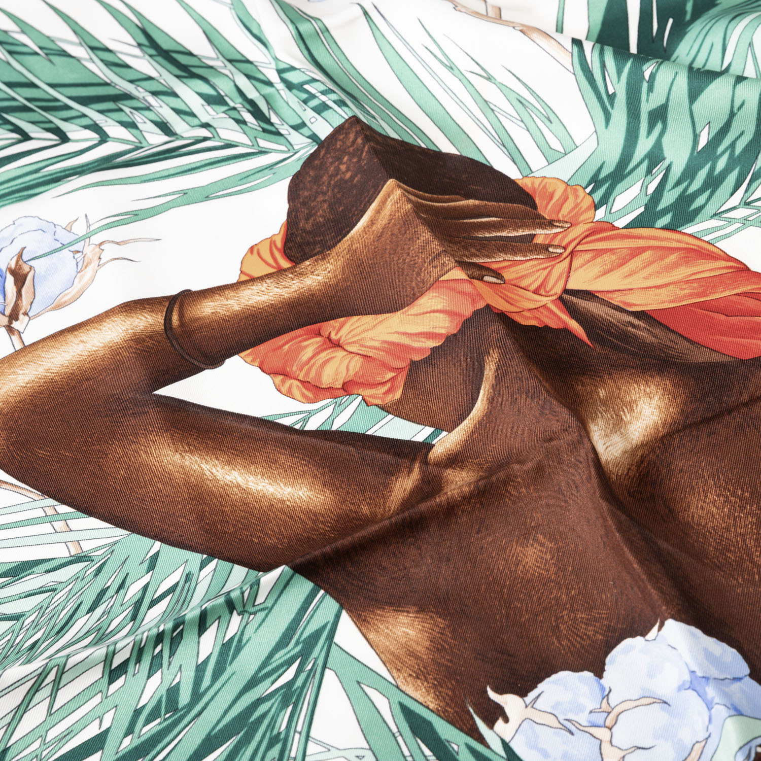 by Michelle Szabo, Entwurf erstmals erschienen 1997. Akt. NP.: 530,-€. 100% Seide. Farbenfrohe, kunstvoll gebundene Turbane, die afrikanische Königinnen und ihre kulturelle Vielfalt symbolisieren. Das Tuch feiert Eleganz, Tradition und weiblichen Stolz. 90 x 90 cm. Handrollierte Säume. Tragespuren vorhanden.