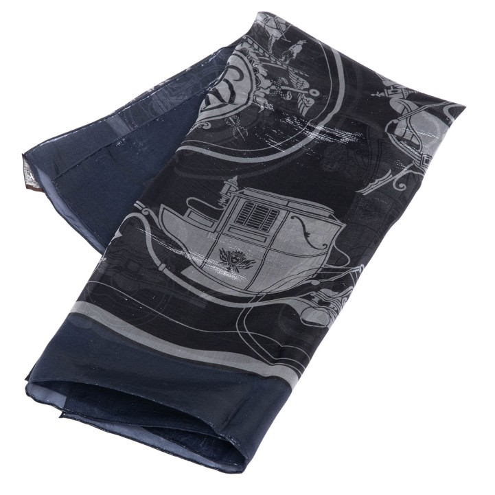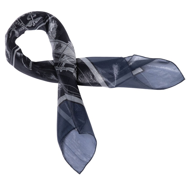 51% Seide, 49% Polyester in Schwarz-Nachtblau, leicht transparent mit Metallic-Effekt. Gereinigt, guter Erhalt. 62x62cm.