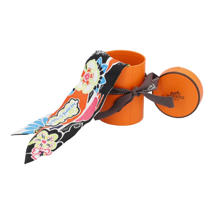Klassisches, kleines Twilly aus 100% Seide mit schwarzem Grund und floraler Musterung in Multicolor. Box anbei. Sehr guter Erhalt. 85x5cm.