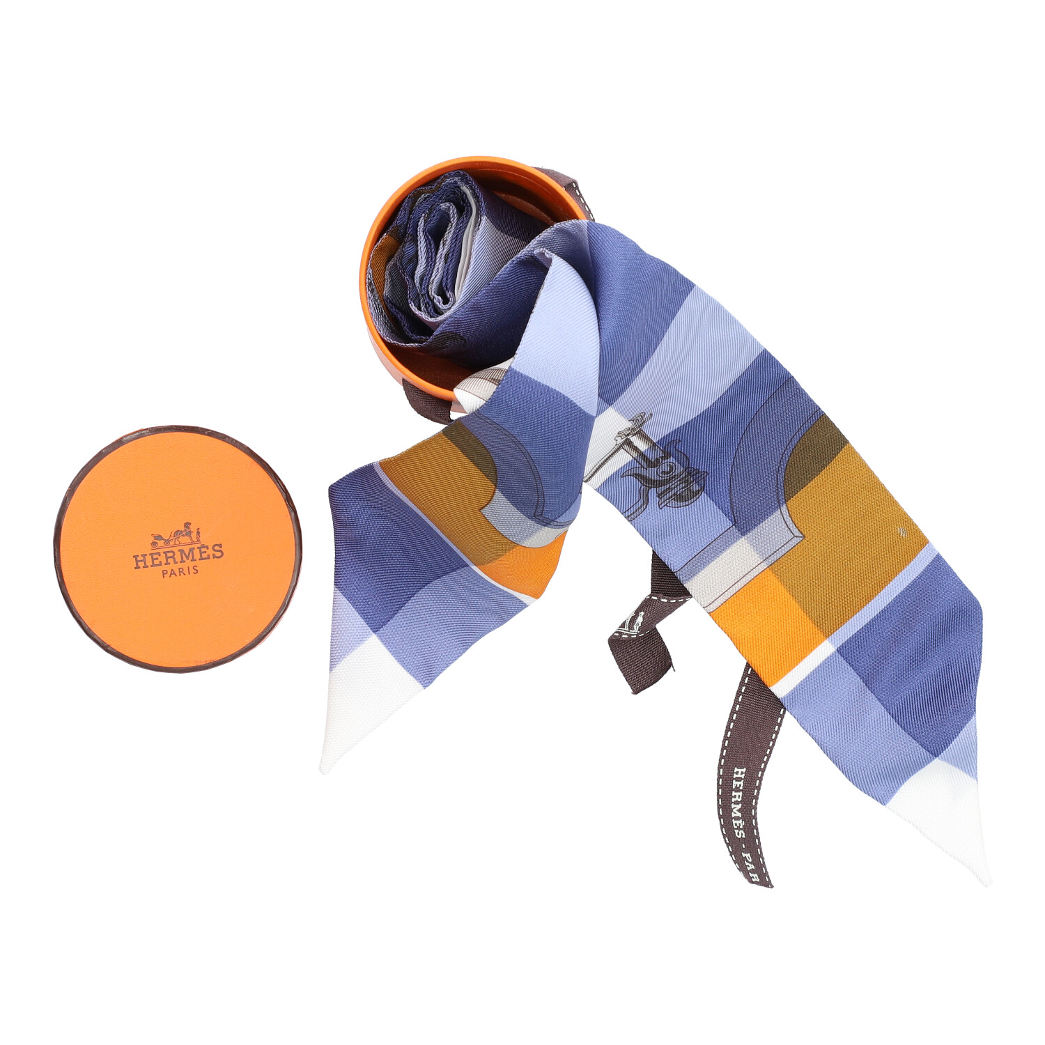 100% Seide. Kariertes Modell in Blau, Weiß und Orange mit grauem Kettendesign. 5 x 86 cm. Box anbei. Flecken vorhanden.