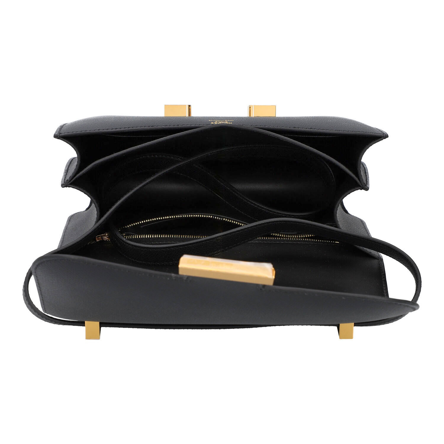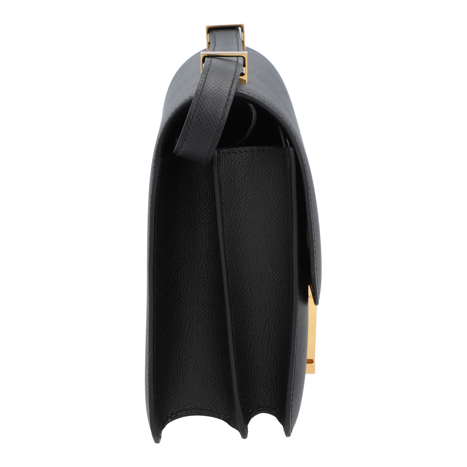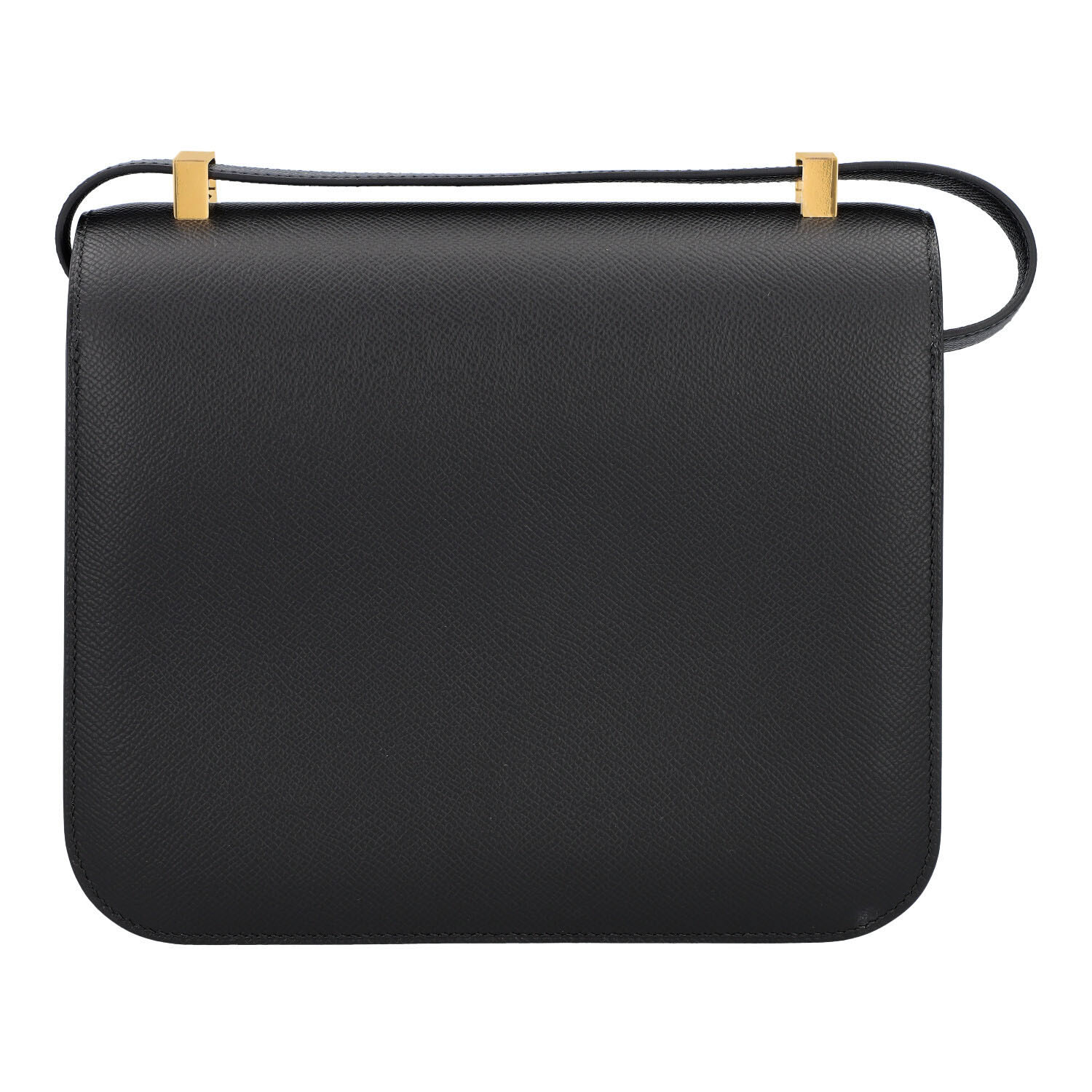 Epsom Leder in Schwarz mit vergoldeter Hardware, Constance-Schließe am Überschlag und Schulterriemen. Innenraum mit zwei Abteilen und zei Fächern, eines mit Reißverschluss. Staubbeutel anbei. Sehr guter Zustand! Dezente, sehr leichte Kratzer auf der Innenseite des Überschlags.