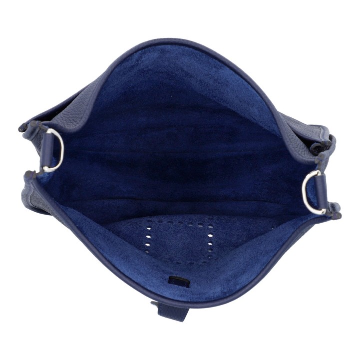 Clémence-Leder in Dunkelblau mit palladierter Hardware, perforiertem Logo, Lasche mit Druckknopfverschluss, Außenfach und abnehmbarem, längenverstellbarem Schulterriemen aus Textil. Guter Zustand.