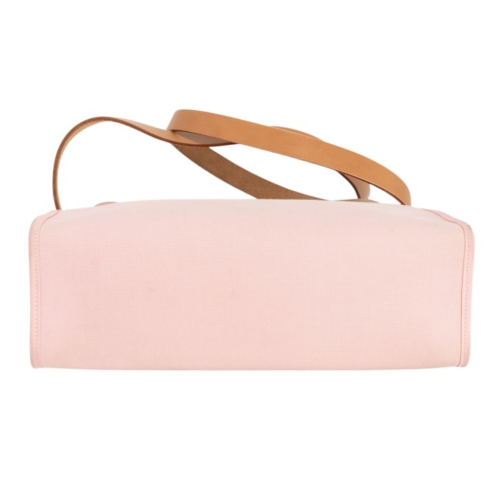 Toile Officier in Rosa mit Hunter-Rindsleder und Clou de Selle-Schließe. Außentasche mit Reißverschluss auf der Rückseite, Tragegriff und Schulterriemen. Innen herausnehmbare Reißverschlusstasche. Box, Staubbeutel, Schloss mit Schlüssel in Clochette anbei. Gebrauchsspuren und Flecken vorhanden.