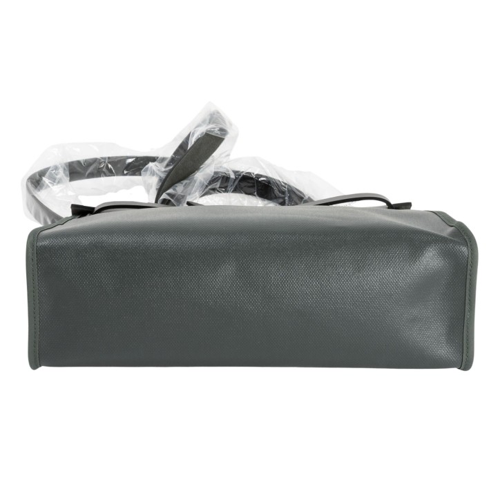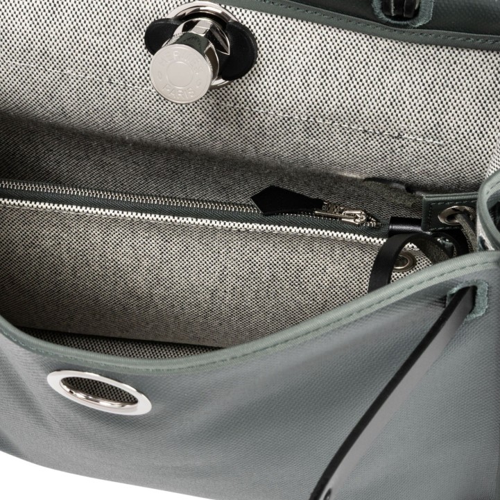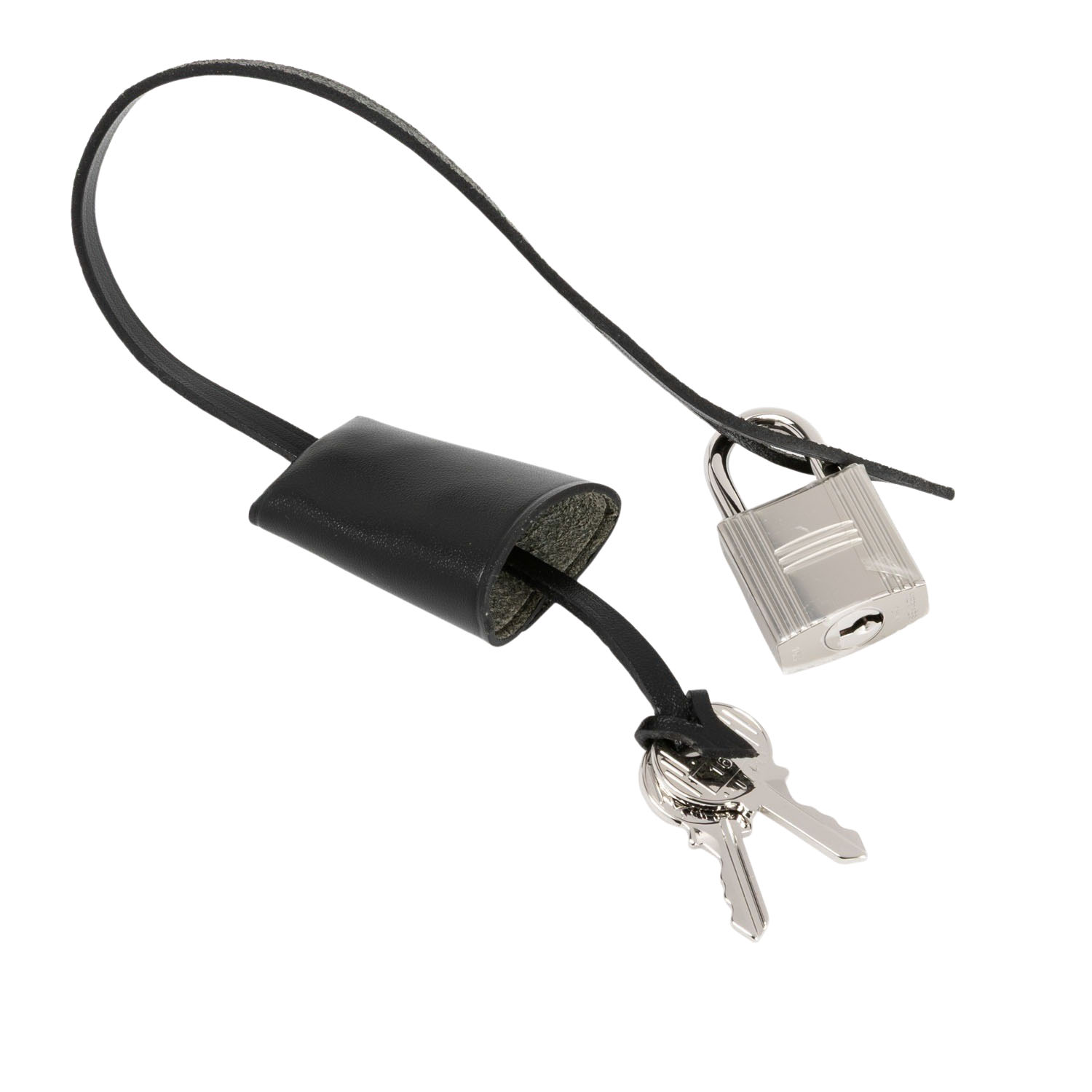 Beschichtetes Toile in Vert Mangrove mit schwarzem Vache-Hunter-Leder und Clou-de-Selle-Schließe, Außentasche mit Reißverschluss auf der Rückseite, Tragegriff und Schulterriemen. Box, Staubbeutel, Pochette, Kopie der Rechnung, Schlüssel in Clochette sowie Schloss anbei. Neuwertig.