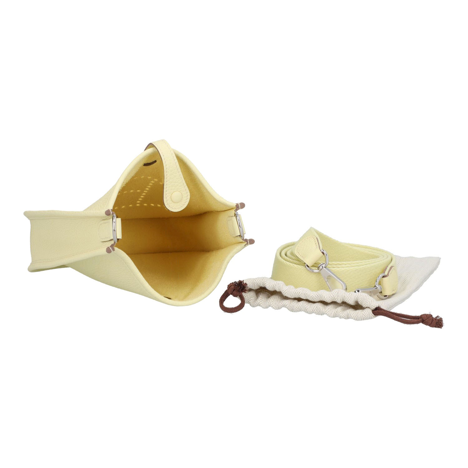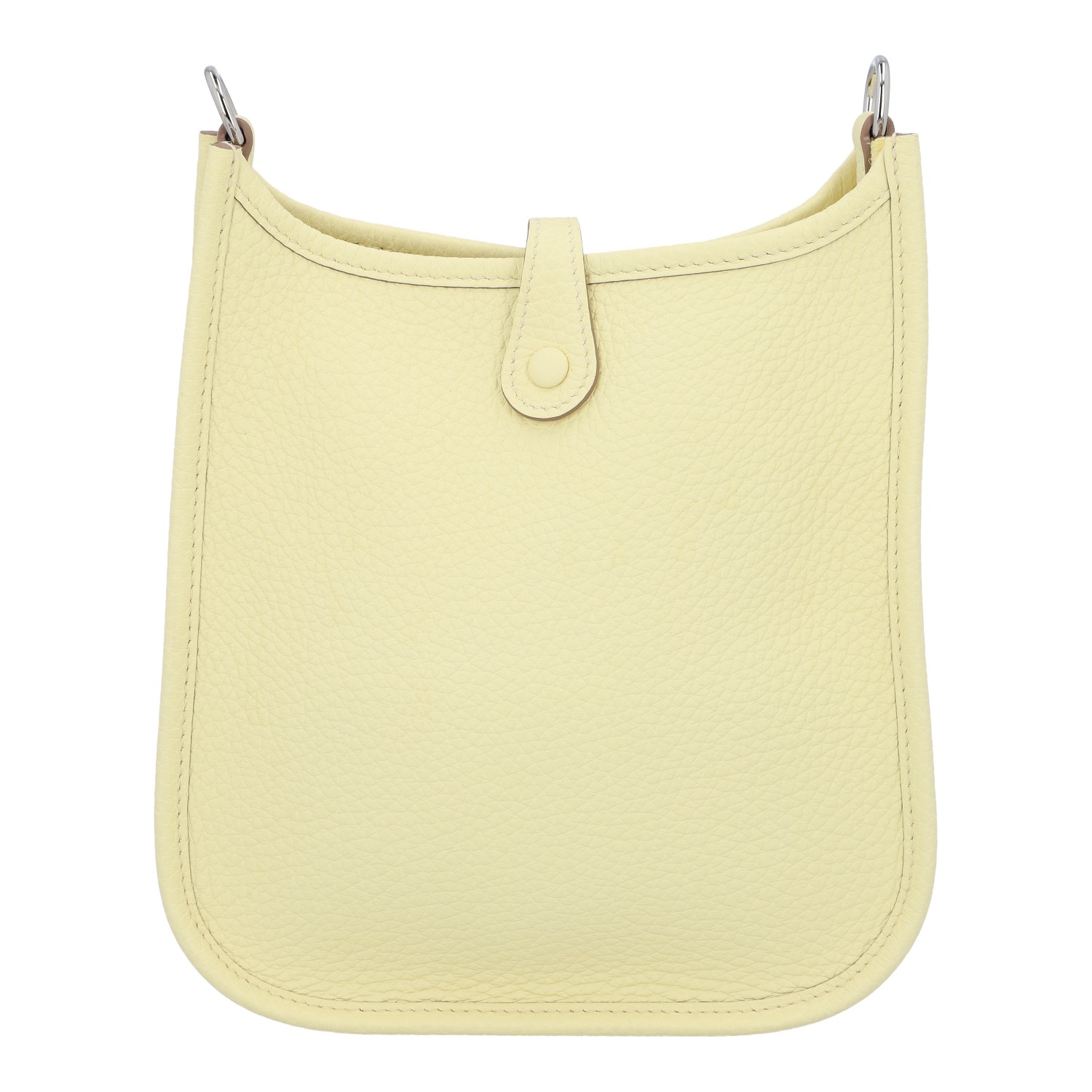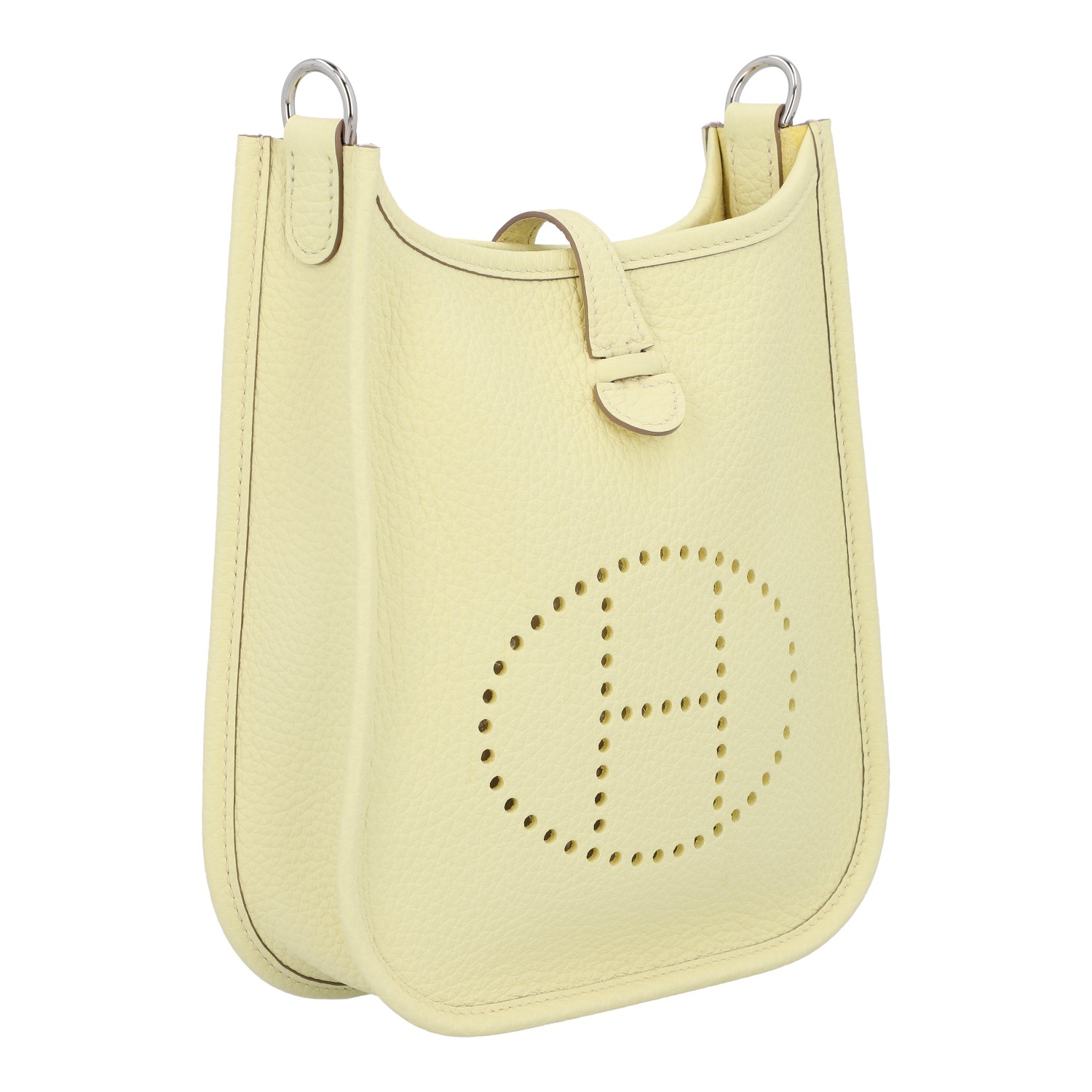 Taurillon Clemence Leder im Farbton Jaune Milton mit Schulterriemen aus Textil. Silberfarbene Hardware, perforiertes H auf der Front und Lasche mit Druckknopf als Verschluss. Box, Staubbeutel und Rechnung anbei. Neuwertig.