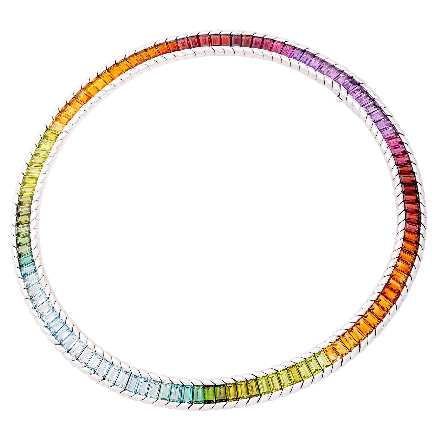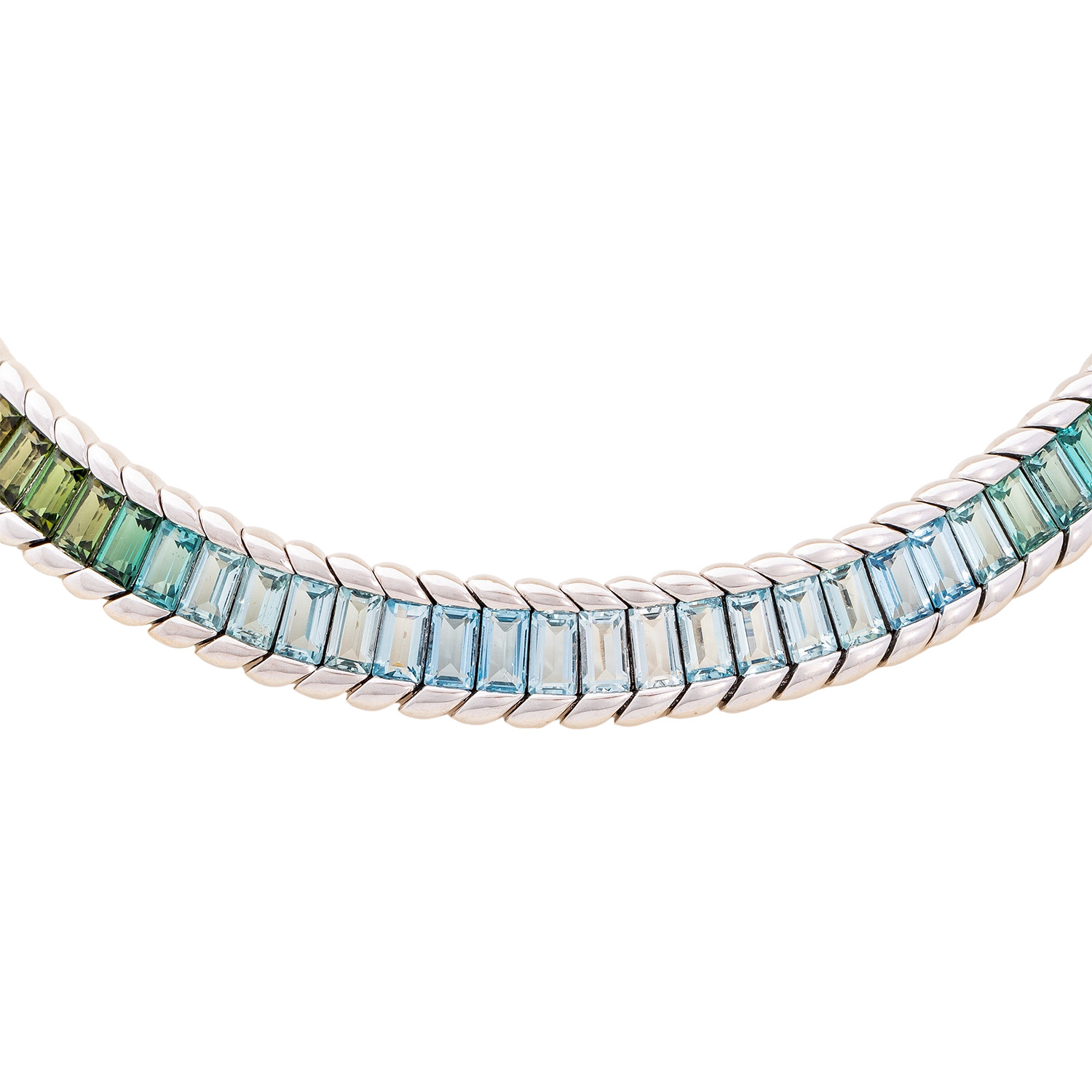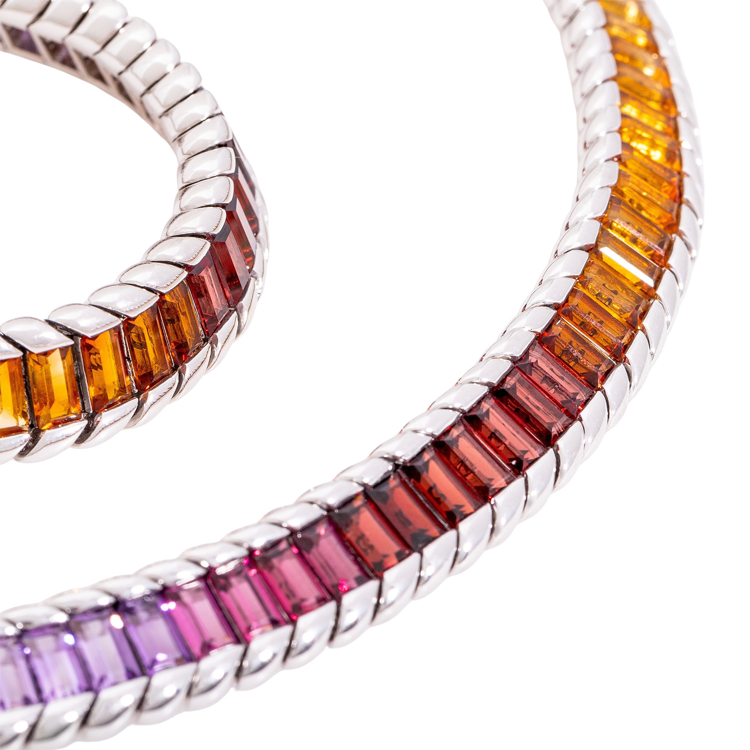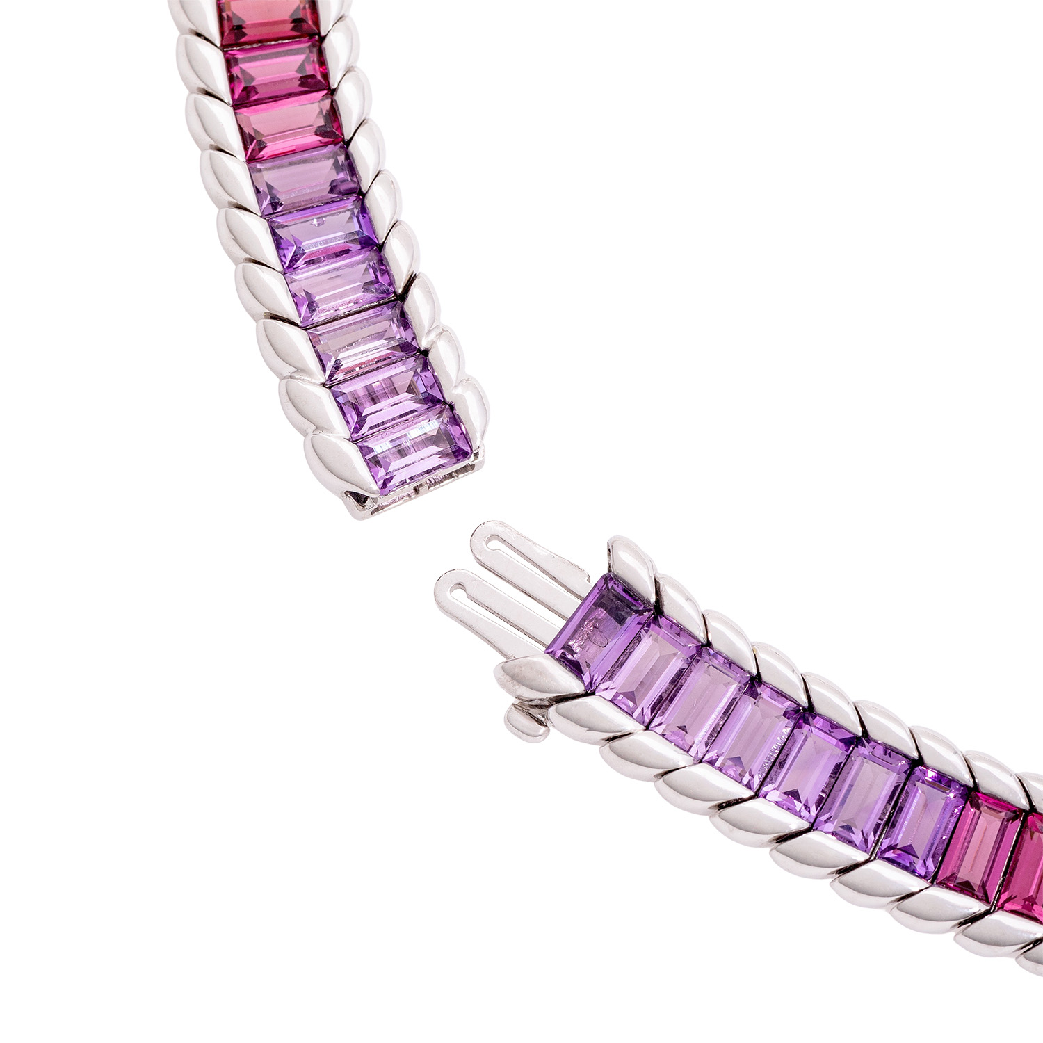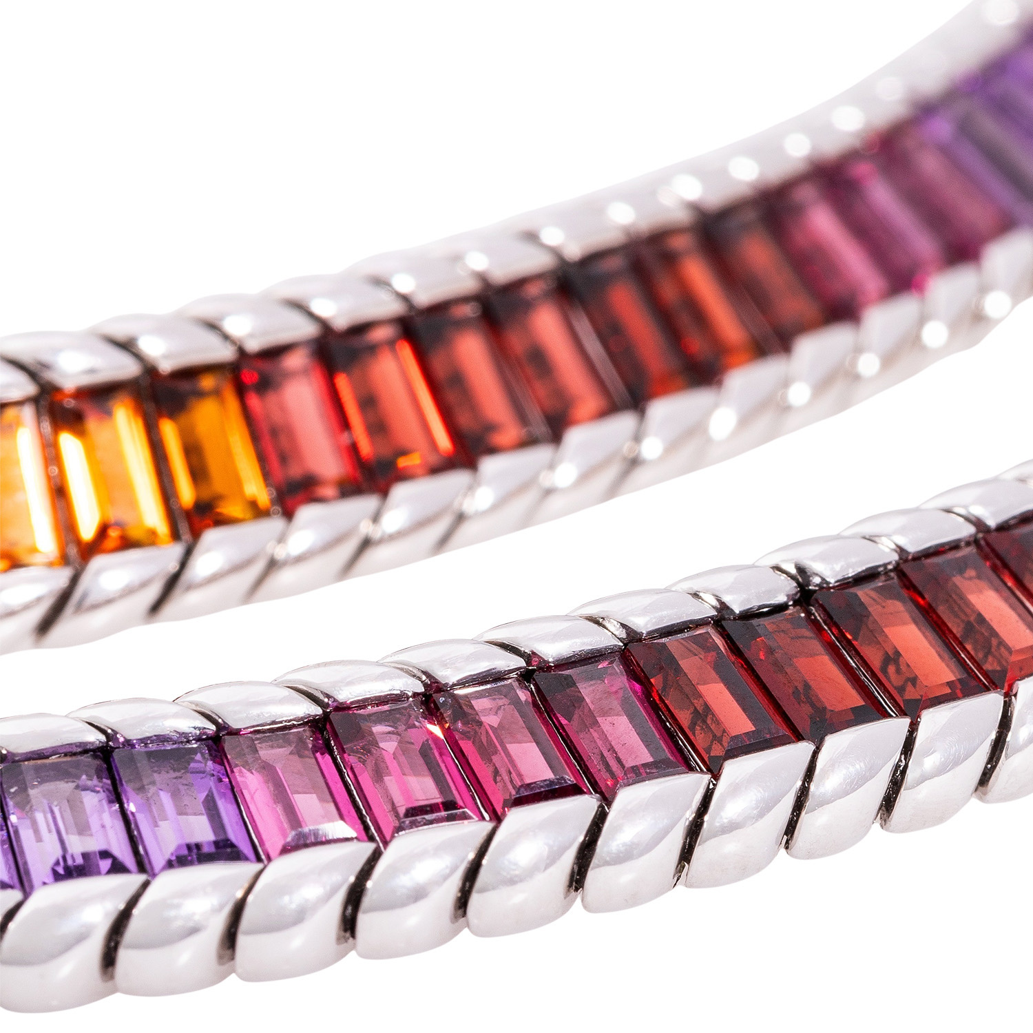von zus. 717, 87 ct, gefasst sind: 13 Amethyste, 21 Granate, 30 Citrine, 14 Peridots, 18 Turmaline und 16 Aquamarine im Baguetteschliff, 1 Stein leicht best., WG 18K, 144 g, L: ca. 42 cm, B: ca. 11,6 mm, Ende 20./Anfang 21. Jh., Tragespuren, mit Herstellerpunze und DEGEB-Gutachten Nr.: 14726 anbei mit einem Wiederbeschaffungswert von 29.300 € (06/2017).