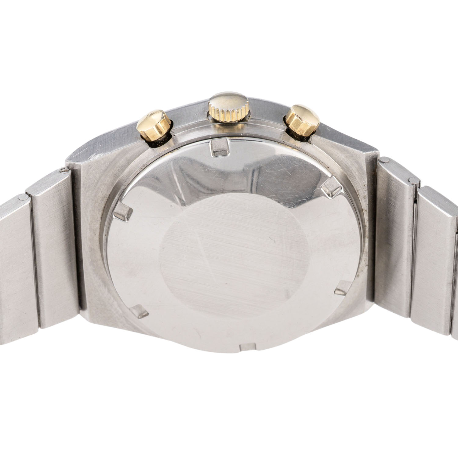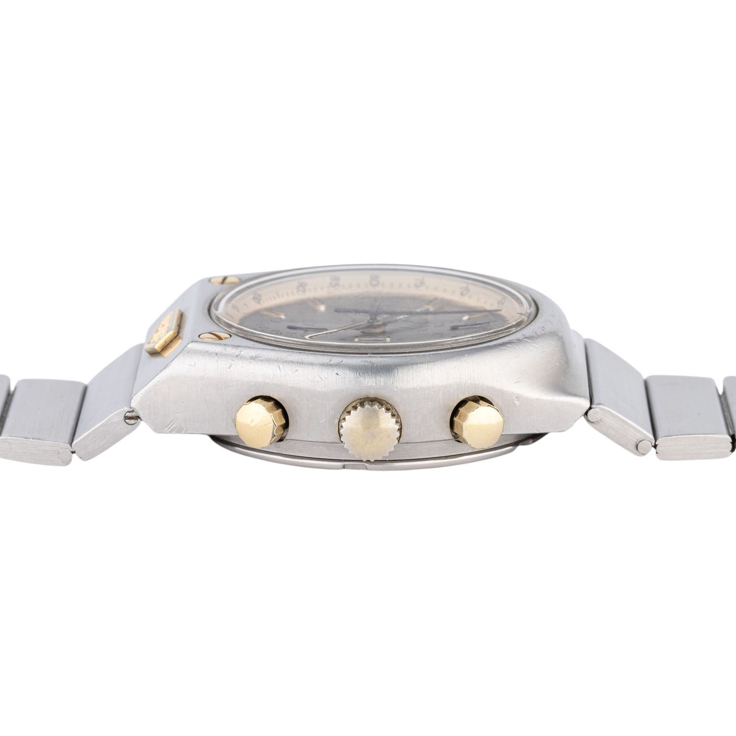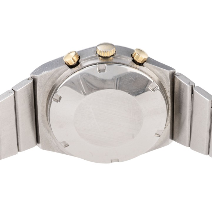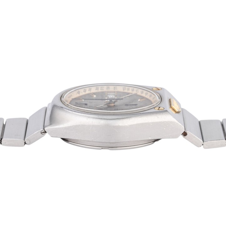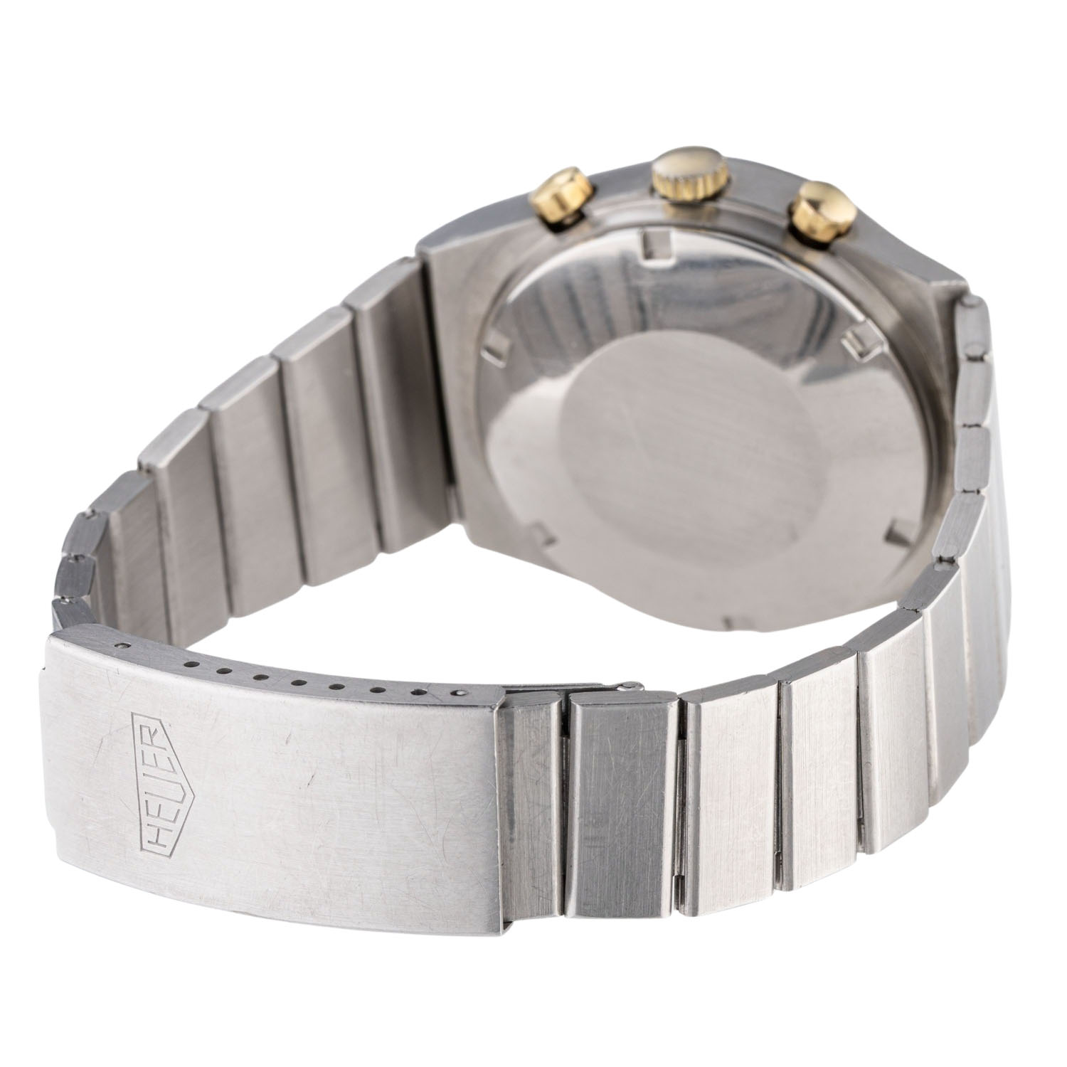 Edelstahl / vergoldet. Seriennummer 364386. Automatik-Werk Kal. Valjoux 7750 mit sehr guten Gangwerten (+9 s/d. 292° Amplitude). Graues Zifferblatt mit aufgesetzten Indizes, 3 Totalisatoren, kleiner Sekunde und Anzeige von Wochentag und Datum. Innenlünette mitTachymeter Skala. Heuer Edelstahl Armband mit Faltschließe. Gebraucht, sichtbare Tragespuren am Gehäuse, Armband und am Glas (mehrere feine Kratzer). Durchmesser ca. 39 mm (gemessen ohne Krone). Passend bis zu ca. 20,5 cm Handgelenkumfang.