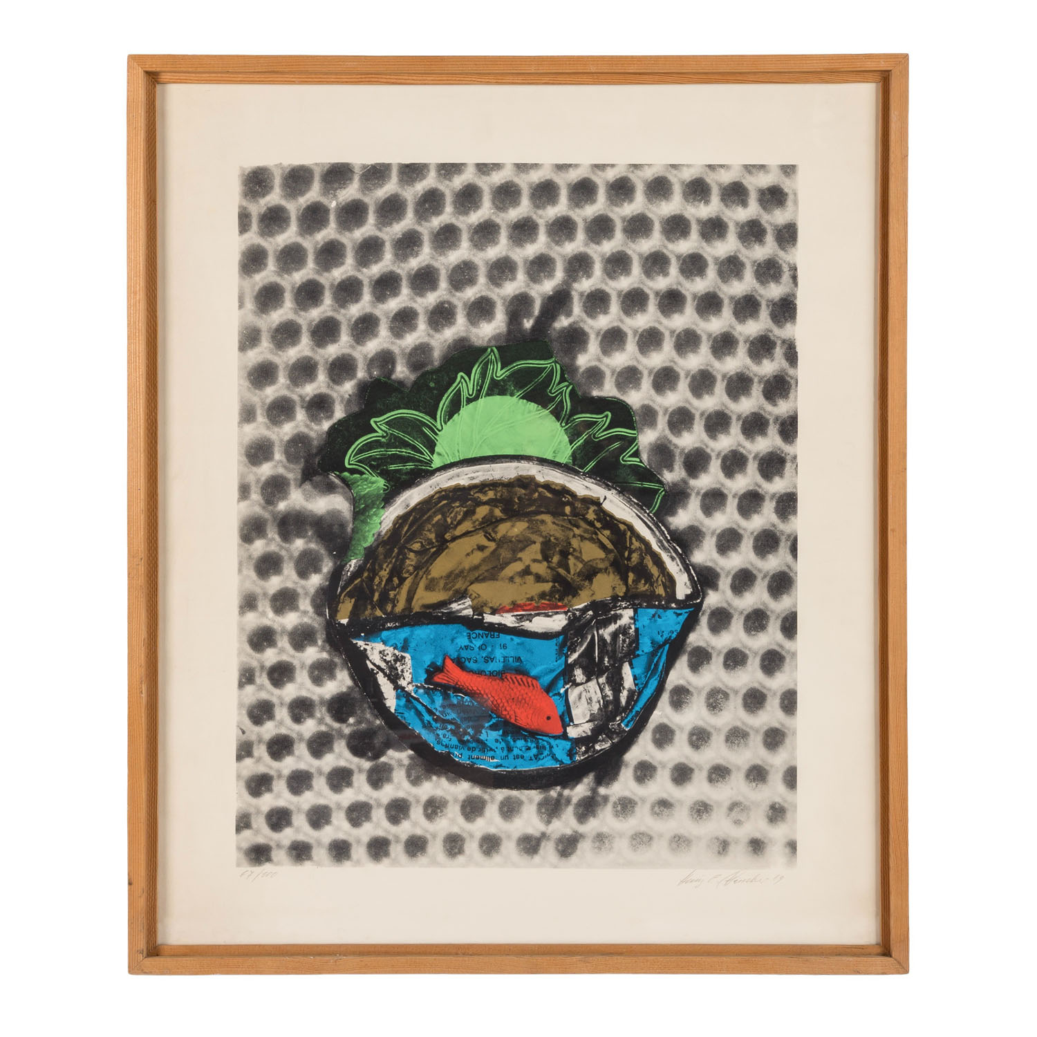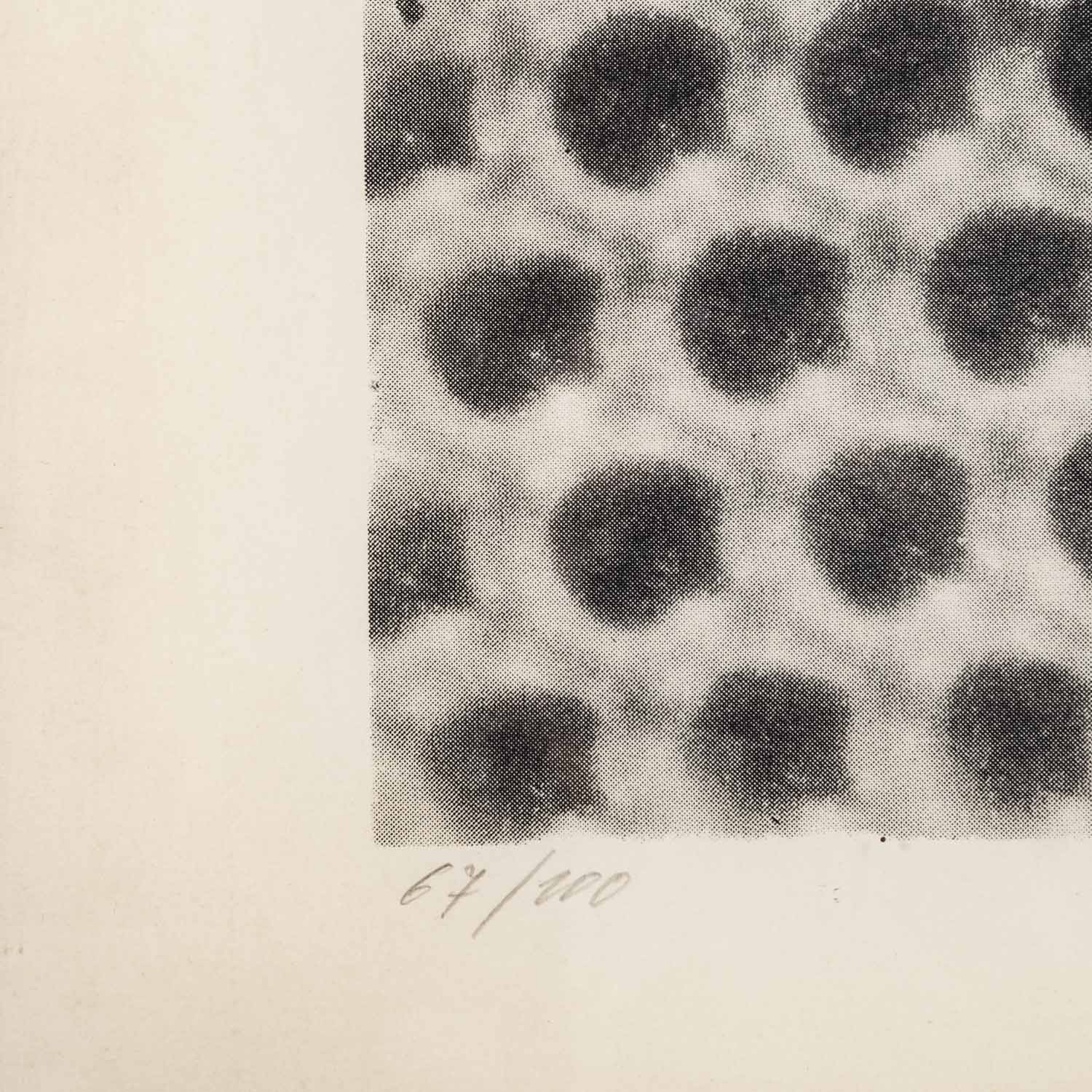 Serigraphie/Papier, u.re. mit Bleistift von Hand signiert und datiert, u.li. mit Bleistift num. 67/100, HxB: Platte ca. 62x49 cm, Blatt ca. 75,5x62,5 cm, Außenmaße Rahmen ca. 80x68 cm. Altersspuren, gebräunt und leicht gewellt. Mit verglastem Rahmen.