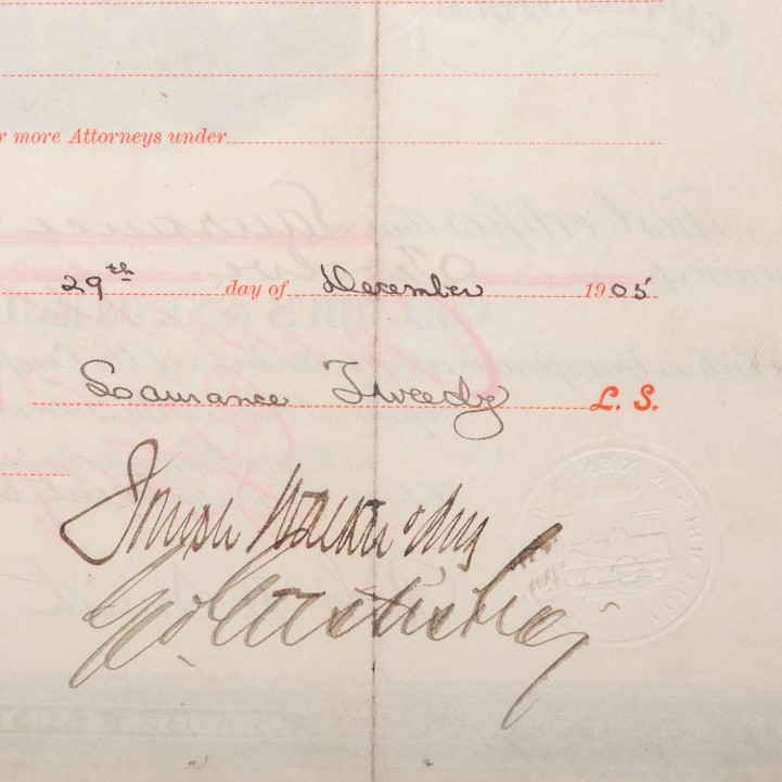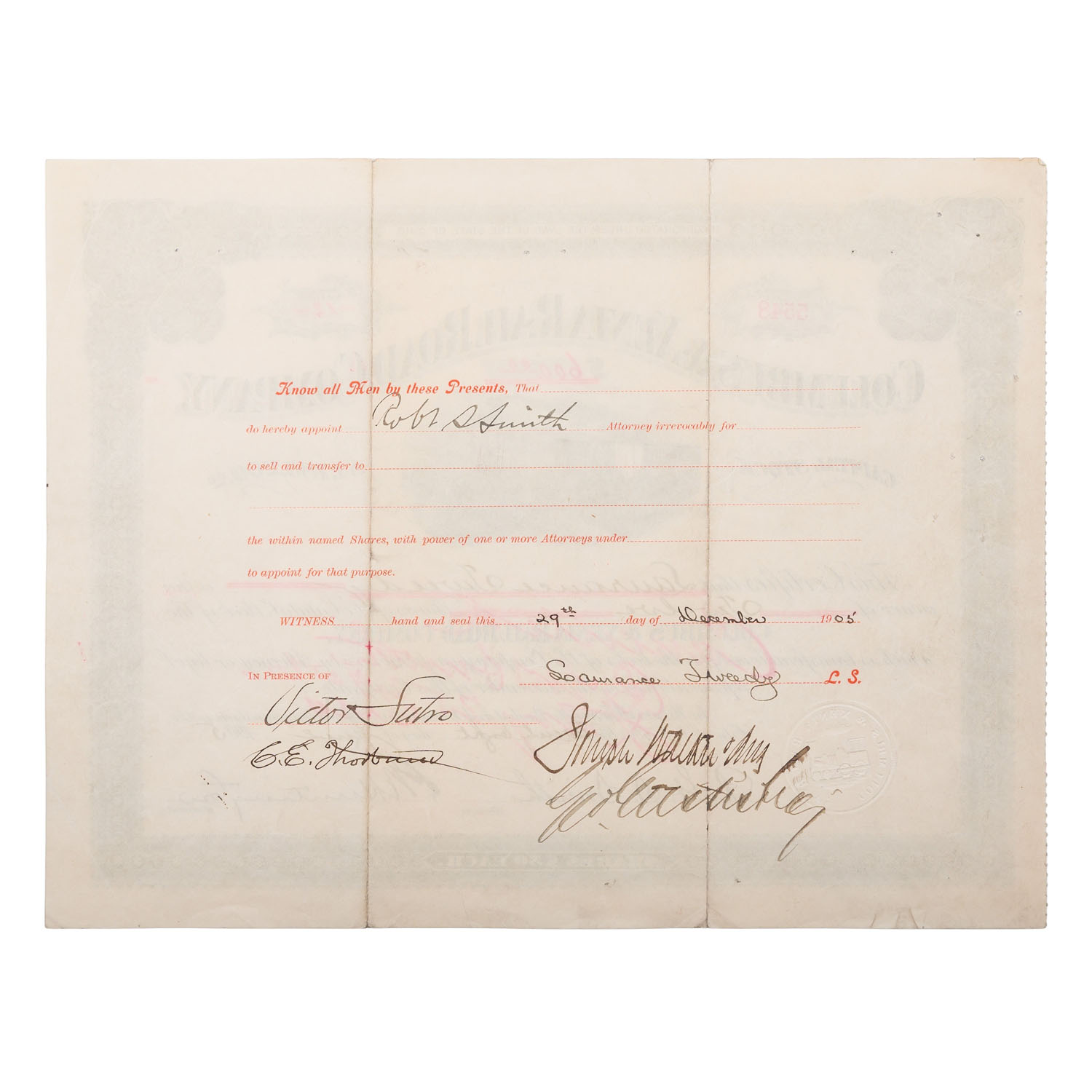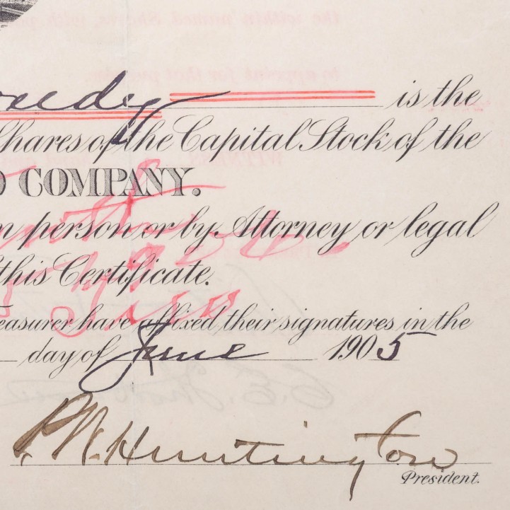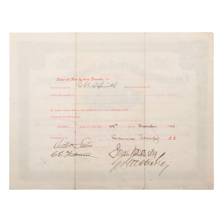 Aktie über 12 shares zu je $ 50, mit diversen handschriftlichen Signaturen, ausgestellt am 28. Juni 1905, Alters- und Beriebsspuren, Falt- und Knickspuren.