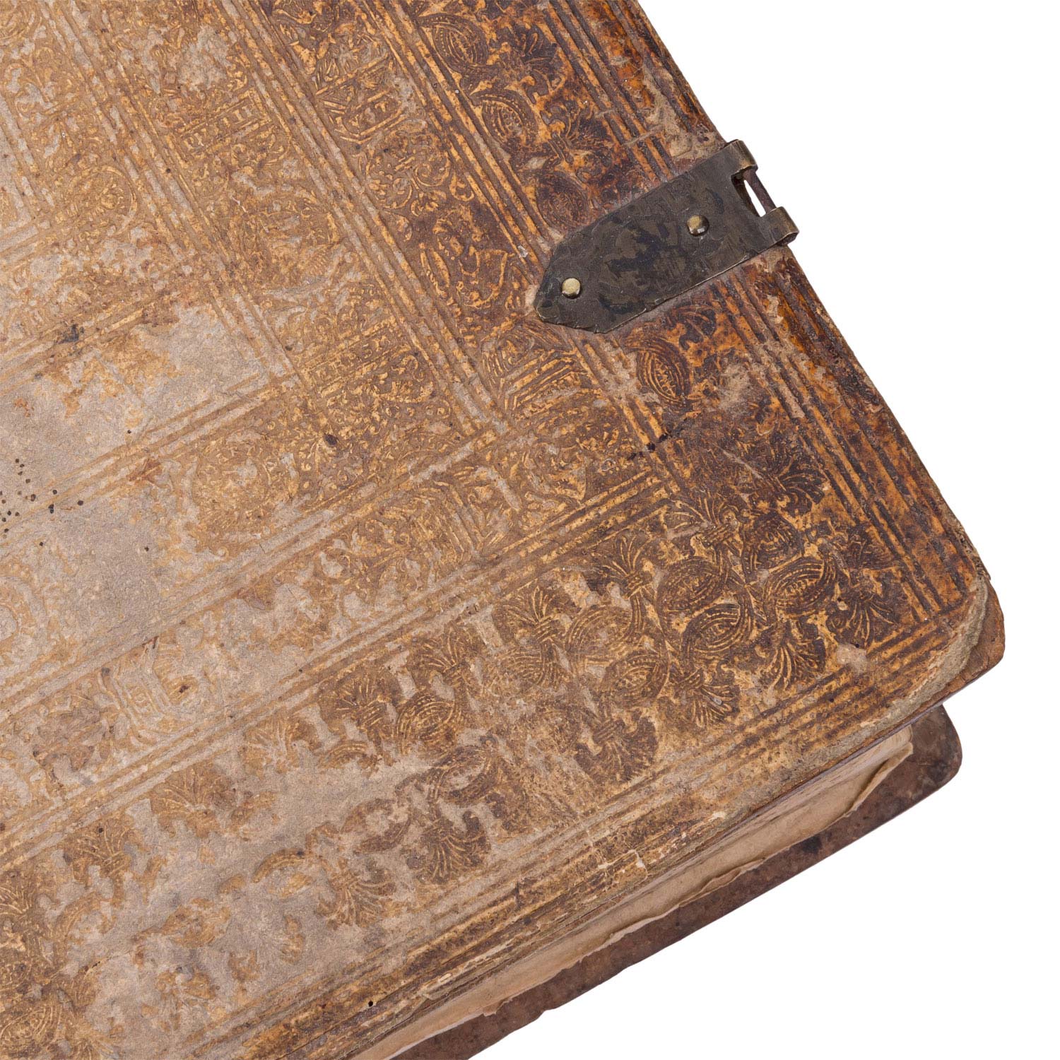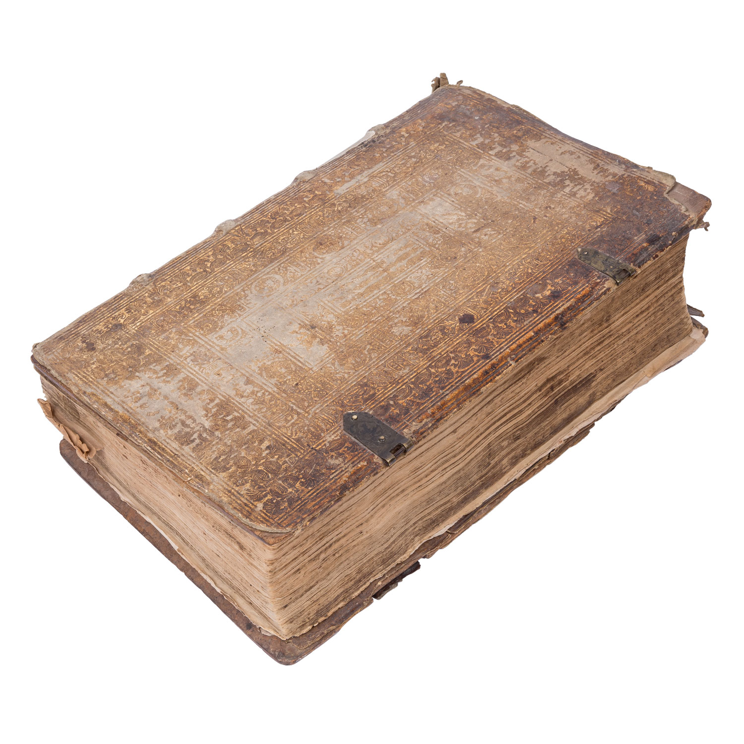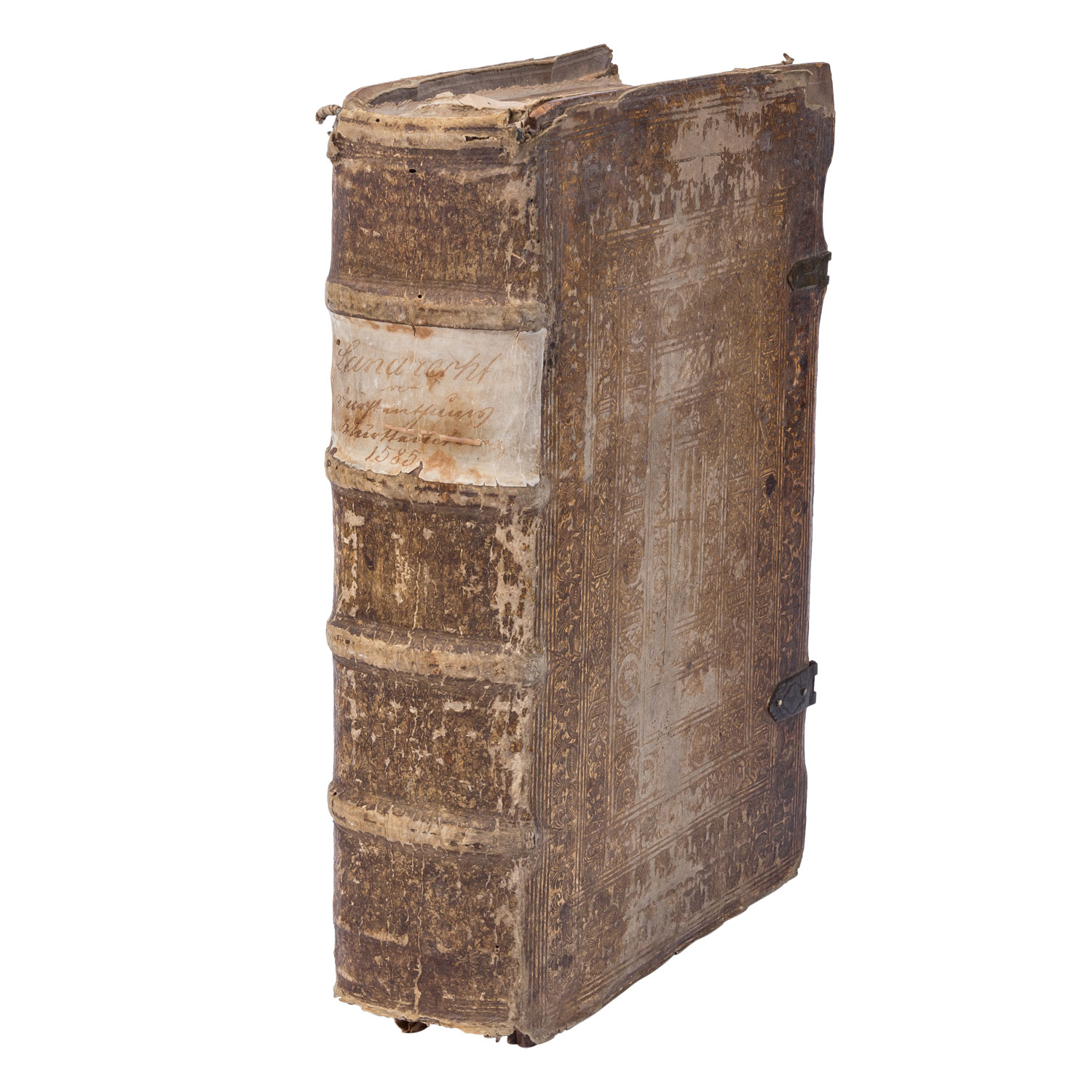 'Des Fürstenthumbs Würtemberg gemein Landtrecht/ in vier Theil verfaßt.' Nicht kollationiert. Mit deutlichen Alters-und Gebrauchsspuren, Verfärbungen, Einrisse, Knicke, starker Abrieb, handschriftliche Notizen, Wurmlöcher, Einband beschädigt mit Fehlstellen, verstärkende Holzplatte des Einbands gebrochen, Flecken, Seiten partiell restauriert, Seiten z.T. lose, Stockflecken.