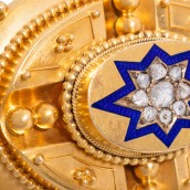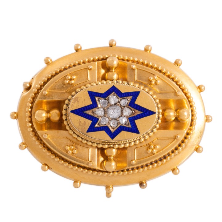 blau emailliertem Stern, Granalien- und Kordeldrahtverzierungen, GG 14K, feuervergoldet, innen Metall,rückseitig Glasboden mit feiner Schmetterlingsdarstellung inliegend und Öse sowie Einhängemöglichkeit, 12,7 g, ca. 4x3 cm, Ende 19. Jh., altersgem. sehr schöner Erhalt