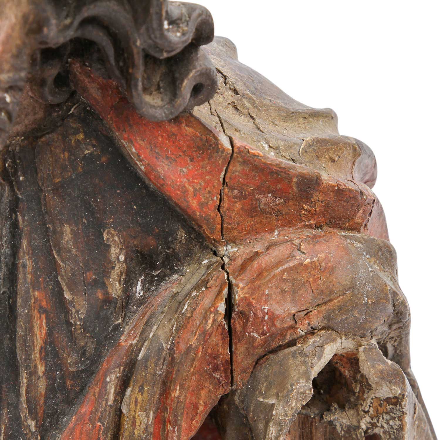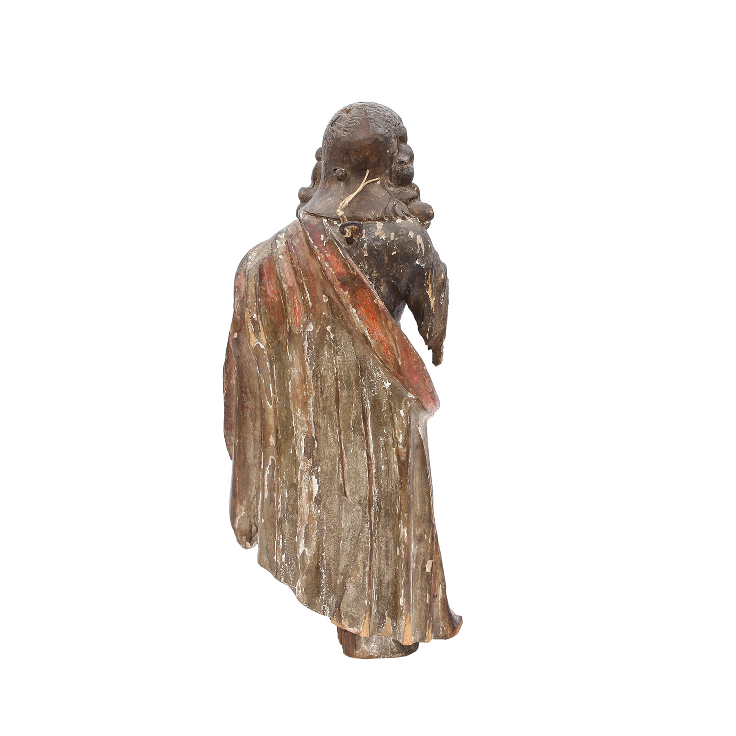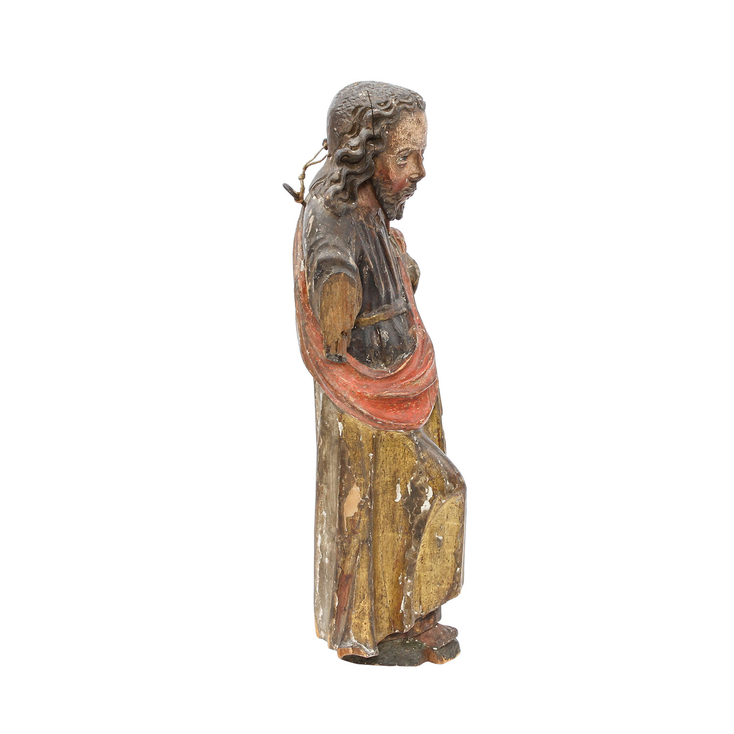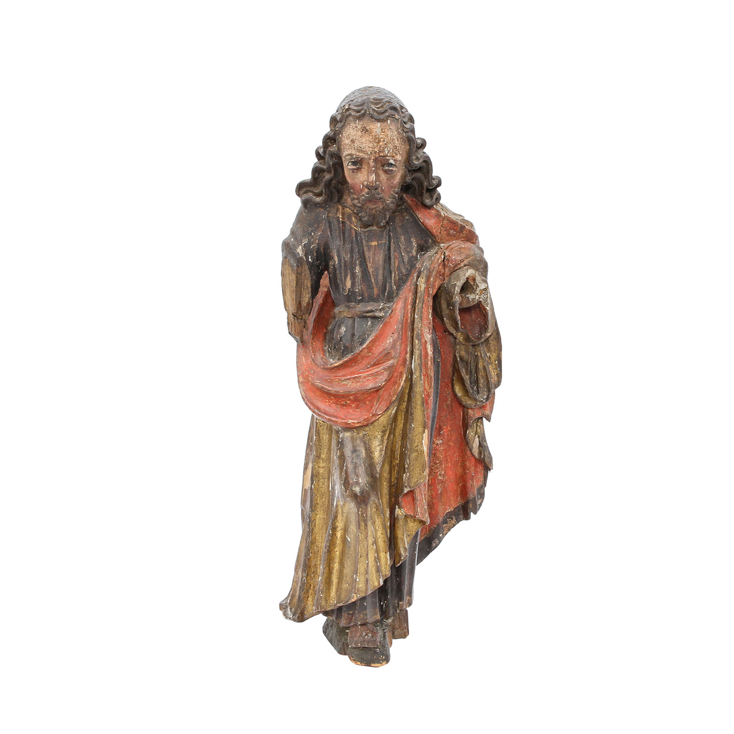 HL. APOSTEL Westfalen oder Niedersachsen, 15./16. Jh., Weichholz, vollrund geschnitzt, ältere farbige Fassung weitgehend übergangen, stehende Ganzfigur eines barhäuptigen Apostels, sein kennzeichnendes Attribut in der ehemals vorgestreckten rechten Hand ist verloren, doch die Figurenauffassung und besonders der Gesichtstypus sprechen für die Darstellung eines Apostels, H: 53 cm. Altersspuren.