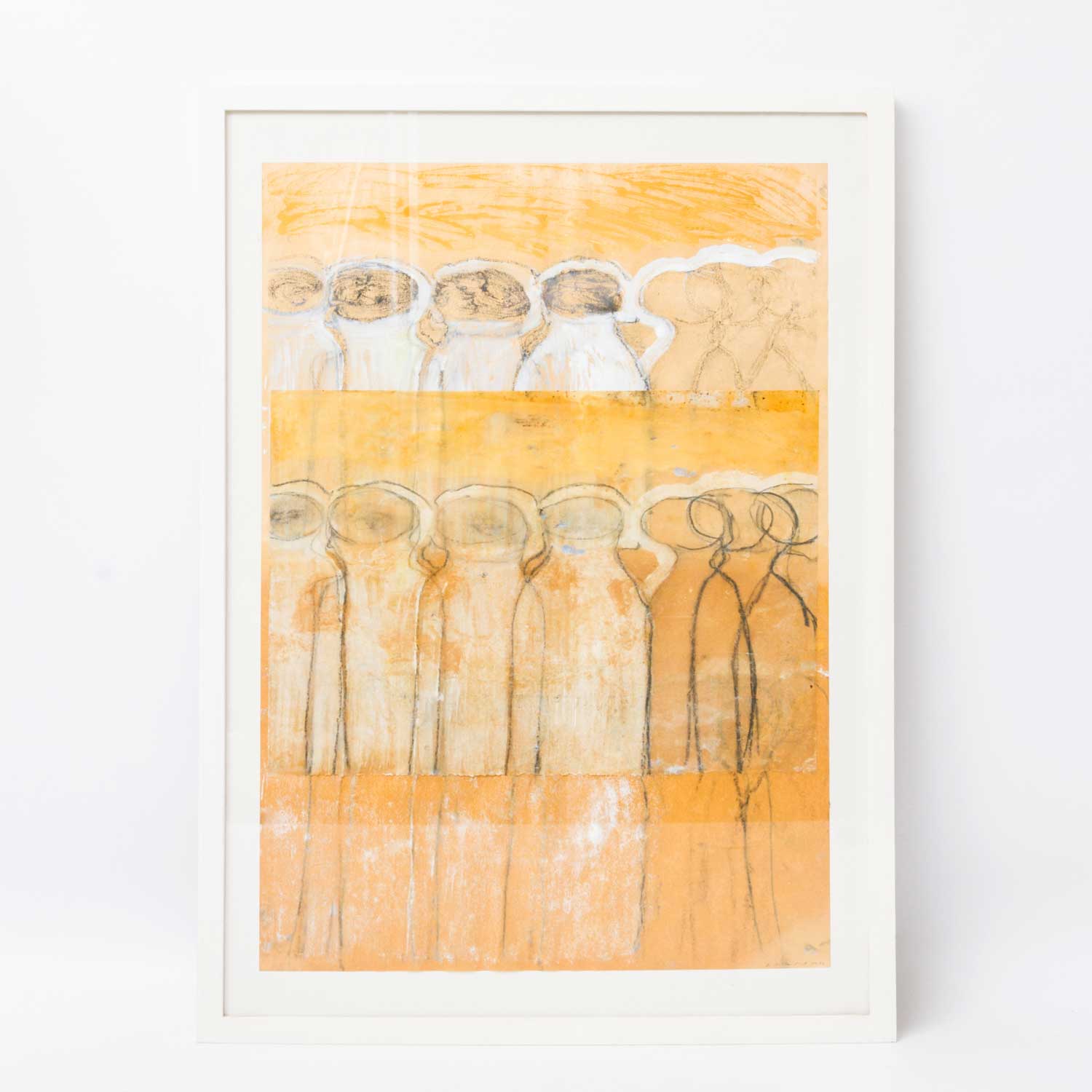 HOLLENBACH, M., wohl Misha (Künstler des 20./21. Jh.), "Ohne Titel", figürliche Komposition mit Gefäßen, u.re. sign. u. dat. 1999, collagierte Mischtechnik/Papier, 61,5x43 cm (73x52,5 cm mit Rahmen). Min. gewellt. Mit verglastem Rahmen. Min. Altersspuren.