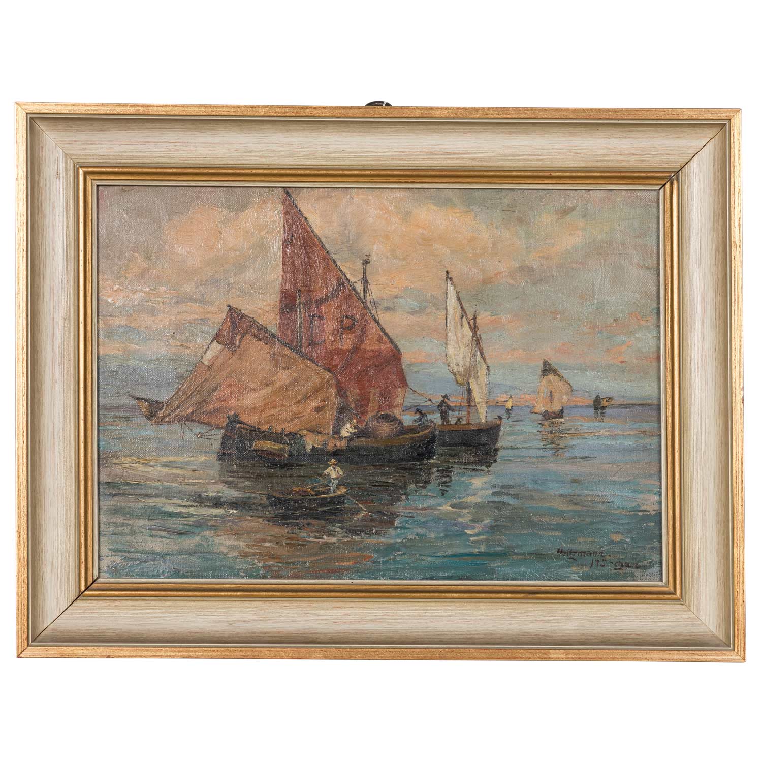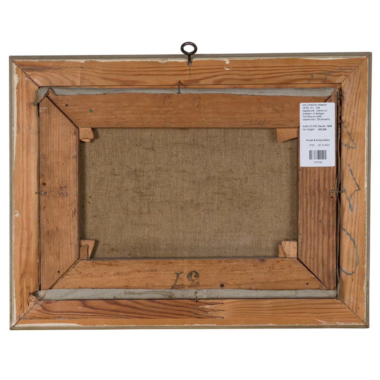 Szene von Arbeitern im fleißigen Fischfang auf alten Segelbooten, Öl/Leinwand, u.re. signiert 'Holtzmann München', HxB: 27x37 cm (35x46 cm mit Rahmen). Leichter Firnisgilb, minimal fleckig. Mit Rahmen (leicht beschädigt).