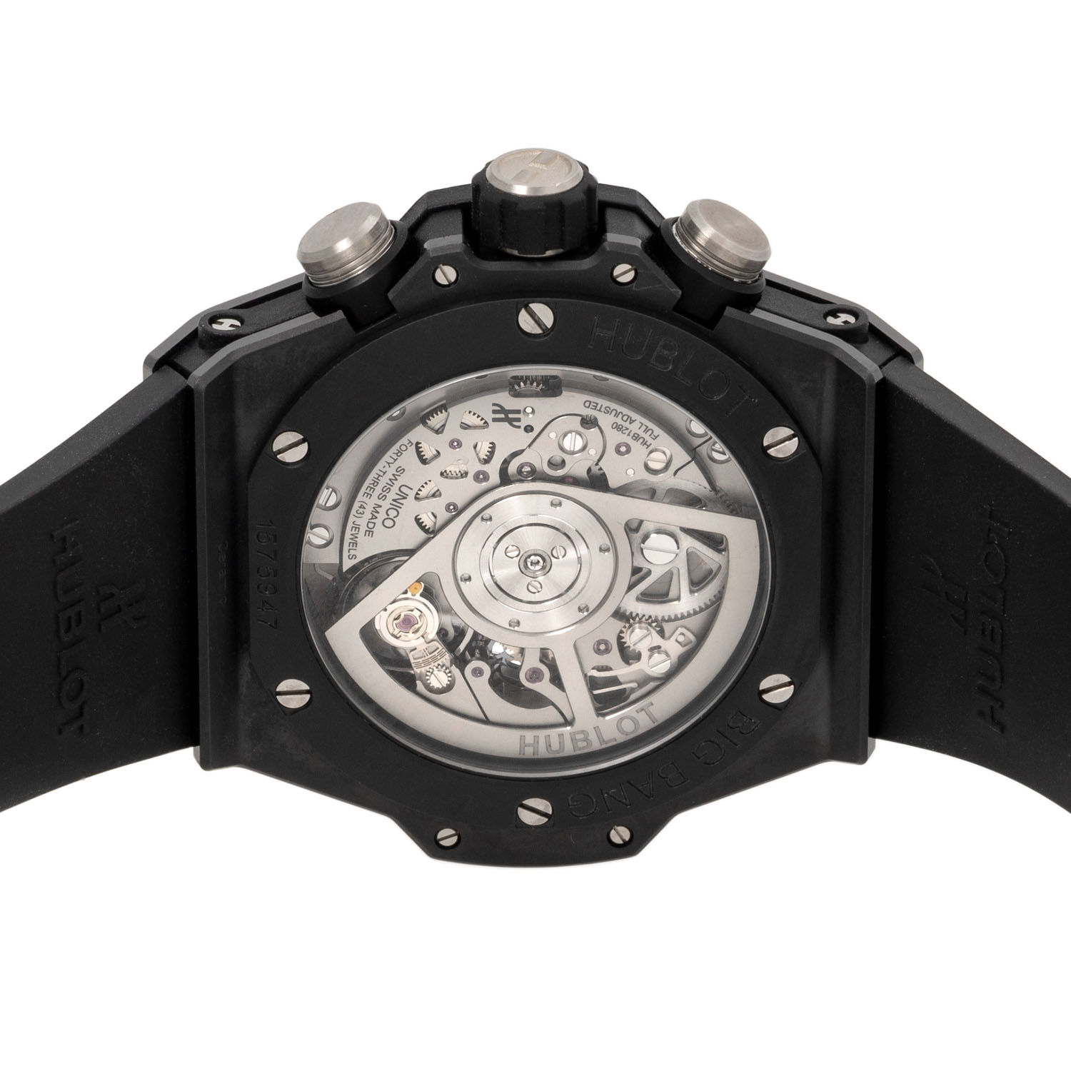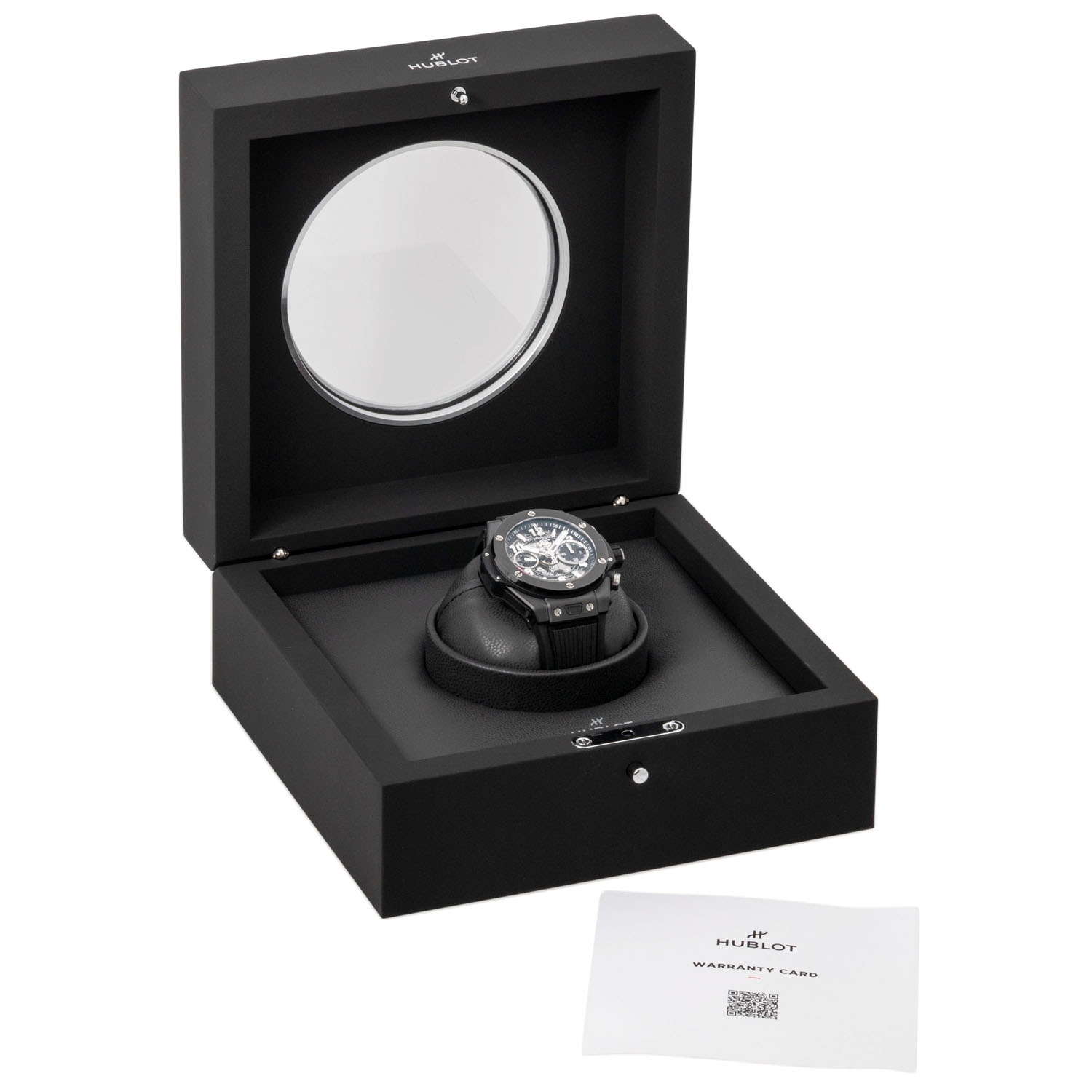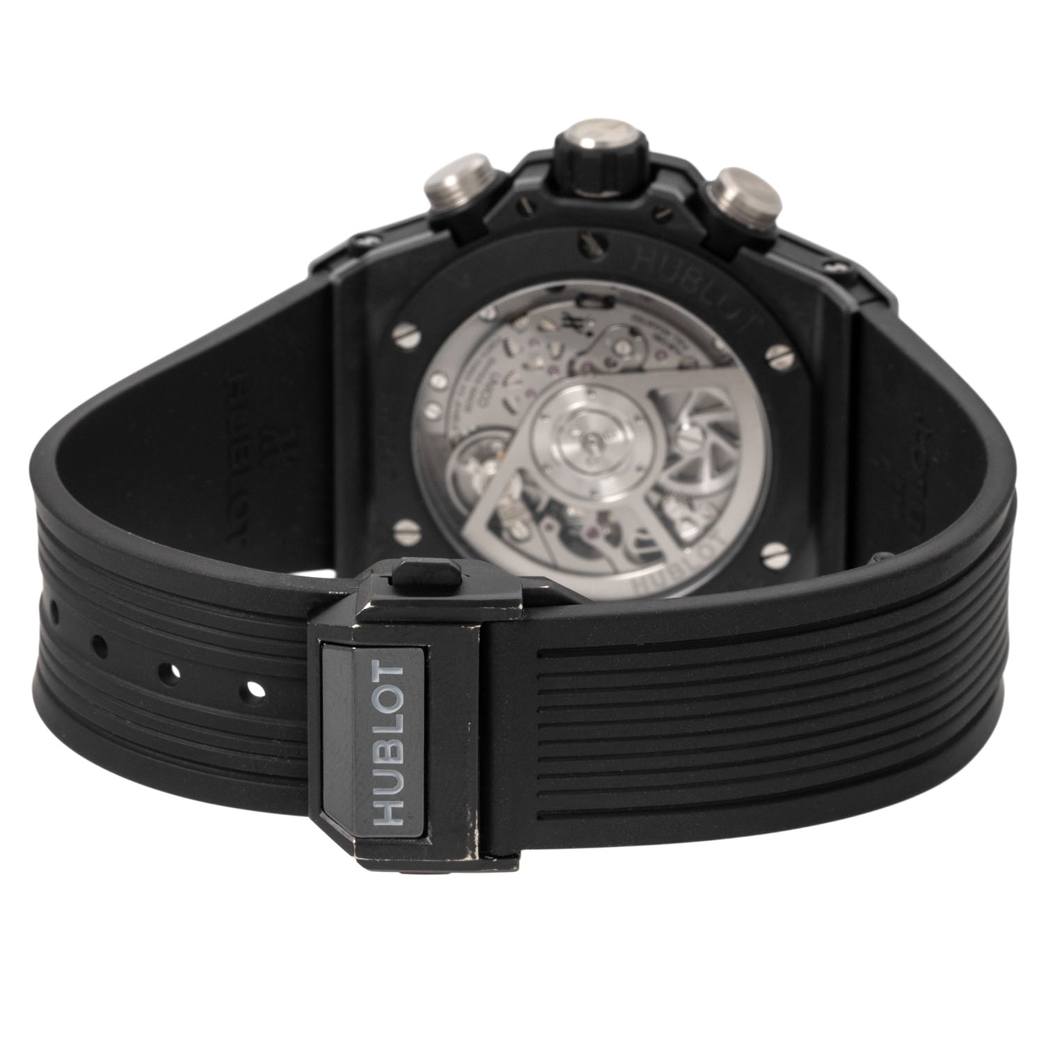 Keramik. Glasboden. Automatik-Werk Kal. HUB 1280 mit Flyback Funktion und sehr guten Gangwerten (+7 s/d. 312° Amplitude). Skelettiertes Zifferblatt mit aufgesetzten arabischen Ziffern, 2 Totalisatoren, kleiner Sekunde und Datumsanzeige. Hublot Kautschuk Armband mit Faltschließe aus Keramik und Titan. Guter Zustand mit leichten Tragespuren. Original Box, Erstkaufrechnung und Garantieschein anbei. Gekauft im Juni 2022 bei Juwelier Wempe in Stuttgart. Durchmesser ca. 42 mm (gemessen ohne Krone). Passend bis zu ca. 20 cm Handgelenkumfang.