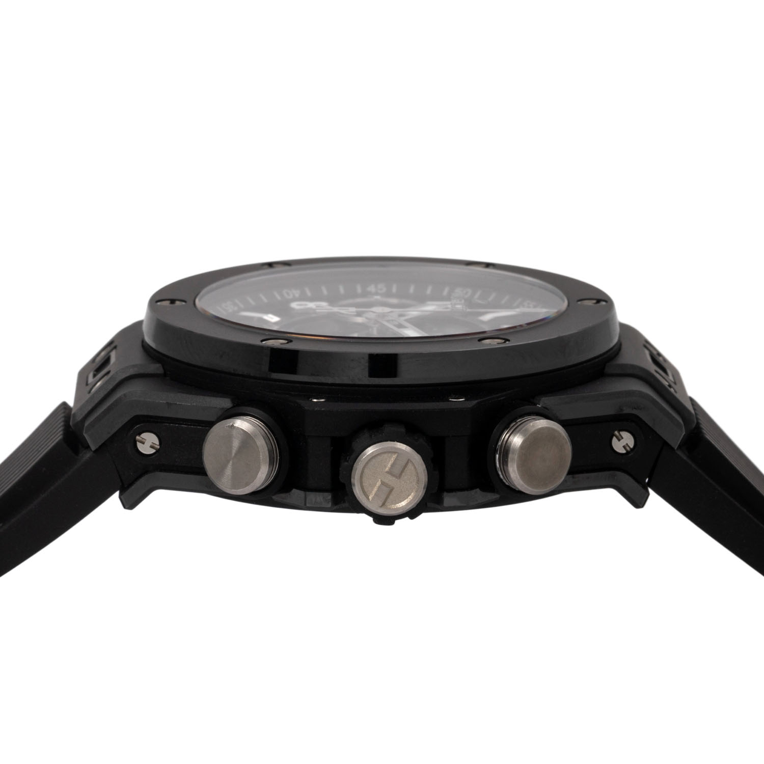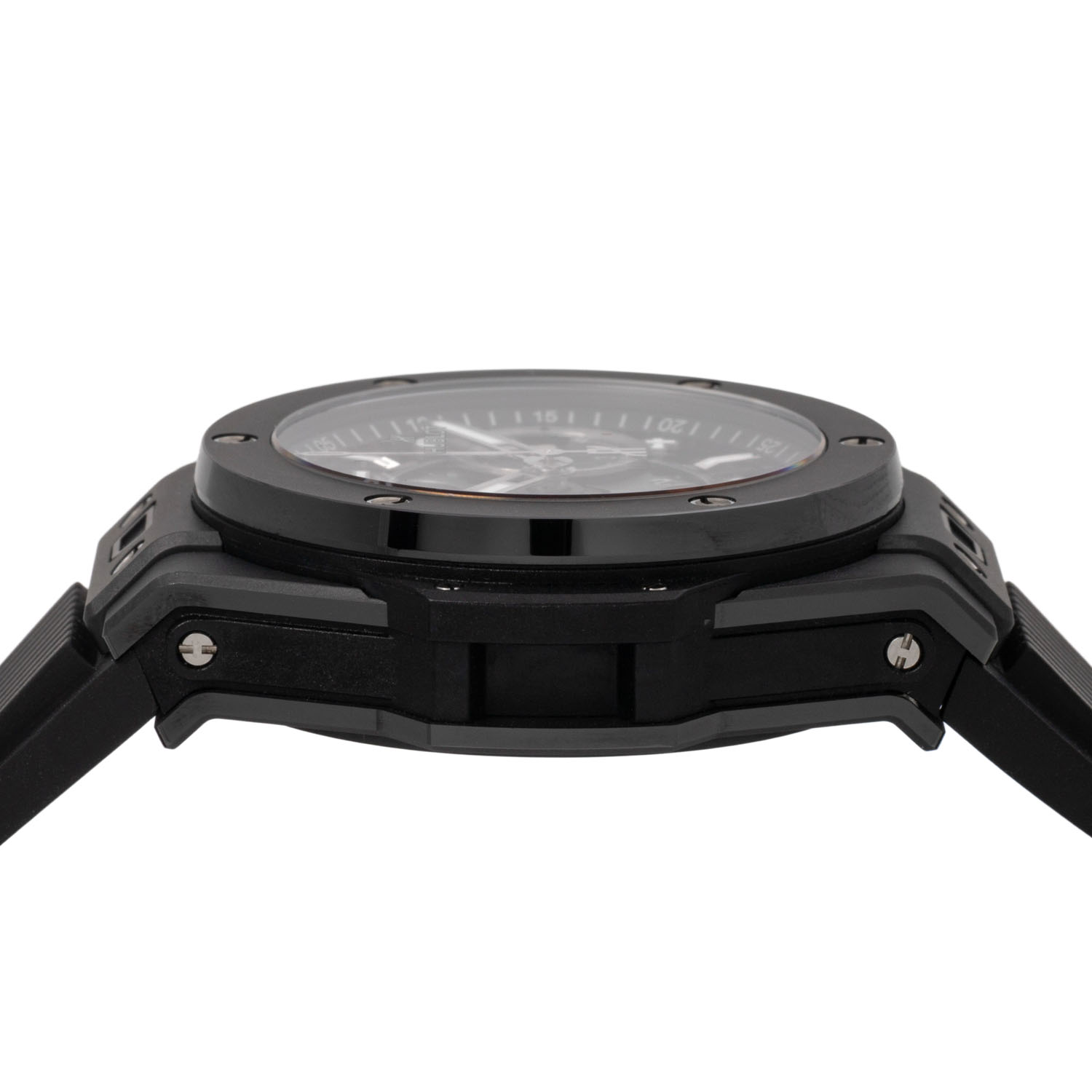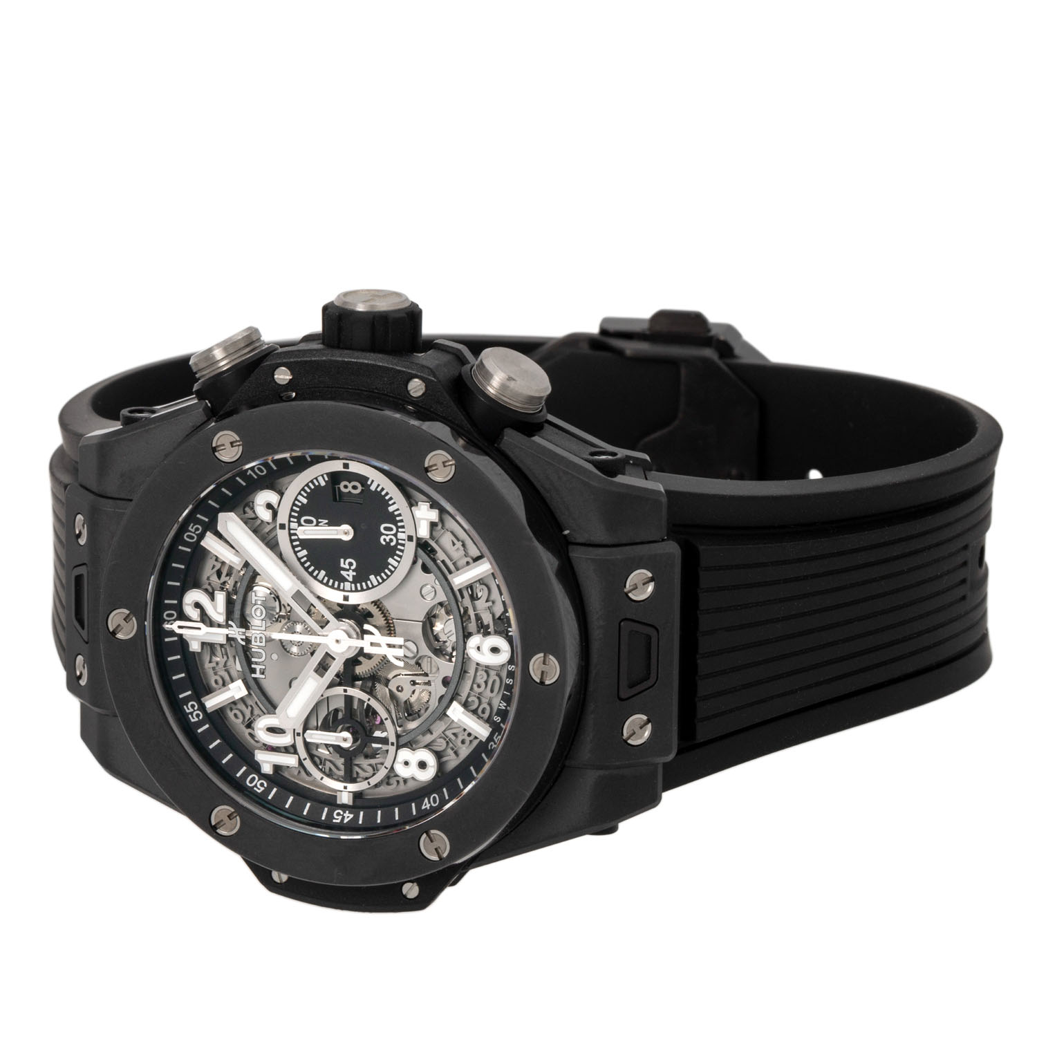 Keramik. Glasboden. Automatik-Werk Kal. HUB 1280 mit Flyback Funktion und sehr guten Gangwerten (+7 s/d. 312° Amplitude). Skelettiertes Zifferblatt mit aufgesetzten arabischen Ziffern, 2 Totalisatoren, kleiner Sekunde und Datumsanzeige. Hublot Kautschuk Armband mit Faltschließe aus Keramik und Titan. Guter Zustand mit leichten Tragespuren. Original Box, Erstkaufrechnung und Garantieschein anbei. Gekauft im Juni 2022 bei Juwelier Wempe in Stuttgart. Durchmesser ca. 42 mm (gemessen ohne Krone). Passend bis zu ca. 20 cm Handgelenkumfang.